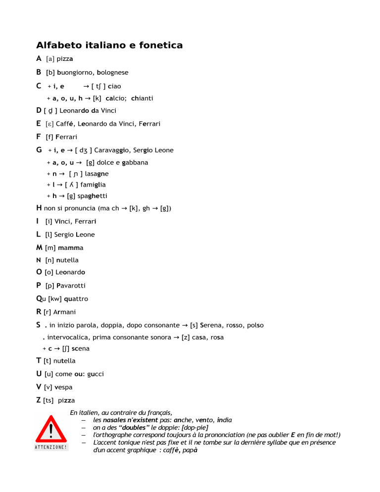 Alfabeto italiano e fonetica A [a] pizza B [b] buongiorno, bolognese C + i, e → [ tʃ ] ciao + a, o, u, h → [k] calcio; chianti D [ d̪ ] Leonardo da Vinci E [ε] Caffé, Leonardo da Vinci, Ferrari F [f] Ferrari G + i, e → [ dʒ ] Caravaggio, Sergio Leone + a, o, u → [g] dolce e gabbana + n → [ ɲ ] lasagne + l → [ ʎ ] famiglia + h → [g] spaghetti H non si pronuncia (ma ch → [k], gh → [g]) I [i] Vinci, Ferrari L [l] Sergio Leone M [m] mamma N [n] nutella O [o] Leonardo P [p] Pavarotti Qu [kw] quattro R [r] Armani S . in inizio parola, doppia, dopo consonante → [s] Serena, rosso, polso . intervocalica, prima consonante sonora → [z] casa, rosa + c → [ʃ] scena T [t] nutella U [u] come ou: gucci V [v] vespa Z [ts] pizza En italien, au contraire du français, – les nasales n'existent pas: anche, vento, india – on a des “doubles” le doppie: [dop-pie] – l'orthographe correspond toujours à la prononciation (ne pas oublier E en fin de mot!) – L'accent tonique n'est pas fixe et il ne tombe sur la dernière syllabe que en présence d'un accent graphique : caffè, papà