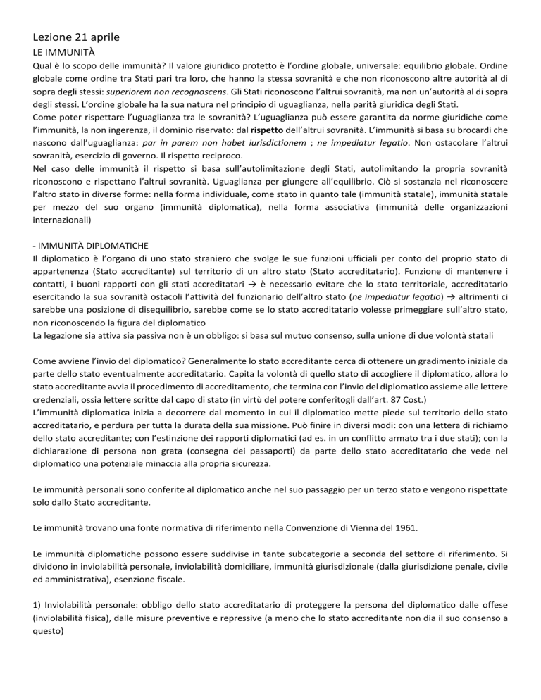 Lezione 21 aprile LE IMMUNITÀ Qual è lo scopo delle immunità? Il valore giuridico protetto è l’ordine globale, universale: equilibrio globale. Ordine globale come ordine tra Stati pari tra loro, che hanno la stessa sovranità e che non riconoscono altre autorità al di sopra degli stessi: superiorem non recognoscens. Gli Stati riconoscono l’altrui sovranità, ma non un’autorità al di sopra degli stessi. L’ordine globale ha la sua natura nel principio di uguaglianza, nella parità giuridica degli Stati. Come poter rispettare l’uguaglianza tra le sovranità? L’uguaglianza può essere garantita da norme giuridiche come l’immunità, la non ingerenza, il dominio riservato: dal rispetto dell’altrui sovranità. L’immunità si basa su brocardi che nascono dall’uguaglianza: par in parem non habet iurisdictionem ; ne impediatur legatio. Non ostacolare l’altrui sovranità, esercizio di governo. Il rispetto reciproco. Nel caso delle immunità il rispetto si basa sull’autolimitazione degli Stati, autolimitando la propria sovranità riconoscono e rispettano l’altrui sovranità. Uguaglianza per giungere all’equilibrio. Ciò si sostanzia nel riconoscere l’altro stato in diverse forme: nella forma individuale, come stato in quanto tale (immunità statale), immunità statale per mezzo del suo organo (immunità diplomatica), nella forma associativa (immunità delle organizzazioni internazionali) - IMMUNITÀ DIPLOMATICHE Il diplomatico è l’organo di uno stato straniero che svolge le sue funzioni ufficiali per conto del proprio stato di appartenenza (Stato accreditante) sul territorio di un altro stato (Stato accreditatario). Funzione di mantenere i contatti, i buoni rapporti con gli stati accreditatari → è necessario evitare che lo stato territoriale, accreditatario esercitando la sua sovranità ostacoli l’attività del funzionario dell’altro stato (ne impediatur legatio) → altrimenti ci sarebbe una posizione di disequilibrio, sarebbe come se lo stato accreditatario volesse primeggiare sull’altro stato, non riconoscendo la figura del diplomatico La legazione sia attiva sia passiva non è un obbligo: si basa sul mutuo consenso, sulla unione di due volontà statali Come avviene l’invio del diplomatico? Generalmente lo stato accreditante cerca di ottenere un gradimento iniziale da parte dello stato eventualmente accreditatario. Capita la volontà di quello stato di accogliere il diplomatico, allora lo stato accreditante avvia il procedimento di accreditamento, che termina con l’invio del diplomatico assieme alle lettere credenziali, ossia lettere scritte dal capo di stato (in virtù del potere conferitogli dall’art. 87 Cost.) L’immunità diplomatica inizia a decorrere dal momento in cui il diplomatico mette piede sul territorio dello stato accreditatario, e perdura per tutta la durata della sua missione. Può finire in diversi modi: con una lettera di richiamo dello stato accreditante; con l’estinzione dei rapporti diplomatici (ad es. in un conflitto armato tra i due stati); con la dichiarazione di persona non grata (consegna dei passaporti) da parte dello stato accreditatario che vede nel diplomatico una potenziale minaccia alla propria sicurezza. Le immunità personali sono conferite al diplomatico anche nel suo passaggio per un terzo stato e vengono rispettate solo dallo Stato accreditante. Le immunità trovano una fonte normativa di riferimento nella Convenzione di Vienna del 1961. Le immunità diplomatiche possono essere suddivise in tante subcategorie a seconda del settore di riferimento. Si dividono in inviolabilità personale, inviolabilità domiciliare, immunità giurisdizionale (dalla giurisdizione penale, civile ed amministrativa), esenzione fiscale. 1) Inviolabilità personale: obbligo dello stato accreditatario di proteggere la persona del diplomatico dalle offese (inviolabilità fisica), dalle misure preventive e repressive (a meno che lo stato accreditante non dia il suo consenso a questo) 2) Inviolabilità domiciliare: riguarda il domicilio del diplomatico, è sia l’abitazione riservata dello stesso sia la sede della missione diplomatica, ma anche l’auto e la valigetta del diplomatico Vi è un caso del 2016, posto all’attenzione della Corte internazionale di giustizia, che riguardava un’operazione di polizia francese nei confronti del figlio del Capo di Stato della Guinea accusato di riciclaggio e corruzione: l’autorità francese lo arrestò sequestrando alcuni documenti rinvenuti nell’auto del Capo di Stato e nella sede della missione diplomatica. La sede diplomatica era considerata territorio dello Stato accreditante, e non dello Stato accreditatario; questo principio di extraterritorialità è oggi venuto meno poiché la sede diplomatica è territorio dello Stato accreditatario anche se questi limita qui la sua sovranità, dal momento che nella sede diplomatica non tutte le attività possono essere eseguite da questi come ad esempio le misure repressive o coercitive. 3) Immunità dalla giurisdizione civile, penale e amministrativa: si può dividere in due sottocategorie: immunità funzionale, ratione materiae e immunità personale, ratione personae. La distinzione è legata agli atti compiuti dal diplomatico: se sono atti compiuti in qualità di organo di stato, allora si parlerà di immunità funzionale. Qualora invece gli atti oggetto di un eventuale controversia siano stati posti in essere dal diplomatico in qualità di privato cittadino allora si parlerà di immunità personale. Immunità funzionale: immunità dalla legge, che riguarda gli atti ufficiali compiuti dal diplomatico nell’esercizio e per l’esercizio delle sue funzioni tipiche. C’è quest’immunità così estesa, pregnante perché in quel caso il diplomatico agisce come organo distato, non come cittadino qualsiasi straniero, come organo rappresentativo di un’atra sovranità riconosciuta dallo stato accreditatario. Sono atti che possono essere imput