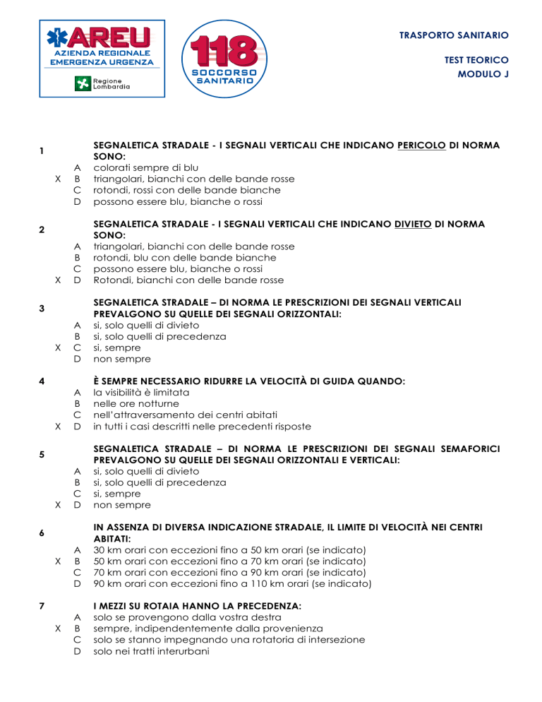 TRASPORTO SANITARIO TEST TEORICO MODULO J A B C D SEGNALETICA STRADALE - I SEGNALI VERTICALI CHE INDICANO PERICOLO DI NORMA SONO: colorati sempre di blu triangolari, bianchi con delle bande rosse rotondi, rossi con delle bande bianche possono essere blu, bianche o rossi A B C D SEGNALETICA STRADALE - I SEGNALI VERTICALI CHE INDICANO DIVIETO DI NORMA SONO: triangolari, bianchi con delle bande rosse rotondi, blu con delle bande bianche possono essere blu, bianche o rossi Rotondi, bianchi con delle bande rosse A B C D SEGNALETICA STRADALE – DI NORMA LE PRESCRIZIONI DEI SEGNALI VERTICALI PREVALGONO SU QUELLE DEI SEGNALI ORIZZONTALI: si, solo quelli di divieto si, solo quelli di precedenza si, sempre non sempre A B C D È SEMPRE NECESSARIO RIDURRE LA VELOCITÀ DI GUIDA QUANDO: la visibilità è limitata nelle ore notturne nell’attraversamento dei centri abitati in tutti i casi descritti nelle precedenti risposte A B C D SEGNALETICA STRADALE – DI NORMA LE PRESCRIZIONI DEI SEGNALI SEMAFORICI PREVALGONO SU QUELLE DEI SEGNALI ORIZZONTALI E VERTICALI: si, solo quelli di divieto si, solo quelli di precedenza si, sempre non sempre A B C D IN ASSENZA DI DIVERSA INDICAZIONE STRADALE, IL LIMITE DI VELOCITÀ NEI CENTRI ABITATI: 30 km orari con eccezioni fino a 50 km orari (se indicato) 50 km orari con eccezioni fino a 70 km orari (se indicato) 70 km orari con eccezioni fino a 90 km orari (se indicato) 90 km orari con eccezioni fino a 110 km orari (se indicato) A B C D I MEZZI SU ROTAIA HANNO LA PRECEDENZA: solo se provengono dalla vostra destra sempre, indipendentemente dalla provenienza solo se stanno impegnando una rotatoria di intersezione solo nei tratti interurbani 1 X 2 X 3 X 4 X 5 X 6 X 7 X TRASPORTO SANITARIO TEST TEORICO MODULO J 8 X A B C D 9 A X B C D 10 X A B C D 11 A X B C D 12 X A B C D IL MANCATO RISPETTO DELLA PRECEDENZA STRADALE è disciplinato dal Codice Penale è soggetto a pesanti sanzioni fino alla sospensione della patente comporta solo la riduzione dei punti della patente non è applicabile per i conducenti dei mezzi sanitari IL SORPASSO: può essere effettuato solo a sinistra può essere effettuato a destra quando il conducente del veicolo che si vuole sorpassare ha segnalato l’intenzione di svoltare a sinistra e ha già iniziato la manovra può essere effettuato anche a destra solo in vicinanza di un segnale verticale di “stop” quando le auto sono ferme può essere effettuato in curva solo se la segnaletica orizzontale indica una linea continua sull’asse che separa le due carreggiate È FATTO DIVIETO ASSOLUTO DI FERMATA: nelle gallerie e nei sottovia dei sovrapassaggi sui dossi e in curva sui passaggi e attraversamenti pedonali e ciclisti in tutte le situazioni descritte nelle precedenti risposte L’USO DEL DISPOSITIVO ACUSTICO SUPPLEMENTARE DI ALLARME E DEL DISPOSITIVO SUPPLEMENTARE DI SEGNALAZIONE VISIVA A LUCE LAMPEGGIANTE BLU: è disciplinato dal Codice Penale è consentito ai conducenti delle ambulanze solo per l’espletamento di servizi urgenti d’istituto è tassativamente vietato ai conducenti dei veicoli adibiti al trasporto di plasma ed organi È vietato ai conducenti dei mezzi adibiti al trasporto sanitario semplice LA MODALITÀ DI GUIDA RISPETTO ALLE CONDIZIONI DEI TRASPORTATI: possono alterare le condizioni dei soggetti afflitti da problematiche croniche o critiche non altera in nessun modo le condizioni del paziente trasportato compromettono sempre le condizioni dei pazienti critici l’importante è prestare attenzione in caso di trasporto di persone con fratture ossee