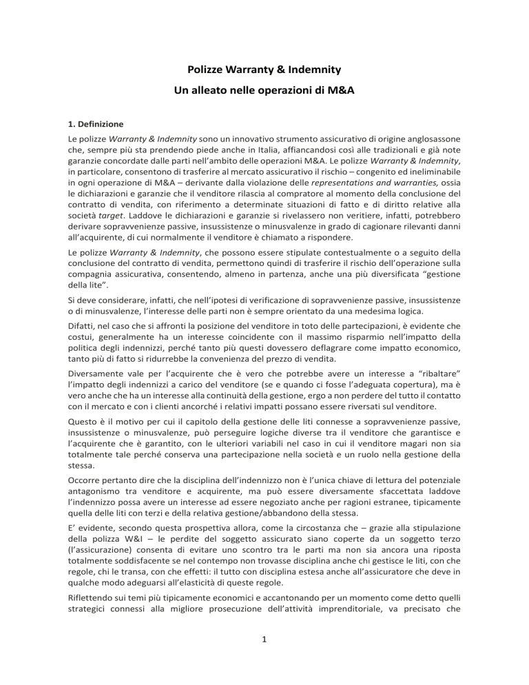 Polizze Warranty & Indemnity Un alleato nelle operazioni di M&A 1. Definizione Le polizze Warranty & Indemnity sono un innovativo strumento assicurativo di origine anglosassone che, sempre più sta prendendo piede anche in Italia, affiancandosi così alle tradizionali e già note garanzie concordate dalle parti nell’ambito delle operazioni M&A. Le polizze Warranty & Indemnity, in particolare, consentono di trasferire al mercato assicurativo il rischio – congenito ed ineliminabile in ogni operazione di M&A – derivante dalla violazione delle representations and warranties, ossia le dichiarazioni e garanzie che il venditore rilascia al compratore al momento della conclusione del contratto di vendita, con riferimento a determinate situazioni di fatto e di diritto relative alla società target. Laddove le dichiarazioni e garanzie si rivelassero non veritiere, infatti, potrebbero derivare sopravvenienze passive, insussistenze o minusvalenze in grado di cagionare rilevanti danni all’acquirente, di cui normalmente il venditore è chiamato a rispondere. Le polizze Warranty & Indemnity, che possono essere stipulate contestualmente o a seguito della conclusione del contratto di vendita, permettono quindi di trasferire il rischio dell’operazione sulla compagnia assicurativa, consentendo, almeno in partenza, anche una più diversificata “gestione della lite”. Si deve considerare, infatti, che nell’ipotesi di verificazione di sopravvenienze passive, insussistenze o di minusvalenze, l’interesse delle parti non è sempre orientato da una medesima logica. Difatti, nel caso che si affronti la posizione del venditore in toto delle partecipazioni, è evidente che costui, generalmente ha un interesse coincidente con il massimo risparmio nell’impatto della politica degli indennizzi, perché tanto più questi dovessero deflagrare come impatto economico, tanto più di fatto si ridurrebbe la convenienza del prezzo di vendita. Diversamente vale per l’acquirente che è vero che potrebbe avere un interesse a “ribaltare” l’impatto degli indennizzi a carico del venditore (se e quando ci fosse l’adeguata copertura), ma è vero anche che ha un interesse alla continuità della gestione, ergo a non perdere del tutto il contatto con il mercato e con i clienti ancorché i relativi impatti possano essere riversati sul venditore. Questo è il motivo per cui il capitolo della gestione delle liti connesse a sopravvenienze passive, insussistenze o minusvalenze, può perseguire logiche diverse tra il venditore che garantisce e l’acquirente che è garantito, con le ulteriori variabili nel caso in cui il venditore magari non sia totalmente tale perché conserva una partecipazione nella società e un ruolo nella gestione della stessa. Occorre pertanto dire che la disciplina dell’indennizzo non è l’unica chiave di lettura del potenziale antagonismo tra venditore e acquirente, ma può essere diversamente sfaccettata laddove l’indennizzo possa avere un interesse ad essere negoziato anche per ragioni estranee, tipicamente quella delle liti con terzi e della relativa gestione/abbandono della stessa. E’ evidente, secondo questa prospettiva allora, come la circostanza che – grazie alla stipulazione della polizza W&I – le perdite del soggetto assicurato siano coperte da un soggetto terzo (l’assicurazione) consenta di evitare uno scontro tra le parti ma non sia ancora una riposta totalmente soddisfacente se nel contempo non trovasse disciplina anche chi gestisce le liti, con che regole, chi le transa, con che effetti: il tutto con disciplina estesa anche all’assicuratore che deve in qualche modo adeguarsi all’elasticità di queste regole. Riflettendo sui temi più tipicamente economici e accantonando per un momento come detto quelli strategici connessi alla migliore prosecuzione dell’attività imprenditoriale, va precisato che 1 comunque l’alleggerimento del rischio che deriva dalle polizze warranty & indemnity si riflette sicuramente in termini positivi sugli aspetti economici dell’operazione. Questo alleggerimento del rischio, peraltro, si riflette positivamente anche sugli aspetti economici dell’operazione: a mero titolo esemplificativo, infatti, si può pensare che – salvo ovviamente il pagamento del premio assicurativo – la polizza W&I consente di non dover vincolare ingenti somme a garanzia delle perdite conseguenti alla non veridicità delle dichiarazioni o garanzie (come invece avviene con il cd. escrow agreement), garantendo così una maggiore liquidità. Nello stesso senso la polizza, a differenza di una tradizionale garanzia bancaria (p.e. la fideiussione) non riduce la capacità di ricorrere al credito presso istituti bancari. 2. Vantaggi I potenziali vantaggi che derivano – nelle complesse dinamiche e sottili equilibri di un’operazione societaria straordinaria – dalla stipula di una polizza W&I, variano sensibilmente anche in ragione del soggetto assicurato: Vantaggi per il compratore Vantaggi per il venditore Permette di incrementare il limite e/o la durata A differenza di altri tipi di garanzie delle garanzie contrattuali ottenute in sede di (contrattuali, escrow o fideiussioni) per le quali le perdite rimarrebbero a carico del negoziazione. venditore in aggiunta al costo della garanzia, la polizza W&I permette il pieno trasferimento all’assicuratore delle responsabilità assunte all’interno dello SPA. Differenzia l’offerta in un processo a base d’asta e facilita il mantenimento dei buoni rapporti tra le parti nel caso di una partnership successiva all’investimento. Garantisce una maggiore libertà di distribuire il ricavato della vendita agli azionisti, evitando significativi rischi postclosing, offrendo l’opportunità di una clean-exit ai fondi di investimento potenzialmente coinvolti nell’operazione. Facilita il meccanismo di indennizzo attraverso la creazione di un rapporto diretto tra compratore e assicuratore in caso di sinistro e facilit