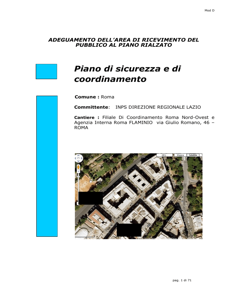 Mod D ADEGUAMENTO DELL’AREA DI RICEVIMENTO DEL PUBBLICO AL PIANO RIALZATO Piano di sicurezza e di coordinamento Comune : Roma Committente: INPS DIREZIONE REGIONALE LAZIO Cantiere : Filiale Di Coordinamento Roma Nord-Ovest e Agenzia Interna Roma FLAMINIO via Giulio Romano, 46 – ROMA Lgt.Thaon De Revel Via G. Romano pag. 1 di 71 Premessa I lavori relativi al presente piano di sicurezza consistono nell’Adeguamento dell’area di ricevimento dell’utenza esterna nell’ ottica di ridefinizione del servizio di front line della sede INPS sita in Roma, via Giulio Romano,46 Il Piano di sicurezza e Coordinamento è necessario perché l'entità dei lavori supera i 200 uomini/giorno, ed è affiancato dal Fascicolo dell’Opera. Il Piano è parte integrante dell’appalto in oggetto, ed in quanto tale viene trasmesso alle imprese invitate a presentare offerta unitamente agli atti di gara, in forma cartacea e/o in formato elettronico. Il presente PSC viene strutturato sulla base delle indicazioni delle norme che regolamentano tale materia ovvero: D. Lgs. 81/08 e s.m.i. (art. 100 comma 1) In tale comma al primo paragrafo sono descritti i requisiti prestazionali del PSC ovvero: "… l'individuazione, l'analisi e la valutazione dei rischi e le conseguenti procedure …" e "… la stima dei relativi costi …" inoltre sono richieste le misure derivanti dalla "… presenza simultanea o successiva di più imprese …". Al paragrafo successivo vengono definiti quali aspetti tecnici ed organizzativo/procedurali devono essere affrontati con l'elencazione di 18 requisiti specifici per i quali si rimanda al testo del decreto precisando che dovranno essere presi in considerazione solo quelli prettamente riguardanti l'opera in esame. Allegato XV D. Lgs. 81/08 (art. 2) - evidenzia i contenuti minimi del PSC ovvero principalmente l'identificazione dell'opera e dei soggetti coinvolti, la valutazione dei rischi, le scelte procedurali ed organizzative con le conseguenti misure specifiche, le misure preventive e quanto relativo alle interferenze, alle misure di coordinamento, alla gestione delle emergenze, alla durata delle fasi di lavoro, alla stima dell'entità dei lavori (uomini giorno) ed infine alla stima dei costi della sicurezza. - richiede l'analisi dell'area di cantiere con riferimento ai rischi collegati, la definizione dell'organizzazione spaziale mediante l'individuazione delle aree funzionali, l'esame dei lavori con la suddivisione in fasi e sottofasi. - prevede l'analisi delle interferenze fra le fasi di lavoro. (art. 4) - individua come deve essere fatta la stima dei costi della sicurezza; D.P.R. 207/11 (art. 39) Tale articolo definisce, per il PSC, prevalentemente requisiti di tipo prestazionale come quelli organizzativi delle lavorazioni e valutativi dei rischi derivanti dalle sovrapposizioni delle fasi di lavoro oltre ad un disciplinare dedicato al rispetto delle norme. 1 Anagrafica del cantiere Cantiere: FILIALE DI COORDINAMENTO ROMA NORD-OVEST AGENZIA ROMA FLAMINIO Indirizzo : via Giulio Romano, 46 - ROMA LAVORI IMPORTO LAVORI IMPORTO INIZIO/ n° max DURATA ONERI FINE OPERAI TOTALE SICUREZZA PRESUNTI IN LAVORI DEI LAVORI CANTIERE Adeguamento area pubblico € 239.659,60 € 8.013,85 1/06/12 30/12/12 8 180 gg Pag. 2 di 71 LEGENDA Le abbreviazioni utilizzate nel presente documento ed in quelli collegati od allegati sono le seguenti: CSA CAPITOLATO SPECIALE D’APPALTO CSP COORDINATORE DELLA SICUREZZA IN FASE DI PROGETTAZIONE CSE COORDINATORE DELLA SICUREZZA IN FASE DI ESECUZIONE DTC DIRETTORE TECNICO DEL CANTIERE PER CONTO DELL'IMPRESA DL DIRETTORE DEI LAVORI PER CONTO DEL COMMITTENTE MC MEDICO COMPETENTE RSPP RESPONSABILE DEL SERVIZIO DI PREVENZIONE E PROTEZIONE RLS RAPPRESENTANTE DEI LAVORATORI PER LA SICUREZZA PSC PIANO DI SICUREZZA E COORDINAMENTO POS PIANO OPERATIVO DI SICUREZZA DVR DOCUMENTO DI VALUTAZIONE DEI RISCHI 2.1 Caratteristiche dell'opera 2.1.1 Caratteristiche del sito e dell’edificio L’Agenzia INPS Roma Flaminio, sede anche della Filiale di Coordinamento Roma Nord-Ovest, oltre che di alcuni uffici della Direzione Regionale, si trova nel Comune di Roma e precisamente alla via Giulio Romano,46 ; l’edificio a forma di L occupa parte di un lotto fra via Giulio Romano, lgt. Thaon de Revel e la privata via A. Sacchi. Nelle lavorazioni non vengono interessate infrastrutture di sottosuolo. Non interferiscono con le lavorazioni neanche infrastrutture aeree quali linee elettriche, linee telefoniche, impianti di trasmissione telefonia cellulare, in quanto le opere si svolgono tutte all’interno del piano rialzato. Prescrizione primaria è il divieto assoluto di qualsiasi interferenza con altre lavorazioni non previste nel presente appalto. 2.1.2 Descrizione della struttura dell’edificio L’edificio ha struttura portante realizzata con travi e pilastri di cemento armato e tamponatura perimetrale in muratura a cassetta e finestre ai piani, l’edificio è servito da tre corpi scala. 2. 2 Natura dei lavori - Obiettivi Gli interventi consistono nella demolizione e ricostruzione di partizioni fisse, compresa l’apertura di varchi murari, la sostituzione delle finiture; la costruzione di 2 bagni; l’installazione dell’impianto di climatizzazione nelle zone di accoglienza; l’adeguamento dell’impianto elettrico e il cablaggio strutturato degli sportelli; tinteggiature e rifiniture generali, oltre che fornitura e posa in opera di pareti mobili e attrezzate. Tutto ciò comporta l’allestimento di successivi cantieri e/o fasi di lavoro. Il piano oggetto d’intervento è interessato dalla presenza quotidiana e massiccia di pubblico, oltre che degli impiegati agli sportelli, per cui sarà necessario separare i sottocantieri fra di loro e dal resto dell’edificio. Pag. 3 di 71 L’accesso degli operai e dei mezzi di cantiere può avvenire solo da via G. Romano, attraverso un passo carrabile. L’eventuale tiro in alto e il calo in basso dei materiali potrà avvenire tramite ascensor