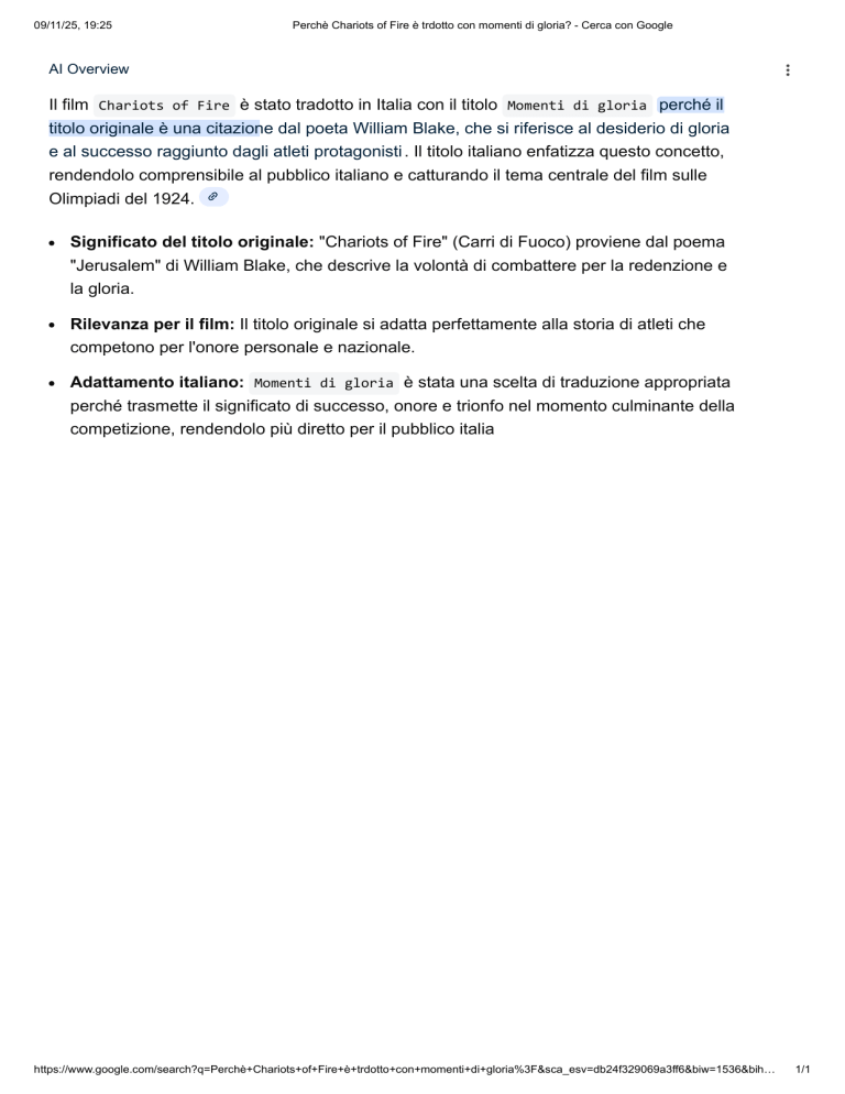 09/11/25, 19:25 Perchè Chariots of Fire è trdotto con momenti di gloria? - Cerca con Google AI Overview Il film Chariots of Fire è stato tradotto in Italia con il titolo Momenti di gloria perché il titolo originale è una citazione dal poeta William Blake, che si riferisce al desiderio di gloria e al successo raggiunto dagli atleti protagonisti . Il titolo italiano enfatizza questo concetto, rendendolo comprensibile al pubblico italiano e catturando il tema centrale del film sulle Olimpiadi del 1924. Significato del titolo originale: "Chariots of Fire" (Carri di Fuoco) proviene dal poema "Jerusalem" di William Blake, che descrive la volontà di combattere per la redenzione e la gloria. Rilevanza per il film: Il titolo originale si adatta perfettamente alla storia di atleti che competono per l'onore personale e nazionale. Adattamento italiano: Momenti di gloria è stata una scelta di traduzione appropriata perché trasmette il significato di successo, onore e trionfo nel momento culminante della competizione, rendendolo più diretto per il pubblico italia https://www.google.com/search?q=Perchè+Chariots+of+Fire+è+trdotto+con+momenti+di+gloria%3F&sca_esv=db24f329069a3ff6&biw=1536&bih… 1/1
