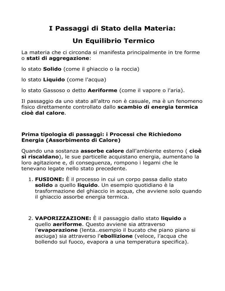 I Passaggi di Stato della Materia: Un Equilibrio Termico La materia che ci circonda si manifesta principalmente in tre forme o stati di aggregazione: lo stato Solido (come il ghiaccio o la roccia) lo stato Liquido (come l'acqua) lo stato Gassoso o detto Aeriforme (come il vapore o l'aria). Il passaggio da uno stato all'altro non è casuale, ma è un fenomeno fisico direttamente controllato dallo scambio di energia termica cioè dal calore. Prima tipologia di passaggi: i Processi che Richiedono Energia (Assorbimento di Calore) Quando una sostanza assorbe calore dall'ambiente esterno ( cioè si riscaldano), le sue particelle acquistano energia, aumentano la loro agitazione e, di conseguenza, rompono i legami che le tenevano legate nello stato precedente. 1. FUSIONE: È il processo in cui un corpo passa dallo stato solido a quello liquido. Un esempio quotidiano è la trasformazione del ghiaccio in acqua, che avviene solo quando il ghiaccio assorbe energia termica. 2. VAPORIZZAZIONE: È il passaggio dallo stato liquido a quello aeriforme. Questo avviene sia attraverso l'evaporazione (lenta..esempio il bucato che piano piano si asciuga) sia attraverso l'ebollizione (veloce, l’acqua che bollendo sul fuoco, evapora a una temperatura specifica). 3. SUBLIMAZIONE: È il passaggio diretto e meno comune dallo stato solido allo stato gassoso, saltando completamente la fase liquida (ad esempio, il ghiaccio secco usato nello sport). Seconda tipologia di passaggi: Processi che Rilasciano Energia (Cessione di Calore) Viceversa, quando una sostanza cede calore all'ambiente (cioè si raffredda) le sue particelle perdono energia e rallentano. Ciò permette alle forze di attrazione di prevalere, riorganizzando la materia in uno stato più compatto. 1. SOLIDIFICAZIONE: È il processo per cui una sostanza passa dallo stato liquido a quello solido. Questo accade quando l'acqua viene messa nel congelatore e cede calore, formando il ghiaccio. 2. CONDENSAZIONE: È il passaggio dallo stato aeriforme (cioè gassoso) a quello liquido. Ne è un esempio classico la formazione delle goccioline d'acqua sulle superfici fredde o la formazione delle nuvole: il vapore acqueo nell'aria cede calore e torna liquido. 3. BRINAMENTO: È il passaggio diretto dallo stato aeriforme a quello solido, saltando la fase liquida. Si osserva tipicamente con la formazione della brina sul terreno nelle notti molto fredde e umide.