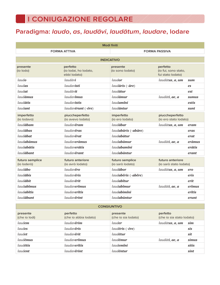 I CONIUGAZIONE REGOLARE Paradigma: laudo, as, laudāvi, laudātum, laudare, lodare Modi finiti FORMA ATTIVA FORMA PASSIVA INDICATIVO presente (io lodo) perfetto (io lodai, ho lodato, ebbi lodato) presente (io sono lodato) perfetto (io fui, sono stato, fui stato lodato) laudo laudāvi laudor laudātus, a, um laudas laudavīsti laudāris (-āre) es laudat laudāvit laudātur est laudāmus laudavĭmus laudāmur laudātis laudavīstis laudamĭni estis laudant laudavērunt (-ēre) laudāntur sunt imperfetto (io lodavo) piuccheperfetto (io avevo lodato) imperfetto (io ero lodato) piuccheperfetto (io ero stato lodato) laudābam laudavĕram laudābar laudātus, a, um laudābas laudavĕras laudabāris (-abāre) eras laudābat laudavĕrat laudabātur erat laudabāmus laudaverāmus laudabāmur laudabātis laudaverātis laudabamĭni erātis laudābant laudavĕrant laudabāntur erant futuro semplice (io loderò) futuro anteriore (io avrò lodato) futuro semplice (io sarò lodato) futuro anteriore (io sarò stato lodato) laudābo laudavĕro laudābor laudātus, a, um laudābis laudavĕris laudabĕris (-abĕre) eris laudābit laudavĕrit laudabĭtur erit laudabĭmus laudaverĭmus laudabĭmur laudabĭtis laudaverĭtis laudabimĭni erĭtis laudābunt laudavĕrint laudabūntur erunt laudāti, ae, a laudāti, ae, a laudāti, ae, a sum sumus eram erāmus ero erĭmus CONGIUNTIVO presente (che io lodi) perfetto (che io abbia lodato) presente (che io sia lodato) perfetto (che io sia stato lodato) laudem laudavĕrim lauder laudātus, a, um laudes laudavĕris laudēris (-ēre) sis laudet laudavĕrit laudētur sit laudēmus laudaverĭmus laudēmur laudētis laudaverĭtis laudemĭni sitis laudent laudavĕrint laudēntur sint laudāti, ae, a sim simus Modi finiti FORMA ATTIVA FORMA PASSIVA imperfetto (che io lodassi, io loderei) piuccheperfetto (che io avessi lodato, io avrei lodato) imperfetto (che io fossi lodato, io sarei lodato) piuccheperfetto (che io fossi stato lodato, io sarei stato lodato) laudārem laudāres laudāret laudarēmus laudarētis laudārent laudavissem laudavisses laudavisset laudavissēmus laudavissētis laudavissent laudārer laudarēris (-arēre) laudarētur laudarēmur laudaremĭni laudarēntur laudātus, a, um laudāti, ae, a essem esses esset essēmus essētis essent IMPERATIVO (non usato) presente sing. 2a lauda loda! plur. 2a laudāte lodate! sing. 2a laudāto loderai! 3a (non usato) futuro laudāto loderà! a plur. 2 laudatōte loderete! 3a laudānto loderanno! Modi indefiniti (nomi verbali) FORMA ATTIVA FORMA PASSIVA INFINITO presente (lodare) perfetto (avere lodato) presente (essere lodato) perfetto (essere stato lodato) laudāre laudavisse laudāri laudātum, am, um laudātos, as, a futuro* esse futuro* laudatūrum, am, um laudatūros, as, a esse laudātum iri * Non si fornisce alcuna traduzione per l’infinito futuro, perché tale voce, oltre a non avere diretta corrispondenza in italiano, è usata solo all’interno di una proposizione infinita. PARTICIPIO presente (lodante, che loda, lodando) perfetto (lodato, che è stato lodato) laudans, āntis laudātus, a, um futuro (che loderà, che sta per lodare) laudatūrus, a, um GERUNDIO Genitivo laudandi di lodare Dativo laudando a lodare Accusativo (ad) laudandum a, per lodare Ablativo laudando col lodare GERUNDIVO laudandus, a, um che deve essere lodato SUPINO laudātum a, per lodare laudātu a lodarsi II CONIUGAZIONE REGOLARE Paradigma: monĕo, es, monui, monĭtum, ēre, ammonire Modi finiti FORMA ATTIVA FORMA PASSIVA INDICATIVO presente (io ammonisco) perfetto (io ammonii,ho ammonito, ebbi ammonito) presente (io sono ammonito) perfetto (io fui, sono stato, fui stato ammonito) moneo monui monĕor monĭtus, a, um mones monuīsti monēris (-ēre) es monet monuit monētur est monēmus monuĭmus monēmur monētis monuīstis monemĭni estis monent monuērunt (-ēre) monēntur sunt imperfetto (io ammonivo) piuccheperfetto (io avevo ammonito) imperfetto (io ero ammonito) piuccheperfetto (io ero stato ammonito) monēbam monuĕram monēbar monĭtus, a, um monēbas monuĕras monebāris (-ebāre) eras monēbat monuĕrat monebātur erat monebāmus monuerāmus monebāmur monebātis monuerātis monebamĭni erātis monēbant monuĕrant monebāntur erant futuro semplice (io ammonirò) futuro anteriore (io avrò ammonito) futuro semplice (io sarò ammonito) futuro anteriore (io sarò stato ammonito) monēbo monuĕro monēbor monĭtus, a, um monēbis monuĕris monebĕris (-ebĕre) eris monēbit monuĕrit monebĭtur erit monebĭmus monuerĭmus monebĭmur monebĭtis monuerĭtis monebimĭni erĭtis monēbunt monuĕrint monebūntur erunt monĭti, ae, a monĭti, ae, a monĭti, ae, a sum sumus eram erāmus ero erĭmus CONGIUNTIVO presente (che io ammonisca) perfetto (che io abbia ammonito) presente (che io sia ammonito) perfetto (che io sia stato ammonito) monĕam monuĕrim monĕar monĭtus, a, um monĕas monuĕris moneāris (-eāre) sis monĕat monuĕrit moneātur sit moneāmus monuerĭmus moneāmur moneātis monuerĭtis moneamĭni sitis monĕant monuĕrint moneāntur sint monĭti, ae, a sim simus Modi finiti FORMA ATTIVA FORMA PASSIVA CONGIUNTIVO imperfetto (che io ammonissi, io ammonirei) piuccheperfetto (che io avessi ammonito, io avrei ammonito) imperfetto (che io fossi ammonito, io sarei ammonito) piuccheperfetto (che io fossi stato ammonito, io sarei stato ammonito) monērem monēres monēret monerēmus monerētis monērent monuīssem monuīsses monuīsset monuissēmus monuissētis monuīssent monērer monerēris (-ērere) monerētur monerēmur moneremĭni monerēntur monĭtus, a, um essem esses esset essēmus essētis essent monĭti, ae, a IMPERATIVO presente (non usato) mone monēte a sing. 2 a plur. 2 ammonisci! ammonite! futuro monēto monēto monetōte monēnto sing. 2a 3a a plur. 2 3a ammonirai! ammonirà! (non usato) ammonirete! ammoniranno! Modi indefiniti (nomi verbali) FORMA ATTIVA FORMA PASSIVA INFINITO presente (ammonire) perfetto (ave