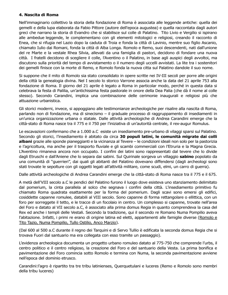 4. Nascita di Roma Nell'immaginario collettivo la storia della fondazione di Roma è associata alle leggende antiche: quella dei gemelli e della lupa elaborata da Fabio Pittore (autore dell'epoca augustea) e quella raccontata dagli autori greci che narrano la storia di Evandro che si stabilisce sul colle di Palatino. Tito Livio e Vergilio si ispirano alle ambedue leggende, le complementano con gli elementi mitologici e religiosi, creando il racconto di Enea, che si rifugia nel Lazio dopo la caduta di Troia e fonda la città di Lavinio, mentre suo figlio Ascanio, chiamato Iulio dai Romani, fonda la città di Alba Longa. Romolo e Remo, suoi descendenti, nati dall'unione del re Marte e la vestale Rhea Silvia, allevati da una famiglia di pastori, decidono di fondare una nuova città. I fratelli decidono di scegliere il colle, l'Aventino o il Palatino, in base agli auspici degli avvoltoi, ma discutono sulla priorità del tempo di avvistamento o il numero degli uccelli avvistati. La lite tra i sostenitori dei gemelli finisce con la morte di Remo, e Romolo fonda la nuova citta sul Palatino dandole il suo nome. Si suppone che il mito di Romolo sia stato consolidato in opere scritte nei IV-III secoli per porre alle origini della città la genealogia divina. Nel I secolo lo storico Varrone associa anche la data del 21 aprile 753 alla fondazione di Roma. Il giorno del 21 aprile è legato a Roma in particolar modo, perché in questa data si celebrava la festa di Palilia, un’antichissima festa pastorale in onore della Dea Palia (che dà il nome al colle stesso). Secondo Carandini, implica una combinazione delle cerimonie inaugurali e religiosi più che attuazione urbanistica. Gli storici moderni, invece, si appoggiano alle testimonianze archeologiche per risalire alla nascita di Roma, parlando non di fondazione, ma di sinecismo – il graduale processo di raggruppamento di insediamenti in un’unica organizzazione urbana o statale. Dalle attività archeologiche di Andrea Carandini emerge che la città-stato di Roma nasce tra il 775 e il 750 per l’iniziativa di un’autorità centrale, il rex-augur Romulus. Le escavazioni confermano che a 1.000 a.C esiste un insediamento pre-urbano di vilaggi sparsi sul Palatino. Secondo gli storici, l’insediamento è abitato da circa 30 populi latini, le comunità migrate dai colli albani grazie alle sponde pianeggianti e la vicinanza al Tevere – le condizioni ideali non solo per la pastorizia e l’agricoltura, ma anche per il trasporto fluviale e gli scambi commerciali con l’Etruria e la Magna Grecia. L’Aventino rimaneva ancora non occupato. I confini dei latini sono rappresentati dal tevere che lo divide dagli Etruschi e dall’Aniene che lo separa dai sabini. Sul Quirinale sorgeva un villaggio sabino popolato da una comunità di “guerrieri”, dai quali gli abitanti del Palatino dovevano diffendersi (dagli archeologi sono stati trovate le sepolture con gli oggetti legati all’attività militare, come scudi, elmi, un carro di guerra). Dalle attività archeologiche di Andrea Carandini emerge che la città-stato di Roma nasce tra il 775 e il 675. A metà dell’VIII secolo a.C le pendici del Palatino furono il luogo dove esisteva uno stanziamento delimitato dal pomerium, la cinta parallela al solco che segnava i confini della città. L’insediamento primitivo fu chiamato Roma quadrata esattamente per la forma del pomerium. Dagli scavi sono emersi gli edifici, cosiddette capanne romulee, databili al VIII secolo. Sono capanne di forma rettangolare o ellittica, con un foro per sorreggete il tetto, e le tracce di un focolaio in centro. Un complesso si capanne, trovate nell’area del Foro e datato al VII secolo a.C, è associato alla prima domus Regia in quanto comprendeva la casa del Rex ed anche i templi delle Vestali. Secondo la tradizione, qui il secondo re Romano Numa Pompilio aveva l’abitazione. Infatti, i primi re erano di origine latina ed eletti, appartenenti alle famiglie diverse (Romolo e Tito Tazio, Numa Pompilio, Tullo Ostilio, Anco Marzio). (Dal 600 al 500 a.C durante il regno dei Tarquini e di Servo Tullio è edificata la seconda domus Regia che si trovava Fuori dal santuario ma era collegata con esso tramite un passaggio). L’evidenza archeologica documenta un progetto urbano romuleo datato al 775-750 che comprende l’urbs, il centro politico e il centro religioso, la creazione del Foro e del santuario della Vesta. La prima bonifica e pavimentazione del Foro comincia sotto Romolo e termina con Numa, la seconda pavimentazione avviene nell’epoca del dominio etrusco. Carandini:l’agro è ripartito tra tre tribu latinienses, Querquetulani e luceres (Remo e Romolo sono membri della tribu luceres) 5. Romolo e i re latini-sabini Romolo 753-715 La prima impresa di Romolo è la costituzione della città sul palatino nel cuore del centro protourbano. Esattamente all’VIII secolo sono databili le capanne romulee sul Palatino. Di origini latino-sabine, figlio del dio Marte e di Rea Silvia, figlia di Numitore, re di Alba Longa, secondo la tradizione fondò Roma tracciandone il confine sacro , il pomerio. In tale occasione uccise il fratello gemello Remo, reo di aver varcato in armi il sacro confine. Le ricerche archeologiche confermano il racconto tradizionale. I cippi commemorativi dell’omicidio di remo sono stati trovati in prossimità dell’arco di Tito. A lui risale la divisione della popolazione patrizia nelle 3 tribù di Tities, Ramnes e Luceres – a loro volta suddivise in dieci curie ciascuna. L’agro è ripartito in tre cerchi, il centrale è abitato con i terreni appartenenti ai singoli cittadini, poi dal primo miglio ai confini i terreni appartengono alle gentes e sono lavorati dai clientes. Le curie dovevano in caso di pericolo fornire all'esercito romano un contingente militare costituito da cento fanti e dieci cavalieri, per un totale complessivo di 3 000 fanti e 300 cavalieri. Regna per 36 anni, Tito Livio racconta la morte