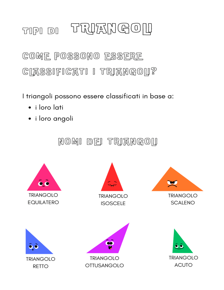TIPI DI COME TRIANGOLI POSSONO CLASSIFICATI I ESSERE TRIANGOLI? I triangoli possono essere classificati in base a: i loro lati i loro angoli NOMI TRIANGOLO EQUILATERO TRIANGOLO RETTO DEI TRIANGOLI TRIANGOLO ISOSCELE TRIANGOLO OTTUSANGOLO TRIANGOLO SCALENO TRIANGOLO ACUTO TRIANGOLO EQUILATERO Definizione: Tutti e tre i lati hanno la stessa lunghezza. Proprietà: tutti e tre gli angoli sono uguali e ogni angolo misura 60°. TRIANGOLO ISOSCELE Definizione: Due lati hanno la stessa lunghezza. Proprietà: Anche gli angoli opposti ai lati uguali sono uguali. TRIANGOLO SCALENO Definizione: Tutti e tre i lati hanno lunghezze diverse. Proprietà: Tutti e tre gli angoli sono diversi. TRIANGOLO RETTO Definizione: Uno degli angoli è esattamente 90°. Proprietà: Il lato opposto all'angolo retto è l'ipotenusa,il lato più lungo del triangolo. TRIANGOLO ACUTO Definizione: Tutti e tre gli angoli sono inferiori a 90°. Proprietà: il triangolo ha un angolo acuto e la somma degli angoli è ancora 180°. TRIANGOLO OTTUSO Definizione: Uno degli angoli è maggiore di 90°. Proprietà: Gli altri due angoli sono acuti (meno di 90°).