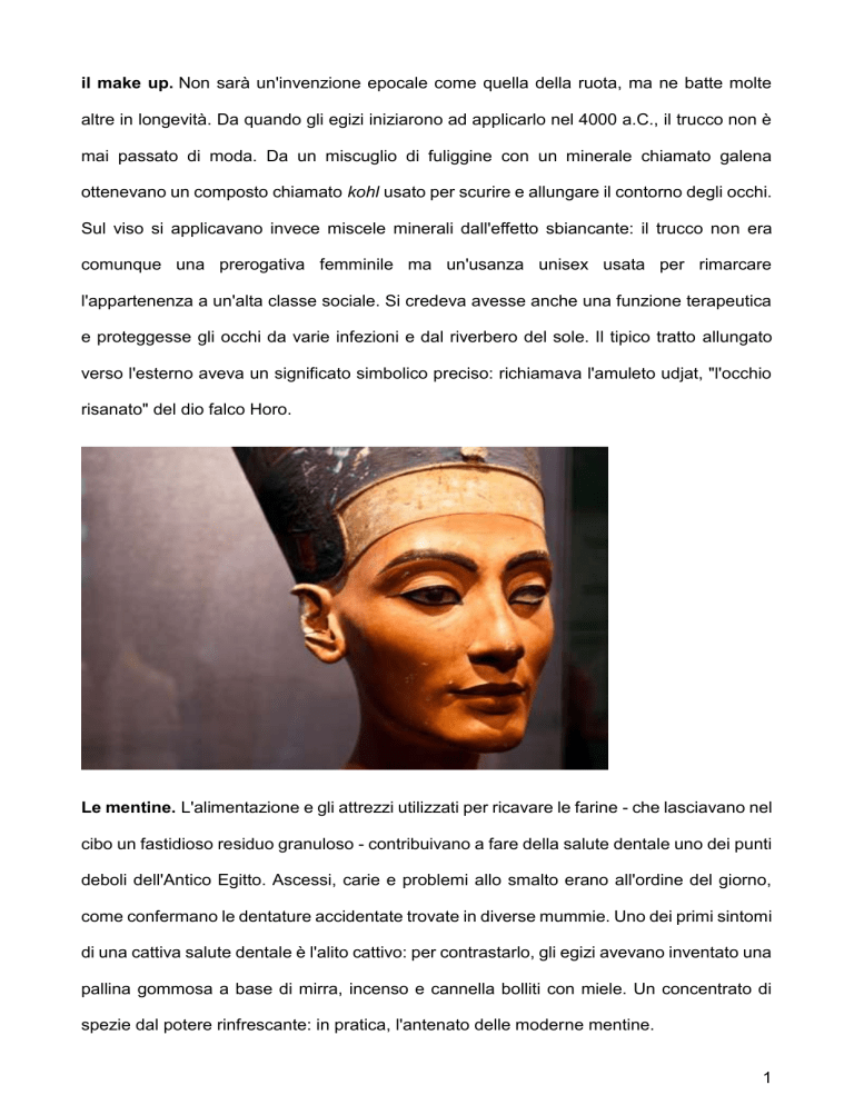 il make up. Non sarà un'invenzione epocale come quella della ruota, ma ne batte molte altre in longevità. Da quando gli egizi iniziarono ad applicarlo nel 4000 a.C., il trucco non è mai passato di moda. Da un miscuglio di fuliggine con un minerale chiamato galena ottenevano un composto chiamato kohl usato per scurire e allungare il contorno degli occhi. Sul viso si applicavano invece miscele minerali dall'effetto sbiancante: il trucco non era comunque una prerogativa femminile ma un'usanza unisex usata per rimarcare l'appartenenza a un'alta classe sociale. Si credeva avesse anche una funzione terapeutica e proteggesse gli occhi da varie infezioni e dal riverbero del sole. Il tipico tratto allungato verso l'esterno aveva un significato simbolico preciso: richiamava l'amuleto udjat, "l'occhio risanato" del dio falco Horo. Le mentine. L'alimentazione e gli attrezzi utilizzati per ricavare le farine - che lasciavano nel cibo un fastidioso residuo granuloso - contribuivano a fare della salute dentale uno dei punti deboli dell'Antico Egitto. Ascessi, carie e problemi allo smalto erano all'ordine del giorno, come confermano le dentature accidentate trovate in diverse mummie. Uno dei primi sintomi di una cattiva salute dentale è l'alito cattivo: per contrastarlo, gli egizi avevano inventato una pallina gommosa a base di mirra, incenso e cannella bolliti con miele. Un concentrato di spezie dal potere rinfrescante: in pratica, l'antenato delle moderne mentine. 1 Spazzolino e dentifricio. I problemi dentali appena citati portarono anche allo sviluppo delle prime forme di spazzolino (un bastoncino di legno dalle estremità frastagliate) e a ben due diverse documentate ricette di dentifricio. Una, un po' meno fresca, era base di materiali abrasivi come polvere di zoccoli di bue, ceneri, pietra pomice e guscio d'uovo bruciato. Un'altra formula, trovata scritta su un papiro del IV secolo d.C. (quando l'Egitto era sotto l'occupazione romana) comprendeva sale, menta, grani di pepe triturati e fiore di iris essiccato. La pasta dentifricia era sistemata anche accanto alle mummie (nella foto, i denti di una di queste), per una rinfrescatina durante il viaggio verso l'Aldilà. Parrucche, extension e hair styling 2 L’iconografia dell’antico Egitto ci restituisce immagini di acconciature raffinate ed elaborate, caschetti precisi e decorazioni tra i capelli: proprio come per ciò che riguarda il trucco e la cosmesi del viso e del corpo, anche le parrucche e le estensioni per i capelli avevano a che fare con lo status sociale e la vita religiosa. Le indossavano sia uomini che donne, ed erano realizzate con peli e crini di animali, in primis di cavallo, e capelli veri. Ne è una eccezionale testimonianza la parrucca di Merit, conservata al Museo Egizio di Torino, rinvenuta a Luxor. Breve storia della cosmesi nell'Antico Egitto 3 Ha catturato l'immaginazione moderna per la sua eleganza, esotismo e stile influenzando ancora oggi i trend beauty più all'avanguardia. Influenza dell’estetica egizia L’antico Egitto ha influenzato la bellezza moderna (eyeliner, rossetto). Unione di scienza e arte cosmetica: nuova idea di “bellezza”. 2. Divinità legate alla cosmesi Bes: dio dell’arte cosmetica. Toth: formulazioni e profumi. Nefertem: odori sacri. Iside: bellezza. 3. Igiene e funzione rituale Deodoranti da ingredienti naturali (carruba, avena, resine). I sacerdoti producevano cosmetici per usi religiosi, sociali e funerari. Il trucco aveva valore simbolico nelle invocazioni agli dei. 4 4. Cura della pelle e trucco Pomate per ammorbidire la pelle; paste schiarenti a base di biacca. Kohl nero/verde per gli occhi (galena, malachite). Henné per mani, piedi, capelli. Diffusi pettini, pinzette, specchi e contenitori per creme. pinzette antiche egiziane 5. Profumi Uso di oli essenziali importati (mirra, incenso, lavanda, ecc.). Creazione del Kyphi, primo profumo della storia. Nell’imbalsamazione: profumi specifici per ogni mummia. 6. Cleopatra Massimo splendore della cosmesi: trucchi colorati e profumi scenografici. Rossetti ricavati da pigmenti animali e vegetali (anche scarabei). Bagni nel latte per la pelle chiara (capra, poi asina). 5 7. Rischi della cosmesi antica Creme e trucchi spesso tossici → possibili avvelenamenti letali. . 6