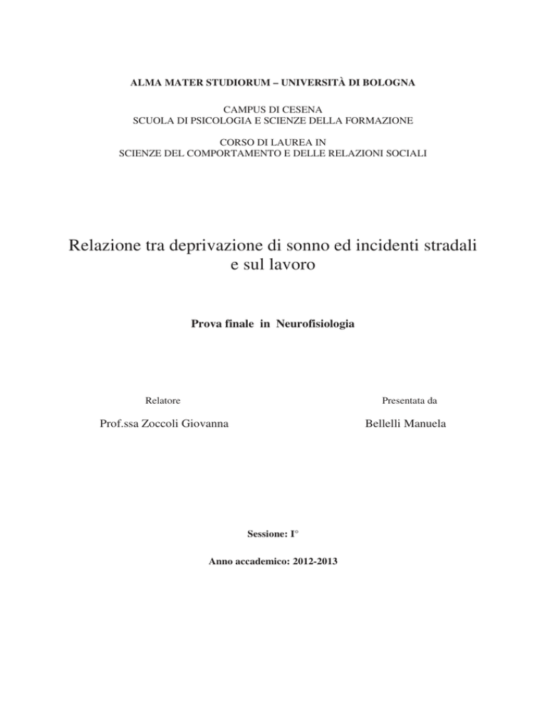 ALMA MATER STUDIORUM – UNIVERSITÀ DI BOLOGNA CAMPUS DI CESENA SCUOLA DI PSICOLOGIA E SCIENZE DELLA FORMAZIONE CORSO DI LAUREA IN SCIENZE DEL COMPORTAMENTO E DELLE RELAZIONI SOCIALI Relazione tra deprivazione di sonno ed incidenti stradali e sul lavoro Prova finale in Neurofisiologia Relatore Presentata da Prof.ssa Zoccoli Giovanna Bellelli Manuela Sessione: I° Anno accademico: 2012-2013 Indice 1. 2. 2.1. 2.2. 2.3. 2.3.1. 2.3.2. 2.4. 2.5. 2.6. 2.6.1. 2.6.2. 2.6.3 2.7. 2.7.1. 2.7.2. 2.7.3. 2.7.4. 2.8. 3. 3.1. 3.2. 3.3. 3.4. 3.4.1. 3.5. 3.5.1. 3.5.2. 3.5.3. 3.5.4. 3.6. 3.7. 3.8. 4. 4.1. 4.2. Introduzione …………………………………………………………………… Il sonno…………………………………………………………………………. Centri nervosi che regolano il ciclo veglia sonno ……………………………… Interazioni talamo corticali …………………………………………………….. Stadi del sonno …………………………………………………………………. Sonno non REM (ad onde lente) ………………………………………………. Sonno REM ……………………………………………………………………. Modificazioni fisiologiche durante il sonno …………………………………… Organizzazione del ciclo di sonno …………………………………………….. Funzioni del sonno …………………………………………………………….. Sonno e funzioni cognitive …………………………………………………….. Sonno e metabolismo cerebrale ………………………………………………. Sonno e processi di memoria ………………………………………………….. Disturbi del sonno …………………………………………………………….. Insonnia ………………………………………………………………………. Apnee del sonno ……………………………………………………………….. Narcolessia …………………………………………………………………….. Altri disturbi del sonno ………………………………………………………. Effetti della deprivazione di sonno ……………………………………………. Deprivazione di sonno e incidenti stradali e sul lavoro ……………………….. Variabili che influenzano lo stato di vigilanza ………………………………… Valutazione della sonnolenza …………………………………………………. Sonnolenza ed incidenti stradali ………………………………………………. Giovani, sonnolenza ed incidenti stradali ……………………………………… Giovani e percezione del rischio connesso alla guida ………………………… Cosa è possibile fare per prevenire gli incidenti stradali? ……………………. Evitare alcol e stupefacenti ……………………………………………………. Moderare la velocità …………………………………………………………... Evitare la guida quando la sonnolenza è elevata ……………………………… Mettere in atto strategie per contrastare la sonnolenza ………………………… Sonnolenza ed incidenti sul lavoro ……………………………………………. Cosa è possibile fare per prevenire incidenti sul lavoro dei lavoratori turnisti… Stress e incidenti ………………………………………………………………. Conclusioni ……………………………………………………………………. Il ruolo dello Psicologo del traffico …………………………………………… Un’ esperienza personale come Agente di Polizia Municipale ……………….. 1 3 4 4 6 7 7 8 9 9 10 10 11 12 14 14 15 16 17 17 21 24 25 26 29 32 38 38 39 39 41 42 45 47 54 55 56 Fonti bibliografiche ……………………………………………………………. 59 1 - Introduzione Questo lavoro analizza il problema della sicurezza stradale, insistendo su un aspetto raramente considerato nelle campagne sulla prevenzione: la deprivazione di sonno del conducente. La deprivazione di sonno, infatti, interessa sia gli utenti giovani della strada che viaggiano di notte, soprattutto per scopi ludici, sia i lavoratori turnisti alla fine del turno notturno. Come causa delle cosiddette “stragi del sabato sera” vengono spesso indicati alcol, droga e velocità. Ma la deprivazione di sonno riveste un ruolo centrale negli incidenti stradali notturni. In questa trattazione verrà dapprima descritto il sonno come fenomeno attivo, prodotto da specifici circuiti cerebrali ed indispensabile per il corretto svolgimento di molte funzioni cognitive; quindi si analizzeranno i problemi legati alla deprivazione di sonno e le circostanze più comuni in cui questa può realizzarsi. Infine si discuteranno le misure che potrebbero venire intraprese per arginare il fenomeno. 2 - Il sonno 2-1 Centri nervosi che regolano il ciclo veglia sonno Il sonno non è semplicemente il risultato di una ridotta attività cerebrale o di uno “spegnimento” degli input sensoriali, ma rappresenta uno stato cerebrale attivo, accuratamente controllato. Il sonno presenta diversi stadi che si susseguono l’un l’altro. Lo stato di veglia è basato sull’attivazione di un substrato neurale specifico, che comprende nuclei della regione centrale tronco encefalica che costituiscono il sistema reticolare (ascendente) attivante. Elementi importanti sono i neuroni dei nuclei colinergici della giunzione ponto-mesencefalica, le cellule noradrenergiche del locus coeruleus e i neuroni serotoninergici del nucleo del rafe. L’attività di questi nuclei tronco encefalici modula il grado di coscienza durante il giorno in un continuum che va dalla veglia attenta all’inizio del sonno. Questi nuclei sono controllati dagli orologi circadiani posti nel nucleo soprachiasmatico dell