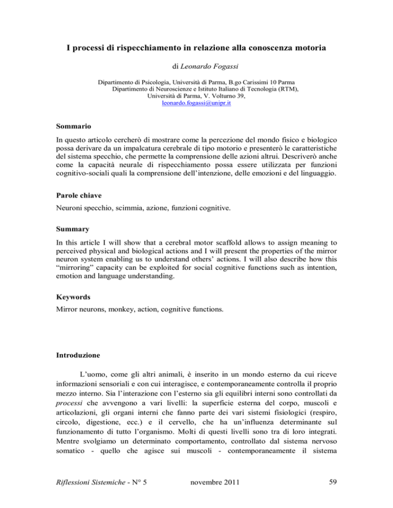 I processi di rispecchiamento in relazione alla conoscenza motoria di Leonardo Fogassi Dipartimento di Psicologia, Università di Parma, B.go Carissimi 10 Parma Dipartimento di Neuroscienze e Istituto Italiano di Tecnologia (RTM), Università di Parma, V. Volturno 39, [email protected] Sommario In questo articolo cercherò di mostrare come la percezione del mondo fisico e biologico possa derivare da un impalcatura cerebrale di tipo motorio e presenterò le caratteristiche del sistema specchio, che permette la comprensione delle azioni altrui. Descriverò anche come la capacità neurale di rispecchiamento possa essere utilizzata per funzioni cognitivo-sociali quali la comprensione dell’intenzione, delle emozioni e del linguaggio. Parole chiave Neuroni specchio, scimmia, azione, funzioni cognitive. Summary In this article I will show that a cerebral motor scaffold allows to assign meaning to perceived physical and biological actions and I will present the properties of the mirror neuron system enabling us to understand others’ actions. I will also describe how this “mirroring” capacity can be exploited for social cognitive functions such as intention, emotion and language understanding. Keywords Mirror neurons, monkey, action, cognitive functions. Introduzione L’uomo, come gli altri animali, è inserito in un mondo esterno da cui riceve informazioni sensoriali e con cui interagisce, e contemporaneamente controlla il proprio mezzo interno. Sia l’interazione con l’esterno sia gli equilibri interni sono controllati da processi che avvengono a vari livelli: la superficie esterna del corpo, muscoli e articolazioni, gli organi interni che fanno parte dei vari sistemi fisiologici (respiro, circolo, digestione, ecc.) e il cervello, che ha un’influenza determinante sul funzionamento di tutto l’organismo. Molti di questi livelli sono tra di loro integrati. Mentre svolgiamo un determinato comportamento, controllato dal sistema nervoso somatico - quello che agisce sui muscoli - contemporaneamente il sistema Riflessioni Sistemiche - N° 5 novembre 2011 59 cardiocircolatorio e quello respiratorio si adattano alle esigenze di quel determinato comportamento, grazie all’attività della componente vegetativa del sistema nervoso. Possiamo quindi guardare al nostro organismo come un sistema perfettamente regolato. Per molto tempo gli studi biologici si sono concentrati sullo studio dei due aspetti appena descritti (regolazione interna e interazione col mondo fisico). C’è però un altro aspetto che riguarda il nostro organismo, che si esprime anch’esso attraverso una interattività. Esso consiste nella cognizione sociale, termine con cui si intende la nostra capacità di comprendere ciò che svolgono i conspecifici, in modo che la nostra interazione con essi sia efficace e possibilmente porti dei benefici a noi e a loro. Negli ultimi anni gli studi della psicologia, dell’etologia e delle neuroscienze hanno messo in luce molti fenomeni e meccanismi di cognizione sociale, e hanno evidenziato come essa non sia patrimonio esclusivo della specie umana, ma anche degli altri primati non umani e, come minimo, di altri mammiferi. In particolare, negli ultimi vent’anni è stato scoperto un meccanismo nervoso che può dar ragione di molti fenomeni sociali. Tale meccanismo si riferisce ai cosiddetti neuroni specchio, e i fenomeni che da esso dipendono vengono ricondotti alla capacità di rispecchiamento, che è stata ampiamente dimostrata nei primati, ma che è presente anche in altre specie animali. I processi di rispecchiamento e la ‘risonanza motoria’ Il meccanismo dei neuroni specchio, forse sorprendentemente per alcuni, ha origine strettamente dall’organizzazione del sistema motorio, più che da quello sensoriale, nonostante, come vedremo, costituisca di fatto un esempio di sistema sensorimotorio. Scoprire come si origina il sistema specchio ci fa capire l’importanza del movimento per la nostra conoscenza del mondo. Lo studio dei processi di rispecchiamento ci permette di abbracciare ambiti di studio che comprendono l’etologia, la psicologia sociale, la psicologia dello sviluppo, la neurofisiologia e la psicofisiologia. In realtà poi lo sguardo si può ampliare a comprendere anche la psichiatria, la psicoanalisi e la neuroestetica. Parlare di rispecchiamento vuol dire parlare di azioni, emozioni, intenzioni, linguaggio, imitazione. La capacità di ‘rispecchiare’ gli altri si applica a differenti tipi di comportamento. Può consistere in una ‘risonanza’ automatica, come nel caso del comportamento di contagio, dove un individuo tende a ripetere dei movimenti messi in atto da un altro (ad esempio lo sbadiglio), e nell’effetto camaleonte, dove un individuo tende ad assumere le posture e i modi di fare di un altro. Ma forse il più diffuso, e adattivamente rilevante, fenomeno di rispecchiamento è l’imitazione. Questo termine include differenti processi, che vanno dall’imitazione in senso stretto - la riproduzione immediata di un movimento o gesto mai visto precedentemente - alla facilitazione dell’azione - un aumento nella frequenza di un determinato comportamento già appartenente al repertorio dell’osservatore - all’emulazione - la riproduzione dell’obiettivo di un comportamento osservato, indipendentemente dai mezzi utilizzati per raggiungerlo. A seconda della situazione e del contesto possono essere utilizzati uno o più di questi processi. Ad Riflessioni Sistemiche - N° 5 novembre 2011 60 esempio, per imparare a suonare degli accordi sul pianoforte è necessario riprodurre l’esatta sequenza di movimenti delle dita mostrata dall’insegnante. E’ da notare che, mentre processi imitativi quali la facilitazione dell’azione sono stati descritti anche nelle scimmie, la vera imitazione è stata descritta solo nell’uomo e, in parte, nelle scimmie antropomorfe. Ciò che comunque accomuna tutti i processi imitativi sopra menzionati è la capacità di entra