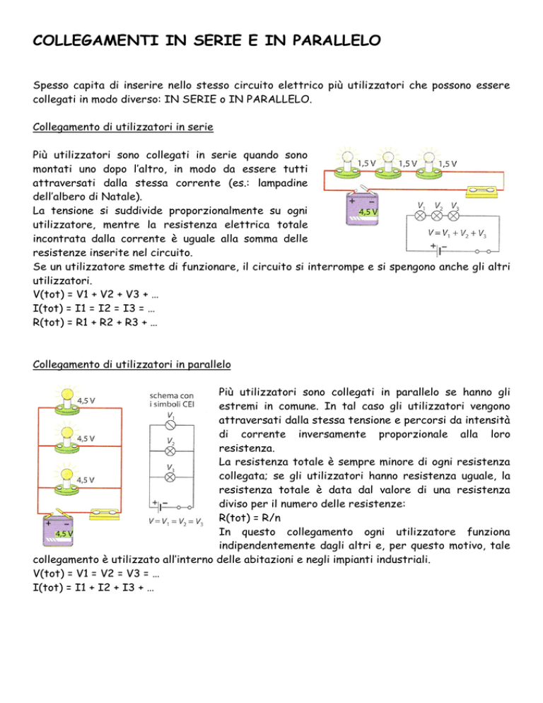 COLLEGAMENTI IN SERIE E IN PARALLELO Spesso capita di inserire nello stesso circuito elettrico più utilizzatori che possono essere collegati in modo diverso: IN SERIE o IN PARALLELO. Collegamento di utilizzatori in serie Più utilizzatori sono collegati in serie quando sono montati uno dopo l’altro, in modo da essere tutti attraversati dalla stessa corrente (es.: lampadine dell’albero di Natale). La tensione si suddivide proporzionalmente su ogni utilizzatore, mentre la resistenza elettrica totale incontrata dalla corrente è uguale alla somma delle resistenze inserite nel circuito. Se un utilizzatore smette di funzionare, il circuito si interrompe e si spengono anche gli altri utilizzatori. V(tot) = V1 + V2 + V3 + … I(tot) = I1 = I2 = I3 = … R(tot) = R1 + R2 + R3 + … Collegamento di utilizzatori in parallelo Più utilizzatori sono collegati in parallelo se hanno gli estremi in comune. In tal caso gli utilizzatori vengono attraversati dalla stessa tensione e percorsi da intensità di corrente inversamente proporzionale alla loro resistenza. La resistenza totale è sempre minore di ogni resistenza collegata; se gli utilizzatori hanno resistenza uguale, la resistenza totale è data dal valore di una resistenza diviso per il numero delle resistenze: R(tot) = R/n In questo collegamento ogni utilizzatore funziona indipendentemente dagli altri e, per questo motivo, tale collegamento è utilizzato all’interno delle abitazioni e negli impianti industriali. V(tot) = V1 = V2 = V3 = … I(tot) = I1 + I2 + I3 + … Collegamento di generatori in serie Quando si ha bisogno di una tensione più elevata di quella che può produrre un solo generatore, si ricorre al collegamento in serie che avviene unendo il polo positivo di un elemento con il polo negativo dell’altro e così via. Con il collegamento in serie si ottiene una batteria la cui tensione risulta essere uguale alla somma delle tensioni di ogni singolo elemento, mentre l’intensità è quella che potrebbe fornire un solo elemento. V(tot) = V1 + V2 + V3 + … I(tot) = I1 = I2 = I3 = … Collegamento di generatori in parallelo Si ricorre al collegamento di generatori in parallelo quando si vuole ottenere una corrente elettrica di intensità maggiore di quella che può erogare un solo generatore. Si ottiene il collegamento in parallelo unendo tra loro i poli positivi da un lato e i poli negativi dall’altro. Nel collegamento in parallelo la tensione è pari a quella fornita da un solo elemento, mentre l’intensità di corrente è uguale alla somma delle intensità erogate dai singoli elementi. V(tot) = V1 = V2 = V3 = … I(tot) = I1 + I2 + I3 + …