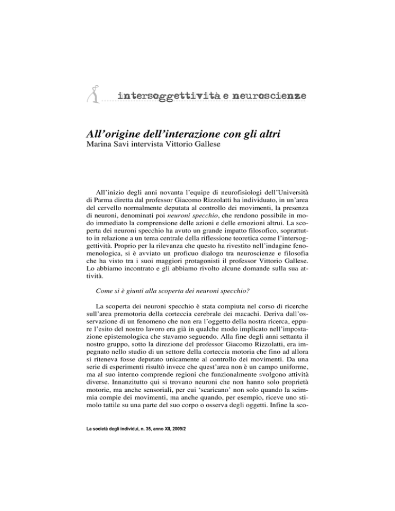 All’origine dell’interazione con gli altri Marina Savi intervista Vittorio Gallese All’inizio degli anni novanta l’equipe di neurofisiologi dell’Università di Parma diretta dal professor Giacomo Rizzolatti ha individuato, in un’area del cervello normalmente deputata al controllo dei movimenti, la presenza di neuroni, denominati poi neuroni specchio, che rendono possibile in modo immediato la comprensione delle azioni e delle emozioni altrui. La scoperta dei neuroni specchio ha avuto un grande impatto filosofico, soprattutto in relazione a un tema centrale della riflessione teoretica come l’intersoggettività. Proprio per la rilevanza che questo ha rivestito nell’indagine fenomenologica, si è avviato un proficuo dialogo tra neuroscienze e filosofia che ha visto tra i suoi maggiori protagonisti il professor Vittorio Gallese. Lo abbiamo incontrato e gli abbiamo rivolto alcune domande sulla sua attività. Come si è giunti alla scoperta dei neuroni specchio? La scoperta dei neuroni specchio è stata compiuta nel corso di ricerche sull’area premotoria della corteccia cerebrale dei macachi. Deriva dall’osservazione di un fenomeno che non era l’oggetto della nostra ricerca, eppure l’esito del nostro lavoro era già in qualche modo implicato nell’impostazione epistemologica che stavamo seguendo. Alla fine degli anni settanta il nostro gruppo, sotto la direzione del professor Giacomo Rizzolatti, era impegnato nello studio di un settore della corteccia motoria che fino ad allora si riteneva fosse deputato unicamente al controllo dei movimenti. Da una serie di esperimenti risultò invece che quest’area non è un campo uniforme, ma al suo interno comprende regioni che funzionalmente svolgono attività diverse. Innanzitutto qui si trovano neuroni che non hanno solo proprietà motorie, ma anche sensoriali, per cui ‘scaricano’ non solo quando la scimmia compie dei movimenti, ma anche quando, per esempio, riceve uno stimolo tattile su una parte del suo corpo o osserva degli oggetti. Infine la sco- La società degli individui, n. 35, anno XII, 2009/2 perta più importante di tutte: questi neuroni motori non sono unicamente deputati al controllo dei movimenti ma di atti motori, cioè di movimenti eseguiti per conseguire uno scopo. Viene perciò introdotto il concetto di teleologia, che entra a pieno titolo fra le caratteristiche dell’architettura funzionale del sistema motorio. Nonostante questo concetto incontri molta diffidenza anche presso ampi settori scientifici, un’altra serie di esperimenti ne ha confermato la pertinenza a descrivere i fenomeni osservati: i neuroni del sistema motorio non hanno infatti solo un ruolo esecutivo, non servono cioè unicamente a contrarre i muscoli, ma possono mappare qualcosa di astratto come uno scopo. Con un’altra serie di esperimenti si è poi dimostrato che alcuni di questi neuroni – i neuroni canonici – hanno la proprietà di attivarsi anche quando la scimmia si limita a osservare un oggetto, senza nessun impegno motorio da parte sua. Ma c’è di più: i neuroni ‘scaricano’ solo se l’oggetto ha le stesse caratteristiche di prensione, come quello codificato dal punto di vista motorio. L’aspetto più interessante è perciò costituito dal fatto che questi neuroni sono verosimilmente responsabili di quel processo che chiamiamo trasformazione visuo-motoria per cui la forma di un oggetto, che è l’oggetto di una nostra azione potenziale, viene tradotta nel programma motorio richiesto qualora si desideri conseguire uno scopo particolare che prevede l’interazione attiva con l’oggetto. Questo dimostra come già nella scimmia, cioè in una specie prelinguistica, l’osservazione di un oggetto non sia un processo unicamente visivo. Al di là dell’aspetto puramente passivo della sensorialità visiva, vedere un oggetto significa non solo ricostruirne iconicamente la forma, ma anche catalogarlo in modo implicito, dal punto di vista motorio, catturandone l’intrinseca inerenza al soggetto che lo percepisce. Questa inerenza è naturalmente di tipo pragmatico. Secondo questa prospettiva l’oggetto acquista una valenza significativa solo in virtù della propria relazione dinamica con il soggetto, rispetto al quale è il polo di una sua azione potenziale. Mi permetto perciò di sottolineare la pertinenza dell’esito dei nostri studi con la concezione heideggeriana per la quale all’uomo il mondo si dischiude come progetto delle sue azioni. Gli oggetti del nostro mondo acquistano significato non solo in virtù della mera presenza, del loro starci dinanzi, secondo la modalità propria dell’approccio teoretico-conoscitivo, ma anche grazie al loro essere per noi a portata di mano (zuhanden), cioè del loro appartenere al nostro orizzonte pragmatico. Il sistema motorio gioca anche una funzione decisiva nel rapporto con i nostri simili? Il passo ulteriore è stata la scoperta che alcuni di questi neuroni non ‘scaricano’ nel momento in cui presentiamo l’oggetto alla scimmia, ma in 116 un momento antecedente, quando cioè noi andiamo ad afferrare l’oggetto per presentarglielo. Questa è una genuina risposta di tipo visivo a uno stimolo evocato dall’osservazione di un movimento analogo a quello che veniva eseguito dalla scimmia. Nasce da qui la metafora del rispecchiamento per connotare la proprietà di questi neuroni – i neuroni specchio – presenti nella corteccia premotoria dei primati non umani e dell’uomo, che si attivano sia quando compiamo un’azione sia quando la vediamo eseguire dagli altri. Ci consentono quindi di comprendere il significato di un’azione compiuta da un altro, proprio in virtù del fatto che questa fa parte del nostro patrimonio pragmatico ed esperienziale. In altri termini, chi osserva utilizza le proprie risorse neurali per penetrare il mondo dell’altro dall’interno, mediante un meccanismo automatico e prelinguistico di simulazione motoria. Questi neuroni permettono perciò un