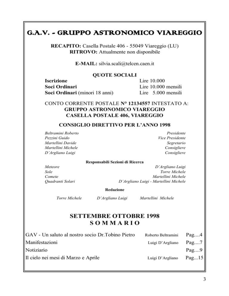 G.A.V. - GRUPPO ASTRONOMICO VIAREGGIO RECAPITO: Casella Postale 406 - 55049 Viareggio (LU) RITROVO: Attualmente non disponibile E-MAIL: [email protected] QUOTE SOCIALI Iscrizione Lire 10.000 Soci Ordinari Lire 10.000 mensili Soci Ordinari (minori 18 anni) Lire 5.000 mensili CONTO CORRENTE POSTALE N° 12134557 INTESTATO A: GRUPPO ASTRONOMICO VIAREGGIO CASELLA POSTALE 406, VIAREGGIO CONSIGLIO DIRETTIVO PER L’ANNO 1998 Beltramini Roberto Pezzini Guido Martellini Davide Martellini Michele D’Argliano Luigi Presidente Vice Presidente Segretario Consigliere Consigliere Responsabili Sezioni di Ricerca Meteore Sole Comete Quadranti Solari D’Argliano Luigi Torre Michele Martellini Michele D’Argliano Luigi - Martellini Michele Redazione Torre Michele D’Argliano Luigi Martellini Michele SETTEMBRE OTTOBRE 1998 SOMMARIO GAV - Un saluto al nostro socio Dr.Tobino Pietro Manifestazioni Roberto Beltramini Pag....4 Luigi D’Argliano Pag....7 Notiziario Il cielo nei mesi di Marzo e Aprile Pag....9 Luigi D’Argliano Pag...15 3 GRUPPO ASTRONOMICO VIAREGGIO UN SALUTO AL NOSTRO SOCIO DR. PIETRO TOBINO Se ne è andato. Forse sono migliori queste parole di altre più dure di quella che è purtroppo la triste realtà. Rimangono i ricordi, da una parte a consolarci e dall’altra a far rimpiangere certi momenti. Come quando il sottoscritto Roberto Beltramini e il socio Davide Martellini su richiesta del Dr. Tobino e a suo dire in veste di “esperti in materia” lo accompagnammo in viaggio a Firenze per visionare quello che poi sarebbe divenuto il giorno stesso il suo telescopio: un newtoniano da 20 centimetri di diametro. Poi il lauto pranzo offertoci per festeggiare l’acquisto vide come portate principali una magnifica bistecca fiorentina con contorno di argomenti che spaziavano dalla collimazione delle ottiche alla messa in postazione del telescopio, il tutto condito da uno sguardo raggiante e da parole entusiaste per l’acquisto appena fatto e per le possibilità osservative dello strumento. Poi le sue immancabili domande su tutti i settori dell’Astronomia che sembravano e volevano mettere alla prova le conoscenze dell’interlocutore per poi proseguire nell’approfondimento puntiglioso dell’argomento. Sempre presente a tutte le attività divulgative e sociali e come pochi entusiasta sostenitore dell’associazione e di tutti i suoi progetti. I suoi calorosi saluti con una potente stretta di mano da togliere il fiato, così, forse è il modo più simpatico per serbare nella memoria il ricordo di un amico, di un socio, di un appassionato ed entusiasta astrofilo. Un vero esempio per i più giovani di cosa può lo spirito contro lo scorrere inesorabile del tempo. Un grande rimpianto non averlo più tra noi e tanto meno all’inaugurazione di quello che sarà l’Osservatorio Astronomico “Alpi Apuane”. Da questo nasce spontanea l’idea e la proposta di dedicargli quella parte dell’edificio dove avrebbe voluto osservare al telescopio le sue amate stelle: la specola “Dr. Pietro Tobino”. Degno ricordo di quanto egli tenesse alla sua realizzazione e purtroppo anche legato al fatto di essere il primo socio del nostro gruppo a lasciarci nell’arco dei 25 anni di attività. Nella pagina seguente è riprodotta la foto scattata durante la visita, effettuata due anni fa, all’osservatorio radioastronomico di Medicina (BO), alla quale partecipò anche il Dr. Pietro Tobino. A seguire alcune righe sul significato della parola specola. 4 5 Significato della parola specola La parola specola, apparentemente in disuso, in questo contesto, acquista un significato ancora più eminente ed interessante per la sua origine storica. Prende origine dalla parola “speculare” e cioè: scrutare, guardare, esplorare, contemplare, considerare (Considerazione: da “cum sidus, cum sideris” = osservare gli astri); da cui il detto “specular le stelle”. Sembra l’attività dell’astrofilo per eccellenza. Nell’antichità l’osservazione del cielo veniva fatta a terra in luoghi con orizzonte libero per poter determinare il momento del sorgere o tramontare degli astri. La totale assenza di inquinamento luminoso infatti permetteva l’osservazione agevole di oggetti bassi sull’orizzonte. Adatti allo scopo erano anche alture naturali o artificiali ma era soprattutto in mare, per motivi di orientamento legali alla navigazione, che all’osservatore si presentava l’intera volta celeste con l’orizzonte perfetto. Dal fatto poi che le immagini degli astri più luminosi potessero addirittura riflettersi sulle acque calme e perciò specchiarsi sul mare, nasce il termine “speculare” cioè immagine riflessa. Da ciò abbiamo così la spiegazione delle parole specular le stelle e cioè osservarle attraverso l’immagine riflessa. Guarda caso, l’astrofilo moderno osserva le stelle non più specchiarsi nell’acqua ma nel vetro delle ottiche dei telescopi a riflessione. L’evoluzione dei tempi cambia i mezzi senza alterarne il significato. Specola, però ha il significato, rilevabile da qualsiasi vocabolario, di osservatorio astronomico, altura, luogo eminente da cui si può speculare fino all’orizzonte la volta celeste. Il luogo cioè da cui si osserva esclusivamente il cielo cosa che non si può dire per il termine “osservatorio” che può essere adibito ai più disparati usi come ad esempio: osservatorio militare, osservatorio metereologico, osservatorio sismologico, ecc.. 6 MANIFESTAZIONI LE STELLE DEL PARCO La sera del 6 agosto il GAV è stato presente ad una iniziativa promossa dal WWF e dall’Ente Parco Migliarino San Rossore Massaciuccoli che, oltre ad un’escursione nella Macchia Lucchese prevedeva un’osservazione del cielo dalla zona delle dune della Lecciona. Michele Martellini, Stefano Raffaelli e Luigi D’Argliano erano presenti per il nostro gruppo ed hanno mostrato al numeroso pubblico presente i crateri lunari, Giove e le costellazioni estive. Finita l’osservazione, intorno alle