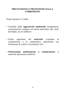 CORROSIONE DELL’ACCIAIO NEGLI AMBIENTI NATURALI Negli ambienti naturali, cui sono esposte la maggior parte delle infrastrutture e costruzioni civili le reazioni di corrosione seguono un meccanismo elettrochimico. L’acciaio si corrode quando viene a contatto con acqua contenente ossigeno disciolto. Sono situazioni caratteristiche: – le strutture posate nel terreno, dove l’acqua è presente come acqua capillare o di falda; – le strutture immerse in acque naturali – dolci, salmastre o di mare; – le strutture esposte all’atmosfera, in presenza di condensa o di pioggia; – le armature nelle strutture in calcestruzzo, dove l’acqua è presente nelle porosità del cemento. La corrosione è invece nulla per esposizione in atmosfere secche o a fluidi anidri, come ad esempio il gas metano nelle reti di trasporto e distribuzione. Ruolo dell’ossigeno L’ossigeno disciolto nell’acqua è la specie chimica che causa la corrosione degli acciai negli ambienti naturali. L’ossigeno presente nell’atmosfera si scioglie in piccola quantità nella soluzione acquosa. Se il sistema è chiuso l’eventuale ossigeno disciolto nell’acqua viene consumato per corrosione fino a quando la reazione si arresta e non procede più perché manca l’ossigeno! La corrosione del Ferro in ambiente umido La corrosione ha inizio quando un conduttore metallico (Ferro) si trova a contatto con una soluzione acquosa oppure in un mezzo poroso (terreno o calcestruzzo) permeato d’acqua contenente Sali disciolti. A causa della presenza di eterogeneità chimiche o fisiche sul metallo o nella soluzione acquosa a contatto con esso si possono generare delle differenze di potenziale elettrico tra le diverse parti del sistema. Si forma quindi una cella elettrochimica costituita da zone anodiche e catodiche che iniziano a funzionare come una o più pile. Avviene una reazione di ossidoriduzione: Zona anodica - Reazione anodica (-): Fe → Fe2+ + 2eZona catodica - Reazione catodica (+): ½O2 + H2O + 2e- → 2OH- La corrosione del Ferro in ambiente umido Il meccanismo consiste nella dissoluzione del ferro (area anodica) e formazione di OHsull’area catodica. Gli ioni che si sono formati migrano attraverso la soluzione e reagiscono tra loro formando idrossido di ferro Fe(OH)2 . Questo in presenza di ossigeno dell’aria si ossida a Fe(OH)3 che poi si decompone formando anche Fe2O3 Il processo di corrosione è di tipo spontaneo e si verifica se il potenziale di equilibrio della reazione catodica è maggiore del potenziale di equilibrio della reazione anodica. Si genera un flusso di elettroni nel metallo ed una migrazione di ioni nella soluzione. Eterogeneità nel metallo I fenomeni di corrosione si innescano in corrispondenza di eterogeneità della superficie metallica, ad esempio: zone deformate (piegatura di un ferro dell’armatura) o in cui sono presenti dei difetti, zone di saldatura di parti diverse dell’armatura. In corrispondenza di queste eterogeneità si può innescare la corrosione in quanto queste zone avranno un comportamento anodico rispetto al resto della superficie che sarà catodica. Quindi si crea una differenza di potenziale fra area anodica e area catodica. Eterogeneità nel metallo: corrosione fra due fasi (galvanica) Si creano processi di corrosione anche in presenza di fasi metalliche diverse nello stesso acciaio (eterogeneità). Ad es. l’acciaio del tondo di un cemento armato se osservato al microscopio ottico è costituito da due fasi diverse: la ferrite e la cementite (es: perlite). La cementite è più nobile (ha un potenziale maggiore) della ferrite e quindi,in presenza di umidità sulla superficie del tondo, quest’ultima diventa anodica, e si corrode (corrosione galvanica). Eterogeneità nella soluzione elettrolitica di contatto (aerazione differenziale): Si verifica quando l’ossigeno disciolto nella soluzione elettrolitica ha una concentrazione maggiore in una zona del conglomerato più porosa (l’ossigeno viene più facilmente a contatto con la soluzione perché la zona è più porosa). Si crea quindi una differenza di potenziale fra le zone poco porose dove l’ossigeno non arriva facilmente (zona anodica dove il Fe si corrode) e quelle più porose dove arriva più facilmente l’O2che quindi si riduce (zona catodica). Diagramma di Pourbaix del Ferro La possibilità che il metallo si corroda dipende, oltre che dal potenziale del metallo in quell’ambiente, anche dal pH della soluzione. Il Diag. di Pourbaix del ferro indica al variare del potenziale del ferro e del pH della soluzione quali fenomeni si possono verificare sulla superficie del metallo: Immunità: il metallo non si corrode. Attività (corrosione): il metallo si corrode Passività (passivazione): il metallo in queste condizioni si dissolve ma forma un ossido sulla superficie, compatto ed impermeabile, che isola il metallo stesso proteggendolo e quindi impedendo il proseguire della corrosione. L’acqua che normalmente penetra la pasta di cemento presenta (a indurimento avvenuto, per effetto della solubilizzazione degli alcali del clincker e formazione solfoalluminati) un pH attorno a 13,5 (basico). Condizione di passività dell’acciaio nel cemento armato • Il pH della soluzione che penetra è di 13,5. • Il potenziale dell’acciaio impiegato per le barre delle armature in questo ambiente varia da circa -0,1 a circa 0,3 V. • A queste condizioni di pH e potenziale l’acciaio è passivo, cioè si forma un ossido protettivo che impedisce il proseguire della reazione di ossidazione del ferro. • Inoltre se la pasta di cemento è poco porosa, quindi poco permeabile, l’ossigeno disciolto arriva con maggiore difficoltà a contatto con la superficie metallica, quindi anche la reazione catodica è inibita. • Se queste condizioni vengono mantenute l’acciaio non si corrode. Perdita di passività dell’acciaio nel cemento armato Ci sono diversi fattori che possono alterare la condizione di passività dell’acc
