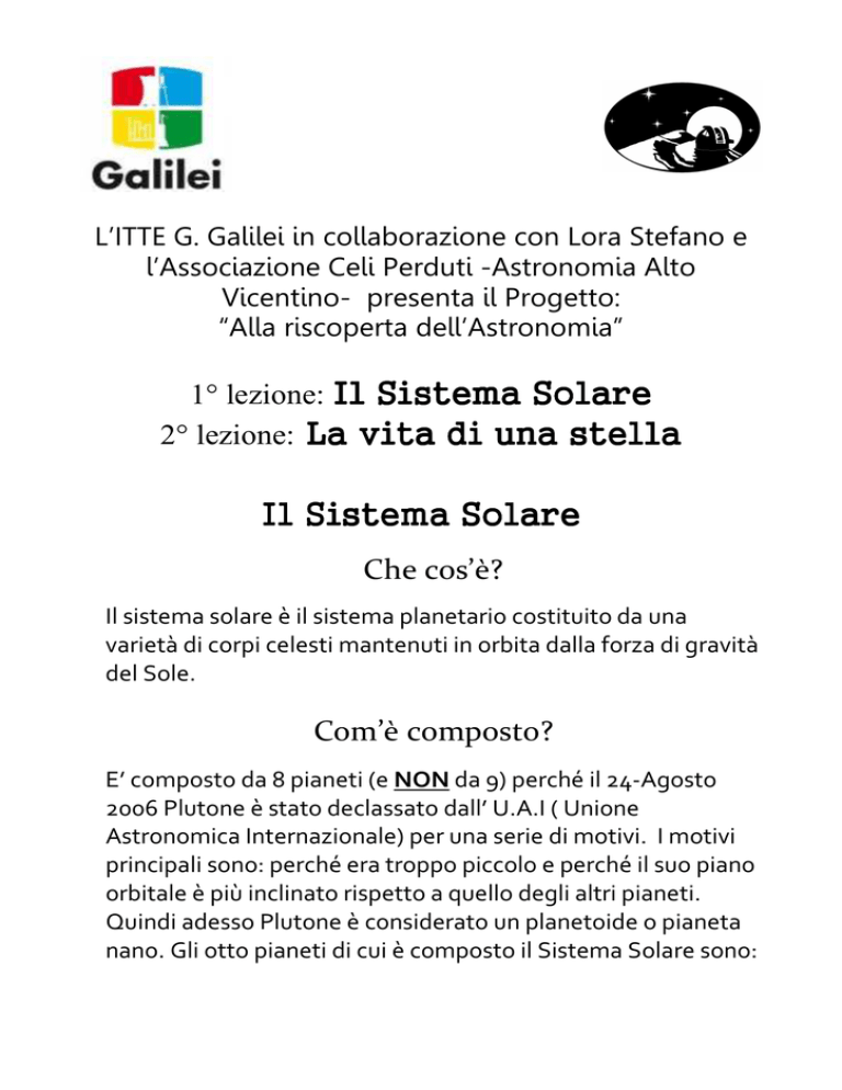 L’ITTE G. Galilei in collaborazione con Lora Stefano e l’Associazione Celi Perduti -Astronomia Alto Vicentino- presenta il Progetto: “Alla riscoperta dell’Astronomia” 1° lezione: Il Sistema Solare 2° lezione: La vita di una stella Il Sistema Solare Che cos’è? Il sistema solare è il sistema planetario costituito da una varietà di corpi celesti mantenuti in orbita dalla forza di gravità del Sole. Com’è composto? E’ composto da 8 pianeti (e NON da 9) perché il 24-Agosto 2006 Plutone è stato declassato dall’ U.A.I ( Unione Astronomica Internazionale) per una serie di motivi. I motivi principali sono: perché era troppo piccolo e perché il suo piano orbitale è più inclinato rispetto a quello degli altri pianeti. Quindi adesso Plutone è considerato un planetoide o pianeta nano. Gli otto pianeti di cui è composto il Sistema Solare sono: (in ordine di distanza dal Sole) Mercurio,Venere,Terra,Marte, Giove,Saturno,Urano e Nettuno. Come si è formato? Il Sistema Solare,si è formato grazie alla nascita del Sole, che come tutte le stelle, si è formato da una nube di gas chiamata Nebulosa. Quest’ultima è stata modificata chimicamente e fisicamente da un evento avvenuto all’esterno, detto scatenante,appunto perché scatena l’inizio delle reazioni, avvenuto all’esterno della nebulosa, quale potrebbe essere l’esplosione di un’altra stella,il passaggio di un asteroide o altro evento in grado di modificare la composizione chimicofisica della nebulosa. Grazie a questo evento le particelle più pesanti di questa nebulosa cominciano a condensarsi fra loro, spostarsi verso il centro della nebulosa e roteare. L’elevata rotazione provoca l’innalzamento della temperatura fino ad arrivare alla temperatura di fusione nucleare, questo fattore permette, l’innesco delle prime reazioni termonucleari dando così vita a una protostella. Alcuni dati tecnici Premessa In Astronomia per ovvi motivi di praticità non si utilizzano i Chilometri, ma si utilizzano altre unità di misura più consone. Queste unità di misura sono: l’unita Astronomica, l’anno luce, il parsec. Chilometri; Unità Astronomiche (U.A); 149.597.000Km Anno Luce (a.l); 63255 UA / 9.460.730.472.580,8 km / Parsec (pc); 3,26 Anni Luce Il Sole Distanza media dalla Terra: 149.597.000 Km = 1 U.A Massa: ( Terra = 1 )= 332.496 Volume ( Terra = 1)= 1.303.600 Temperatura alla superficie = 5.500 °C Temperatura al nucleo: 14.000.000 °C Tempo impiegato dalla luce per percorrere la distanza Terra – Sole: 8,3 minuti Magnitudine Assoluta: +4,83 Magnitudine Apparente:- 26,8 Mercurio Distanza media dal Sole: 57,9 Milioni di Km = 0.387 U.A. Massa (Terra 1):0,055 = 3,302 · 1023 kg Volume (Terra 1): 0.056= 6,083 · 1019 m³ Temperatura alla superficie di giorno: 360 °C Temperatura alla superficie di notte : -180°C Gravità in superficie : 3,701 m/s² Satelliti : NESSUNO Venere Distanza media dal Sole: 108,2 Milioni di Km = 0,723 U.A. Massa (Terra 1):0,815 = 4,8685 · 1024 kg Volume (Terra 1): 0.86 = 9,28 · 1020 m³ Temperatura alla superficie: 480 °C Gravità in superficie =8,87 m/s² Satelliti : NESSUNO Terra Distanza media dal Sole: 149.597.000 Milioni di Km = 1 U.A. Massa = 5,9742 · 1024 kg Volume = 1,083 207 3 · 1021 m³ Gravità in superficie : 9,81 m/s² Satelliti : Luna Fasi Lunari Le fasi lunari descrivono il diverso aspetto che la Luna mostra durante il suo moto, causate dal suo diverso orientamento rispetto al Sole. Le fasi lunari si ripetono in un intervallo di tempo detto "mese sinodico", pari a circa 29 giorni e mezzo. Il mese del nostro calendario è derivato da esso. Le fasi lunari sono dovute al moto di rivoluzione della Luna e al suo conseguente ciclico cambiamento di posizione rispetto alla Terra e al Sole. Marte Distanza media dal Sole: 227,92 Milioni di Km = 1.524 U.A. Massa (Terra 1):0,107 = 6,4185 · 1023 kg Volume (Terra 1): 0.150= 1,6318 · 1020 m³ Temperatura alla superficie: 23°C Periodo di rivoluzione: 686,9 gg Periodo di rotazione: 24h 37m 22,6s Gravità in superficie : 3,69 m/s² Satelliti : Phobos e Deimos Giove (Jupiter) Distanza media dal Sole: 778,34 Milioni di Km = 5.203 U.A. Massa (Terra 1): 317,9 = 1,8986 · 1027 kg Volume (Terra 1): 1318,7 = 1,43128 · 1024 m³ Temperatura alla superficie: - 150 °C Periodo di rivoluzione: 11.86 anni Periodo di rotazione: 9 h 50 m 28 s Gravità in superficie : 23,12 m/s² Satelliti : Io, Europa, Ganimede e Callisto Saturno Distanza media dal Sole: 1427 Milioni di Km = 9,54 U.A. Massa (Terra 1): 95.18 = 5,6846 · 1026 kg Volume (Terra 1): 761,4 = 8,27 · 1023 m³ Temperatura alla superficie: - 180 °C Periodo di rivoluzione: 24,46 anni Periodo di rotazione: 10 h 23 m 15 s Gravità in superficie : 8,96 m/s² Satelliti : Titano, Mimas, Athas e Pandora Urano Distanza media dal Sole:2.869 Milioni di Km = 19,181 U.A. Massa (Terra 1): 14,6 = 8,6832 · 1025 Kg Volume (Terra 1): 62,18 = 6,834 · 1022 m3 Temperatura alla superficie: - 214 °C Gravità in superficie : 8,69 m/s² Satelliti : 15 i 5 principali: Ariel, Umbriel, Titania, Oberon, Miranda Nettuno Distanza media dal Sole:4.496 Milioni di Km = 30.058 U.A. Massa (Terra 1): 17,2 = 1,0243 · 1026 kg Volume (Terra 1): 57 = 6,254 · 1022 m³ Temperatura alla superficie: - 220 °C Gravità in superficie : 11,15 m/s² Satelliti : 13 i 4 principali: Tritone; Nereide, Proteo e Larissa.