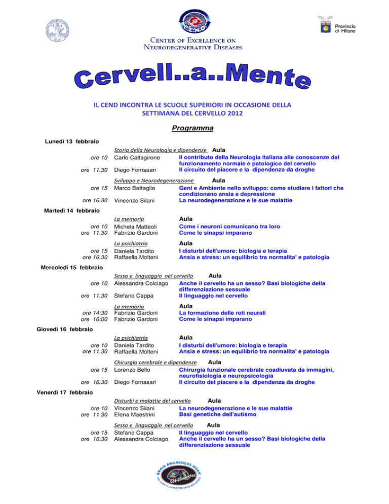 IL CEND INCONTRA LE SCUOLE SUPERIORI IN OCCASIONE DELLA SETTIMANA DEL CERVELLO 2012 Programma Lunedì 13 febbraio Storia della Neurologia e dipendenze Aula ore 10 ore 11.30 Carlo Caltagirone Diego Fornasari Il contributo della Neurologia Italiana alle conoscenze del funzionamento normale e patologico del cervello Il circuito del piacere e la dipendenza da droghe Sviluppo e Neurodegenerazione Aula ore 15 Marco Battaglia ore 16.30 Vincenzo Silani Geni e Ambiente nello sviluppo: come studiare i fattori che condizionano ansia e depressione La neurodegenerazione e le sue malattie La memoria Aula Michela Matteoli Fabrizio Gardoni Come i neuroni comunicano tra loro Come le sinapsi imparano La psichiatria Aula Daniela Tardito Raffaella Molteni I disturbi dell'umore: biologia e terapia Ansia e stress: un equilibrio tra normalita' e patologia Martedì 14 febbraio ore 10 ore 11.30 ore 15 ore 16.30 Mercoledì 15 febbraio Sesso e linguaggio nel cervello ore 10 ore 11.30 ore 14:30 ore 16:00 Aula Stefano Cappa Anche il cervello ha un sesso? Basi biologiche della differenziazione sessuale Il linguaggio nel cervello La memoria Aula Fabrizio Gardoni Fabrizio Gardoni La formazione delle reti neurali Come le sinapsi imparano La psichiatria Aula Daniela Tardito Raffaella Molteni I disturbi dell'umore: biologia e terapia Ansia e stress: un equilibrio tra normalita' e patologia Alessandra Colciago Giovedì 16 febbraio ore 10 ore 11.30 Chirurgia cerebrale e dipendenze ore 15 ore 16.30 Lorenzo Bello Diego Fornasari Aula Chirurgia funzionale cerebrale coadiuvata da immagini, neurofisiologia e neuropsicologia Il circuito del piacere e la dipendenza da droghe Venerdì 17 febbraio Disturbi e malattie del cervello ore 10 ore 11.30 Vincenzo Silani Elena Maestrini Sesso e linguaggio nel cervello ore 15 ore 16.30 Stefano Cappa Alessandra Colciago Aula La neurodegenerazione e le sue malattie Basi genetiche dell'autismo Aula Il linguaggio nel cervello Anche il cervello ha un sesso? Basi biologiche della differenziazione sessuale