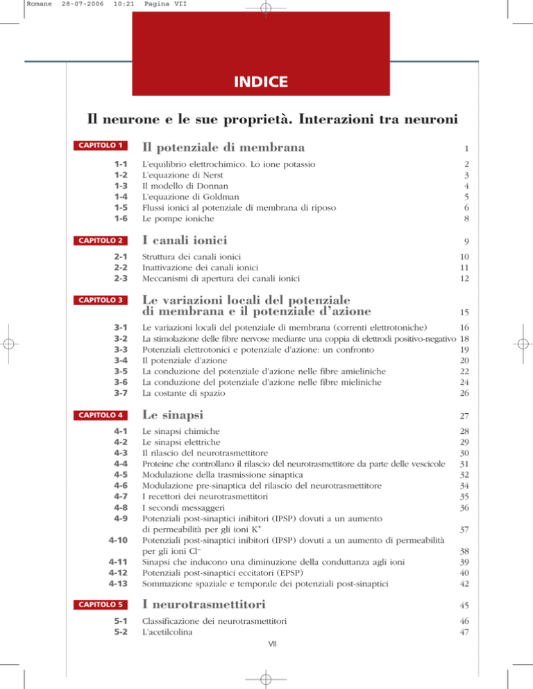 Romane 28-07-2006 10:21 Pagina VII INDICE Il neurone e le sue proprietà. Interazioni tra neuroni CAPITOLO 1 1-1 1-2 1-3 1-4 1-5 1-6 CAPITOLO 2 2-1 2-2 2-3 CAPITOLO 3 3-1 3-2 3-3 3-4 3-5 3-6 3-7 CAPITOLO 4 4-1 4-2 4-3 4-4 4-5 4-6 4-7 4-8 4-9 4-10 4-11 4-12 4-13 CAPITOLO 5 5-1 5-2 Il potenziale di membrana 1 L’equilibrio elettrochimico. Lo ione potassio L’equazione di Nerst Il modello di Donnan L’equazione di Goldman Flussi ionici al potenziale di membrana di riposo Le pompe ioniche 2 3 4 5 6 8 I canali ionici 9 Struttura dei canali ionici Inattivazione dei canali ionici Meccanismi di apertura dei canali ionici 10 11 12 Le variazioni locali del potenziale di membrana e il potenziale d’azione 15 Le variazioni locali del potenziale di membrana (correnti elettrotoniche) La stimolazione delle fibre nervose mediante una coppia di elettrodi positivo-negativo Potenziali elettrotonici e potenziale d’azione: un confronto Il potenziale d’azione La conduzione del potenziale d’azione nelle fibre amieliniche La conduzione del potenziale d’azione nelle fibre mieliniche La costante di spazio 16 18 19 20 22 24 26 Le sinapsi 27 Le sinapsi chimiche Le sinapsi elettriche Il rilascio del neurotrasmettitore Proteine che controllano il rilascio del neurotrasmettitore da parte delle vescicole Modulazione della trasmissione sinaptica Modulazione pre-sinaptica del rilascio del neurotrasmettitore I recettori dei neurotrasmettitori I secondi messaggeri Potenziali post-sinaptici inibitori (IPSP) dovuti a un aumento di permeabilità per gli ioni K+ Potenziali post-sinaptici inibitori (IPSP) dovuti a un aumento di permeabilità per gli ioni Cl– Sinapsi che inducono una diminuzione della conduttanza agli ioni Potenziali post-sinaptici eccitatori (EPSP) Sommazione spaziale e temporale dei potenziali post-sinaptici 28 29 30 31 32 34 35 36 I neurotrasmettitori 45 Classificazione dei neurotrasmettitori L’acetilcolina 46 47 VII 37 38 39 40 42 Romane 28-07-2006 10:21 Pagina VIII INDICE 5-3 5-4 5-5 5-6 5-7 5-8 Adrenalina e noradrenalina La dopamina La serotonina Acido γ-aminobutirrico (GABA) e glicina Il glutammato I peptidi 48 49 50 51 52 54 Le afferenze al sistema nervoso centrale: i sistemi sensoriali CAPITOLO 6 6-1 6-2 6-3 6-4 6-5 6-6 6-7 CAPITOLO 7 7-1 7-2 7-3 7-4 7-5 7-6 7-7 7-8 CAPITOLO 8 8-1 8-2 8-3 8-4 8-5 8-6 8-7 8-8 8-9 8-10 CAPITOLO 9 9-1 Principi di trasduzione sensoriale 55 I recettori sensoriali Codificazione dell’intensità di stimolazione Caratteristiche del potenziale generatore Recettori a rapido e a lento adattamento Meccanismi dell’adattamento dei recettori sensoriali Classificazione delle fibre nervose Psicofisiologia dei sistemi sensoriali e funzione psicometrica 56 58 60 61 62 63 64 Fusi neuromuscolari e organi tendinei di Golgi 65 Struttura dei fusi neuromuscolari e degli organi tendinei di Golgi Risposta del fuso neuromuscolare all’allungamento del muscolo Risposta del fuso neuromuscolare all’accorciamento passivo del muscolo Risposta del fuso neuromuscolare alla contrazione attiva del muscolo Risposte dell’organo tendineo di Golgi alle variazioni di tensione del muscolo Differenze funzionali tra il fuso neuromuscolare e l’organo tendineo di Golgi in condizioni di riposo Confronto tra le risposte del fuso neuromuscolare e dell’organo tendineo di Golgi Collegamenti nervosi e funzioni dei fusi neuromuscolari e degli organi di Golgi 66 68 69 70 71 Sensibilità tattile-discriminativa e propriocettiva 75 La sensibilità somoestesica lemniscale Organizzazione morfofunzionale della sensibilità trigeminale I recettori tattili I recettori del legamento parodontale I nuclei somoestesici del talamo L’area somatosensoriale primaria della corteccia cerebrale L’organizzazione della corteccia somatosensoriale Il campo recettivo dei neuroni dei nuclei delle colonne dorsali L’inibizione laterale o dei contorni (surrounding inhibition) Controllo centrifugo delle afferenze somoestesiche lemniscali 76 78 80 82 83 84 86 88 90 91 Sensibilità termo-dolorifica 93 La sensibilità somoestesica termo-dolorifica: organizzazione morfofunzionale 94 VIII 72 73 74 Romane 28-07-2006 10:21 Pagina IX INDICE 9-2 9-3 9-4 9-5 9-6 9-7 9-8 9-9 9-10 9-11 9-12 9-13 CAPITOLO 10 10-1 10-2 10-3 10-4 10-5 10-6 10-7 10-8 10-9 CAPITOLO 11 11-1 11-2 11-3 11-4 11-5 11-6 CAPITOLO 12 12-1 12-2 12-3 12-4 12-5 12-6 12-7 12-8 12-9 12-10 12-11 12-12 12-13 La sensibilità termica I nocicettori Il dolore dentale Il sistema antero-laterale: organizzazione morfofunzionale Organizzazione spinale delle afferenze nocicettive Il dolore riferito Arto fantasma e dolore fantasma Organizzazione talamica delle afferenze nocicettive La teoria del cancello La modulazione della risposta nocicettiva spinale da parte di stimoli nocicettivi Gli oppioidi endogeni Il controllo centrifugo della nocicezione 95 96 97 98 100 101 102 103 104 105 106 108 Il sistema uditivo 109 Organizzazione morfofunzionale dell’apparato uditivo La risposta dell’apparato uditivo alla stimolazione sonora Il suono L’organizzazione tonotopica della coclea Le cellule ciliate della coclea Vie acustiche centrali Il controllo centrifugo dell’apparato uditivo L’audiogramma La percezione della direzione del suono 110 112 114 115 116 117 118 120 121 Il sistema vestibolare 123 Organizzazione morfofunzionale dell’apparato vestibolare I canali semicircolari Utricolo e sacculo Vie vestibolari centrali Il riflesso vestibolo-oculare rotatorio Il nistagmo 124 126 128 129 130 131 Il sistema visivo 133 La luce Il sistema ottico dell’occhio L’occhio umano I fotorecettori La fototrasduzione Elettrofisiologia della retina La corteccia visiva primaria (o striata) I neuroni visivi corticali Le aree visive secondarie Le vie ottiche Funzione delle vie ottiche La percezione dei colori Riflessi pupillari e accomodazione 134 135 136 138 140 142 144 146 148 150 152 153 154 IX Romane 28-07-2006 10:21 Pagina X INDICE 12-14 12-15 CAPITOLO 13 13-1 13-2 13-3 CAPITOLO 14 14-1