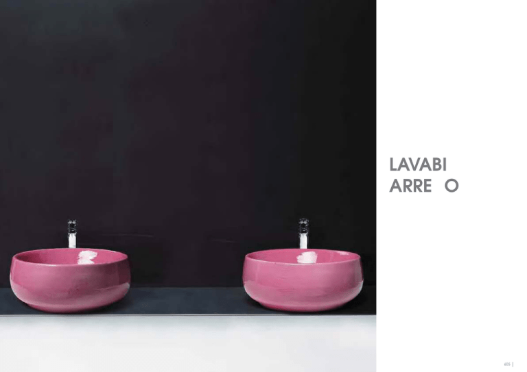 LAVABI ARRE O 605 CLIP appoggio 01 NUVOLA appoggio 08 GEOMETRICO appoggio THIN incasso 15 22 TULIP appoggio 29 LAVABI ARREDO washbasins 01. 45X45 CLI 45 02. 60X45 CLI 60 03. 45X45 VER 45/APP 04. 75X45 VER 75/APP 05. Ø30 ROU30 06. 49X30 OV49 07. Ø40,5 GRA AP4 08. 60X40 NUV 200/AP6 09. 75X40 NUV 200/AP8 10. Ø45 JUB 50/APP 11. Ø45 JUB 45/APP 12. Ø45 FLE 200 13. 75X40 THI 75/IN 14. 60X40 THI 60/IN 15. 55X35 THI 55/IN 16. 60X40 THI 60/SP 17. 75X40 THI 75/SPN 18. 60X40 CLR 60 19. 70X42 CLR 70 20. 90X44 CLR 90 21. 25X25 GEO 25 22. 41X25 GEO 41 23. 41X25 GEO 41M 24. 69X38 GLZ 69X38/IN 25. 60X41 GLZ 260/APP 26. 50X40 GLZ 50X40/IN 27. 69X38 GLZ 69X38/SP 28. 50X40 GLZ 50X40/SP 29. 45X40 TUL 4540 IN 30. 60X40 TUL 6040 IN 31. 75X40 TUL 7540 IN 32. 60X40 TUL 9040 IN 33. 65X45 QUA 65/APP 34. 55X36 OVA 55/APP THIN sottopiano 02 09 10 30 23 GLAZE appoggio LAVABI appoggio VERA appoggio 03 16 17 31 24 CLAS appoggio 04 11 ROUND appoggio 05 18 QUADRO appoggio FLEUR appoggio 12 OVAL appoggio 06 19 OVALE appoggio GLAZE sottopiano 27 20 NUVOLA appoggio 34 GEOMETRICO appoggio 14 606 lavabi arredo 33 26 THIN incasso 13 07 32 25 21 28 lavabi arredo 607 DESCRIZIONE kg/weight 12 DESCRIZIONE kg/weight 18 DESCRIZIONE kg/weight 9 DESCRIZIONE kg/weight 12 DESCRIZIONE kg/weight 5 DESCRIZIONE kg/weight 8 Lavabo cm 45 da appoggio Cm 45 over-counter washbasin Lavabo cm 60 da appoggio Cm 60 over-counter washbasin Lavabo cm 45 da appoggio Cm 45 over-counter washbasin Lavabo cm 75 da appoggio Cm 75 over-counter washbasin Lavabo ROUND cm ø30 da appoggio Cm ø30 ROUND over-counter washbasin Lavabo OVAL cm 49x30 da appoggio Cm 49x30 OVAL over-counter washbasin pallet italy pallet export pallet italy pallet export pallet italy 30 pallet export 40 pallet italy 14 pallet export 28 pallet italy 120 pallet export 204 pallet italy 90 pallet export 135 cod. CLI 45 bianco lucido / shiny white cod. CLI 60 bianco lucido / shiny white cod. VER 45/APP bianco lucido / shiny white cod. VER 75/APP bianco lucido / shiny white cod. ROU30 bianco lucido / shiny white cod. OV49 bianco lucido / shiny white € € € € € € cod. CLI 45 M bianco matt / matt white cod. CLI 60 M bianco matt / matt white cod. VER 45N/APP nero lucido / shiny black cod. VER 75N/APP nero lucido / shiny black € € € € cod. CLI 45 N nero lucido / shiny black cod. CLI 60 N nero lucido / shiny black € € cod. CLI 45 T finitura corteccia / corteccia finish cod. CLI 60 T finitura corteccia / corteccia finish cod. VER 45T/APP finitura corteccia / corteccia finish cod. VER 75T/APP finitura corteccia / corteccia finish € € € € cod. CLI 45 TO oro / gold cod. CLI 60 TO oro / gold cod. VER 45TO/APP oro / gold cod. VER 75TO/APP oro / gold € € € € cod. CLI 45 TP platino / platinum cod. CLI 60 TP platino / platinum cod. VER 45TP/APP platino / platinum cod. VER 75TP/APP platino / platinum € € Consultare la cartella finitura cortecciaa pag. 269 Please refer to the chart on page 269 € Consultare la cartella finitura cortecciaa pag. 269 Please refer to the chart on page 269 € Consultare la cartella finitura cortecciaa pag. 269 Please refer to the chart on page 269 Consultare la cartella finitura cortecciaa pag. 269 Please refer to the chart on page 269 Ø Piletta automatica ribassata senza troppo pieno Flat authomatic waste system without over flow cod. PILA kg/weight 0,5 Piletta automatica ribassata senza troppo pieno Flat authomatic waste system without over flow cod. PILA € kg/weight 0,5 Piletta automatica ribassata senza troppo pieno Flat authomatic waste system without over flow cod. PILA € kg/weight 0,5 € Piletta automatica ribassata senza troppo pieno Flat authomatic waste system without over flow cod. PILA kg/weight 0,5 € 4 Piletta automatica ribassata senza troppo pieno Piletta automatica ribassata senza troppo pieno Flat authomatic waste system without over flow Flat authomatic waste system without over flow cod. PILA kg/weight 0,5 € cod. PILA kg/weight 0,5 € 700 1 150 450 Ø45 V Ø45 450 45Ø 350 150 280 450 Ø45 Ø45 350 45Ø 490 300 450 600 600 490 300 120 misura consigliata recommended size 140 820 180 530 820 Misura consigliata recommended size 600 500 600 500 600 850 180 530 3 300 280 220 608 220 110 110 120 120 275 4 850 110 820 550 450 misura consigliata recommended size 820 550 450 110 misura consigliata recommended size 140 120 Misura consigliata recommended size 150 150 280 300 120 600 misura consigliata recommended size 450 V 490 470 100 120 100 275 609 finiture disponibili finishing available cod. GRA AP4/002 grigio caldo/ warm grey € DESCRIZIONE kg/weight 13 DESCRIZIONE kg/weight 15 Lavabo Nuvola 60 da appoggio Cm 60 Nuvola over-counter washbasin Lavabo Nuvola 75 da appoggio Cm 75 Nuvola over-counter washbasin pallet italy 30 pallet export 40 pallet italy 14 pallet export 28 DESCRIZIONE DESCRIZIONE kg/weight 12 Lavabo GRAL cm ø 40,5 da appoggio Cm ø 40,5 GRAL over-counter washbasin cod. NUV 200/AP6 bianco lucido / shiny white cod. NUV 200/AP8 bianco lucido / shiny white cod. GRA AP4 naturale/ natural € € € cod. NUV 200M/AP6 bianco matt / matt white cod. NUV 200M/AP8 bianco matt / matt white € € cod. NUV 200N/AP6 nero lucido / shiny black cod. NUV 200N/AP8 nero lucido / shiny black € € cod. NUV 200T/AP6 finitura corteccia / corteccia finish cod. NUV 200T/AP8 finitura corteccia / corteccia finish € € cod. NUV 200TO/AP6 oro / gold GRAAL, is a hand made product. The enamelling can make the typical craquelè effect. DESCRIZIONE kg/weight 10 Lavabo cm 45 appoggio Cm 45 over-counter washbasin Lavabo Conchiglia cm 45 appoggio cm 45 Conchiglia over-counter washbasin € pallet italy 30 pallet export 40 pallet italy 30 pallet export 40 cod. GRA AP4/004 verde invernale winter green GRAAL, è un prodotto realizzato a mano. La smaltatura può presentare nel tempo il caratteristico effetto craquelè. kg/weight 12 cod. GRA AP4/003 grigio minerale mineral grey € cod. GRA AP4/005 verde vita/ life green co