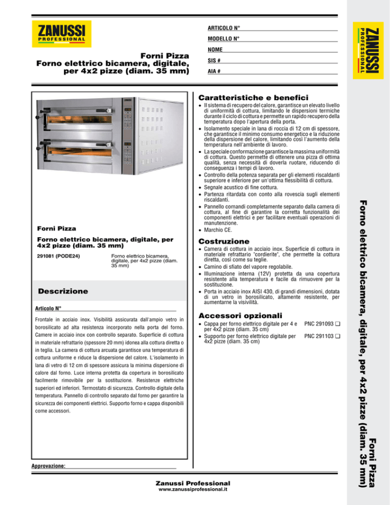 ARTICOLO N° MODELLO N° Forni Pizza Forno elettrico bicamera, digitale, per 4x2 pizze (diam. 35 mm) NOME SIS # AIA # Caratteristiche e benefici Forni Pizza Forno elettrico bicamera, digitale, per 4x2 pizze (diam. 35 mm) 291081 (PODE24) Forno elettrico bicamera, digitale, per 4x2 pizze (diam. 35 mm) Descrizione Costruzione • Camera di cottura in acciaio inox. Superficie di cottura in materiale refrattario "cordierite", che permette la cottura diretta, così come su teglie. • Camino di sfiato del vapore regolabile. • Illuminazione interna (12V) protetta da una copertura resistente alla temperatura e facile da rimuovere per la sostituzione. • Porta in acciaio inox AISI 430, di grandi dimensioni, dotata di un vetro in borosilicato, altamente resistente, per aumentarne la visivilità. Articolo N° Frontale in acciaio inox. Visibilità assicurata dall'ampio vetro in borosilicato ad alta resistenza incorporato nella porta del forno. Camere in acciaio inox con controllo separato. Superficie di cottura in materiale refrattario (spessore 20 mm) idonea alla cottura diretta o in teglia. La camera di cottura arcuata garantisce una temperatura di cottura uniforme e riduce la dispersione del calore. L'isolamento in lana di vetro di 12 cm di spessore assicura la minima dispersione di calore dal forno. Luce interna protetta da copertura in borosilicato facilmente rimovibile per la sostituzione. Resistenze elettriche superiori ed inferiori. Termostato di sicurezza. Controllo digitale della temperatura. Pannello di controllo separato dal forno per garantire la sicurezza dei componenti elettrici. Supporto forno e cappa disponibili come accessori. Accessori opzionali • Cappa per forno elettrico digitale per 4 e per 4x2 pizze (diam. 35 cm) • Supporto per forno elettrico digitale per 4x2 pizze (diam. 35 cm) Approvazione: Zanussi Professional www.zanussiprofessional.it PNC 291093 ❑ PNC 291103 ❑ Forni Pizza Forno elettrico bicamera, digitale, per 4x2 pizze (diam. 35 mm) • Il sistema di recupero del calore, garantisce un elevato livello di uniformità di cottura, limitando le dispersioni termiche durante il ciclo di cottura e permette un rapido recupero della temperatura dopo l'apertura della porta. • Isolamento speciale in lana di roccia di 12 cm di spessore, che garantisce il minimo consumo energetico e la riduzione della dispersione del calore, limitando così l'aumento della temperatura nell'ambiente di lavoro. • La speciale conformazione garantisce la massima uniformità di cottura. Questo permette di ottenere una pizza di ottima qualità, senza necessità di doverla ruotare, riducendo di conseguenza i tempi di lavoro. • Controllo della potenza separata per gli elementi riscaldanti superiore e inferiore per un'ottima flessibilità di cottura. • Segnale acustico di fine cottura. • Partenza ritardata con conto alla rovescia sugli elementi riscaldanti. • Pannello comandi completamente separato dalla camera di cottura, al fine di garantire la corretta funzionalità dei componenti elettrici e per facilitare eventuali operazioni di manutenzione. • Marchio CE. Forni Pizza Forno elettrico bicamera, digitale, per 4x2 pizze (diam. 35 mm) Fronte Elettrico Tensione di alimentazione: 291081 (PODE24) Potenza installata 400 V/3N ph/50/60 Hz 10.6 kW Informazioni chiave Dimensioni esterne, altezza: Dimensioni esterne, larghezza: Dimensioni esterne, profondità: Peso netto: Peso imballo: Altezza imballo: Larghezza imballo: Profondità imballo: Cicli di cottura - convezione Dimensioni interne, larghezza: Dimensioni interne, profondità: Dimensioni interne, altezza: VISTA LATERALE VISTA FRONTALE 784 mm 1155 mm 1050 mm 171 kg 200 kg 940 mm 1200 mm 1200 mm 400 °C 720 mm 720 mm 150 mm Alto VISTA LATERALE AO EI PIANTA EI = Connessione elettrica Lato Model: PODE24 s.n.: 291081 PIANTA VISTA POSTERIORE Model: PODE24 s.n.: 291081 VISTA LATERALE Forni Pizza Forno elettrico bicamera, digitale, per 4x2 pizze (diam. 35 mm) L'azienda si riserva il diritto di apportare modifiche ai prodotti senza preavviso 2016.05.17