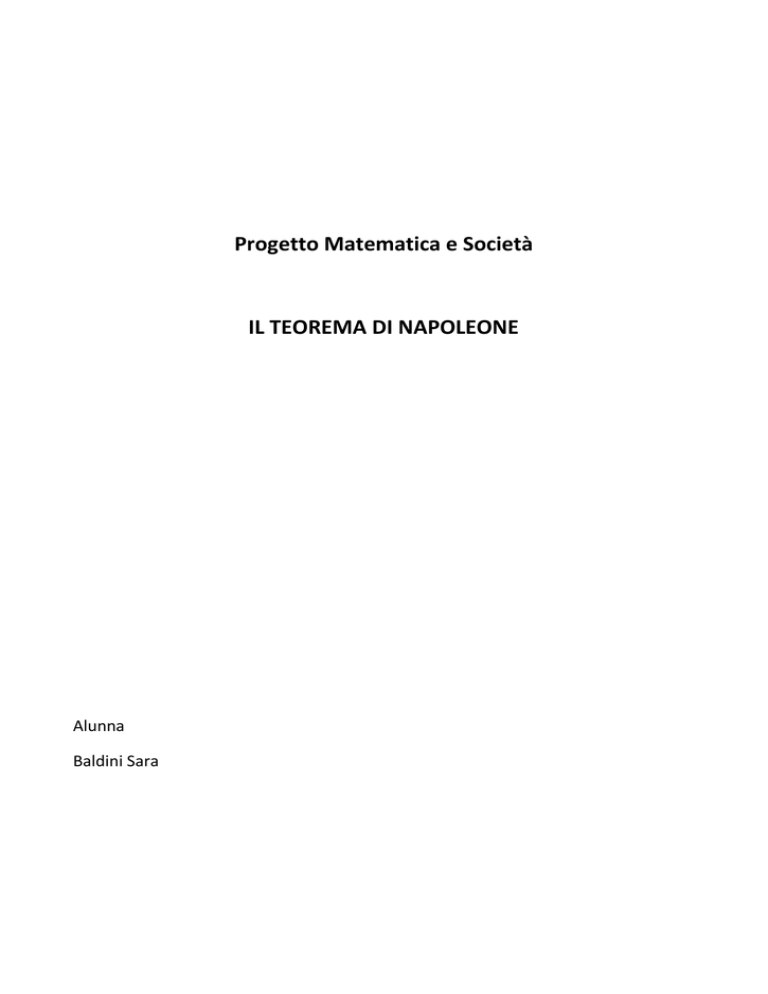 Progetto Matematica e Società IL TEOREMA DI NAPOLEONE Alunna Baldini Sara 1. Motivazioni Ho deciso di approfondire il teorema di Napoleone perché ritengo che sia un argomento che possa catturare l’attenzione degli studenti tramite l’utilizzo di Geogebra, infatti essi possono cimentarsi in prima persona a realizzare figure geometriche, quali i triangoli equilateri, isosceli, punto medio, asse del segmento e così via. Grazie a questo lato pratico gli alunni possono comprendere meglio la costruzione e la natura delle entità geometriche proposte. Inoltre reputo che il teorema sia un buono spunto per far riflettere sull’importanza della dimostrazione in matematica. L’idea del mio progetto è quella di creare un percorso didattico da sviluppare insieme ad una classe nell’arco dei cinque anni. Durante il primo anno seguirei il seguente schema: - Inquadrare il teorema all’interno del suo periodo storico; - Enunciare il teorema di Napoleone; - Costruire il triangolo di Napoleone con l’utilizzo di Geogebra e coinvolgere gli studenti in alcune attività riguardanti l’argomento proposto; - Fornire una dimostrazione con gli strumenti che conoscono. Negli anni successivi, proporrei agli studenti di cimentarsi in prima persona a dimostrare il teorema, perché possono applicare gli argomenti svolti a lezione, capendone meglio la loro importanza ed utilità. Ad esempio consiglierei agli studenti della classe quarta di fornire una dimostrazione che utilizza le funzioni trigonometriche, mentre a quelli della classe quinta una che prevede l’utilizzo dei numeri complessi. 2. Un po’ di Storia Analizzeremo il teorema di Napoleone, sul quale sono stati avanzati dubbi sulla paternità, sebbene sia noto che Napoleone Bonaparte avesse doti matematiche; infatti le sue biografie affermano: “Per i suoi insegnanti Napoleone era un allievo modello e promettente, specialmente in matematica (…). L’ispettore scolastico scrisse che l’attitudine di Napoleone per la matematica lo rendeva adatto alla marina, ma alla fine se decise che avrebbe dovuto tentare l’ingresso in artiglieria.” Nel 1796, durante la campagna di Italia, Napoleone incontrò il matematico italiano Lorenzo Mascheroni e fu subito affascinato dal suo libro “Geometria del compasso.” Si ritiene che il teorema di Napoleone sia in realtà opera di Mascheroni, ma che abbia voluto rendere omaggio all’imperatore. Un’ulteriore prova dell’interesse di Napoleone verso la matematica è il fatto che egli facesse parte dell’Ecole Polytechnique, la quale doveva formare ingegneri. Inoltre fu proprio per volontà di Napoleone che venne fondata la Scuola Normale di Pisa, che doveva formare professori, che a loro volta avrebbero istruito i migliori giovani più dotati del tempo. 3. Il teorema di Napoleone e Geogebra Teorema: Su ogni lato del triangolo arbitrario si costruisce un triangolo equilatero. Colleghiamo i centri di questi tre triangoli equilateri, otteniamo un triangolo equilatero. Grazie a Geogebra gli alunni possono rappresentare graficamente il teorema e verificarne subito la tesi. Adesso propongo alcune domande agli studenti. 1. Cosa succede se costruisco i triangoli internamente? Si può osservare che il teorema continua a valere. 2. E’ vero che il baricentro del triangolo di Napoleone coincide con il baricentro del triangolo iniziale? Grazie a Geogebra la risposta è immediata. A seguito della costruzione dei baricentri dei due triangoli gli alunni possono osservare che in realtà essi coincidono nel punto K. 3. Cosa possiamo osservare se costruiamo triangoli isosceli? Grazie all’utilizzo di Geogebra gli studenti possono notare che se uniamo i centri di questi tre triangoli isosceli, il nuovo triangolo non eredita la proprietà di essere isoscele. 4. Cosa possiamo osservare se costruiamo quadrati sui lati del triangolo? Grazie al fatto che possiamo spostare i vertici in Geogebra gli studenti possono congetturare che se il vertice A si avvicina al vertice B allora il triangolo di Napoleone tenda ad essere un triangolo rettangolo. 5. Cosa succede se i triangoli costruiti sono simili tra loro e sono nella stessa orientazione? Dopo vari tentativi gli studenti possono congetturare che esista una generalizzazione del teorema di Napoleone, cioè che la figura ottenuta con i centri dei triangoli costruiti sia a loro simile. 6. Si dicono tassellature i modi di ricoprire il piano con una o più figure geometriche ripetute all’infinito, senza sovrapposizioni. Si può utilizzare il teorema di Napoleone per ottenere una tassellatura del piano. Proporrei dunque agli studenti di creare la propria tassellatura. Si prova adesso a costruire una tassellatura del piano nel caso in cui sul triangolo di partenza si costruiscano quadrati. Si osserva che non è possibile eseguire la tassellatura del piano perché non otteniamo triangoli uguali, ad esempio il triangolo BRE non è congruente al triangolo di partenza ABC. 4. Dimostrazione Dopo aver presentato il teorema di Napoleone forniamo varie dimostrazioni da eseguire nell’arco dei cinque anni. L’utilizzo di Geogebra permette di compiere la seguente dimostrazione proprio al computer, perché richiede esclusivamente una rotazione di un angolo di 60°. Per questo motivo dopo aver posto le domande precedenti proporrei proprio ai ragazzi di seguire le seguenti istruzioni: Costruiamo un altro triangolo equilatero nel vertice A1. Ruotiamo la figura in senso antiorario di un angolo di 60° intorno a C; il triangolo originariamente centrato in B si sposta nella posizione occupata dal triangolo centrato in D. Allora i segmenti CB e CD sono di ugual lunghezza e formano un angolo di 60°. Nella stessa maniera, ruotando la figura in senso orario di un angolo di 60° intorno al vertice A, il triangolo originariamente centrato in B si sposta nella posizione che era occupata dal triangolo in D, così i segmenti AB e AD sono uguali e formano un angolo di 60°. Pertanto il segmento AC divide a