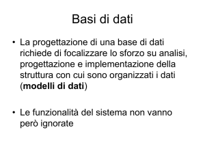 INTRODUZIONE ALLA TEORIA DEI DATABASE Autore: ing. Mauro Pullin 2 INDICE 1 INTRODUZIONE .......................................................................................................................3 2 SCHEMA DEL PERCORSO ...................................................................................................3 3 SVILUPPO DELLE LEZIONI ..................................................................................................4 3.1 3.2 3.3 3.4 LEZIONE 1 – LA MODELLAZIONE DEI DATI E LE ENTITÀ ........................................................4 LEZIONE 2 – LA CARDINALITÀ DELLE ASSOCIAZIONI............................................................7 LEZIONE 3 – ATTRIBUTI E CHIAVI PRIMARIE.........................................................................9 LEZIONE 4 – REGOLE DI DERIVAZIONE E CENNI SULLA NECESSITÀ DELLA NORMALIZZAZIONE..........................................................................................................................12 3.5 LEZIONE 5 – CONSIGLI, “TRUCCHI” E PRIME NOZIONI SULLA NORMALIZZAZIONE .............18 3 1 INTRODUZIONE La teoria dei database è un argomento molto vasto e la sua importanza è notevolissima, pertanto il ciclo di lezioni descritto nella presente dispensa riguarda esclusivamente l’introduzione alla tematica. La trattazione di seguito descritta si inserirà quindi in un percorso più ampio che prevede gli argomenti referenziati nella mappa concettuale di seguito rappresentata. Nella figura seguente, sono evidenziati con il colore giallo gli argomenti a cui ci si riferisce maggiormente nella presente dispensa. 2 SCHEMA DEL PERCORSO Per sviluppare il tema dell’introduzione alla teoria dei database, si è pensato di proporre gli argomenti di seguito elencati. • • Lezione 1 – La modellazione dei dati e le entità Lezione 2 – La cardinalità delle associazioni 4 • • • Lezione 3 – Attributi e chiavi primarie Lezione 4 – Regole di derivazione e cenni sulla necessità della normalizzazione Lezione 5 – Consigli, “trucchi” e prime nozioni sulla normalizzazione 3 SVILUPPO DELLE LEZIONI 3.1 Lezione 1 – La modellazione dei dati e le entità Fin dall’antichità l’uomo ha sempre avuto bisogno di memorizzare ed elaborare informazioni. Che fossero parole o numeri poco importava, quello che serviva era uno strumento per far sì che queste informazioni non fossero affidate solo alla memoria umana, ma continuassero ad esistere e ad essere disponibili a tutti. Prima dell’avvento dei computer l’unico supporto su cui era possibile memorizzare i dati era la carta (fogli, libri, ecc.) con tutte le limitazioni che essa comportava. Con l’introduzione dei computer le cose migliorarono decisamente, in quanto si cominciarono a studiare metodi e sistemi di gestione delle informazioni tali da ottimizzarne la ricerca e l’elaborazione. Si sentì quindi il bisogno di organizzare il contenuto dei file in maniera organica; perché ciò fosse possibile furono realizzati dei programmi che generavano database, vale a dire dei file in cui i dati erano memorizzati secondo precisi criteri di omogeneità e sequenzialità. Sulla base di tali criteri i suddetti programmi furono poi in grado di ricercare ed elaborare i dati con notevole velocità. In informatica, un’attività molto importante consiste nella modellazione dei dati. Modellare i dati significa costruire una rappresentazione semplificata della realtà osservata o di un problema riguardante – in genere – un’azienda, un ente pubblico o uno studio professionale, individuandone gli elementi caratterizzanti ed i legami intercorrenti tra essi. Riflettiamo su un fatto molto importante: in tutte le scienze applicate si è soliti procedere per modelli. Pensiamo, ad esempio, a come lavora un studio di architettura: si fa un modello su carta dell’edificio che si vuole costruire e questo modello è composto da vari disegni. Altro esempio: una casa automobilistica realizza il progetto della nuova automobile che intende mettere in produzione e anche questo progetto consiste in realtà in un modello, che viene esplicitato tramite un insieme di disegni. La progettazione di un modello di dati avviene a livelli diversi. • • • C’è, innanzi tutto, il livello concettuale, che rappresenta la realtà dei dati e le relazioni intercorrenti tra essi; lo si visualizza per mezzo di uno schema. Si passa poi al livello logico, che rappresenta il modo attraverso il quale i dati sono organizzati negli archivi elettronici: esso descrive, quindi, la composizione ed il formato dei dati nel loro aspetto di struttura logica di dati. Il livello logico viene derivato dal livello concettuale applicando alcune semplici regole di trasformazione. Alla fine si giunge al livello fisico, che rappresenta l’effettiva installazione degli archivi elettronici: esso indica l’ubicazione dei dati nelle memorie di massa (dischi). 5 Il livello fisico è quindi l’implementazione del livello logico sui supporti per la registrazione fisica dei dati: partizioni, puntatori, blocchi fisici, cluster, indici. L’attività di progettazione consente, prima di tutto, di costruire una rappresentazione astratta della realtà in modo indipendente dalla struttura dei dati. Fin dagli inizi l’informatica si occupò della memorizzazione elettronica di informazioni, ma non esistevano metodologie di progettazione degli archivi di dati e questo portava ad innumerevoli svantaggi e problemi. Un’analisi dettagliata di questi problemi portò il matematico Peter P. Chen – del Massachusetts Institute of Technology – a formulare, nel 1976, il modello Entità/Associazioni, in inglese Entity/Relationship. Si tratta di uno strumento per analizzare le caratteristiche di una qualsiasi realtà in modo indipendente dagli eventi che in essa accadono, cioè per costruire un modello concettuale dei dati indipendente dalle applicazioni, quindi indipendente dai programmi che con esso int