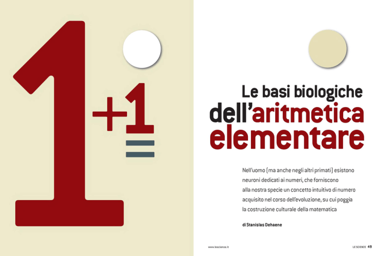 Le basi biologiche dell'aritmetica elementare Nell'uomo (ma anche negli altri primati) esistono neuroni dedicati ai numeri, che forniscono alla nostra specie un concetto intuitivo di numero acquisito nel corso dell'evoluzione, su cui poggia la costruzione culturale della matematica di Stanislas Dehaene www.lescienze.it LE SCIENZE 49 siste una verità matematica assoluta? Come fa il cervello umano, le cui capacità sono finite e il équipe, ha rilevato una diminuzione di sostanza grigia nel solco intraparietale in bambini che presentavano discalculia nel contesto di una sindrome di Turner (una patologia genetica caratterizzata da crescita ridotta, assenza di pubertà, e un leggero deficit mentale, soprattutto spaziale). Questo conforta l'ipotesi secondo cui una buona rappresentazione delle quantità nel solco intraparietale ha un ruolo essenziale nell'apprendimento dell'aritmetica da parte dei bambini. Questa area darebbe ai più piccoli una sorta di intuizione aritmetica, vale a dire la nozione di che cos'è un numero e di come si possono confrontare le quantità numeriche. Quando il solco intraparietale è leso, per un'anomalia genetica o in seguito a un incidente, il senso del numero si affievolisce e può comparire una discalculia. funzionamento fallibile, ad avere accesso a un sapere matematico universale? Molti matematici pensano che gli oggetti matematici abbiano un'esistenza autonoma e indipendente dalla mente umana. Il francese Charles Hermite (1822-1901), per esempio, scriveva: «I numeri e le funzioni non sono il prodotto arbitrario del nostro spirito. Esistono indipendentemente da noi, con lo stesso carattere di necessità degli oggetti della realtà obiettiva. Noi li scopriamo e li studiamo esattamente come fanno i fisici, i chimici e gli zoologi». Per un neurobiologo, questo è un punto di vista difficilmente sostenibile. Qual è la misteriosa materia di cui sarebbe costituita la realtà matematica? Che cosa potrebbe mai essere, se non il prodotto di una rete complessa e interconnessa di neuroni nel nostro cervello? Questa prospettiva biologica, tuttavia, lascia aperti importanti interrogativi. Come fa un cervello umano limitato e soggetto a errore, prodotto dalla selezione naturale, ad accedere a una verità matematica? E soprattutto, da dove proviene «l'irragionevole efficacia» - come la chiamava Eugene Wigner - della matematica? È la questione centrale che turbò Albert Einstein: «Com'è possibile che le matematiche, pur prodotte dal pensiero umano indipendentemente da qualsiasi esperienza, si adattino così perfettamente agli oggetti della realtà fisica?». Gli esperimenti sulla «cognizione numerica» condotti in diversi laboratori cercano di fare un po' di luce sull'origine degli oggetti matematici. Ma, a dispetto dei recenti progressi nel campo della psicologia e del neuroimaging, esaminare le basi cerebrali delle parti più avanzate della matematica è ancora difficile. Per questa ragione, cerchiamo di studiare il supporto cerebrale di uno dei fondamenti della matematica, il concetto di numero. Una delle scoperte più interessanti è che nel cervello dei primati esistono alcuni neuroni che sono dedicati ai numeri e che assicurano la rappresentazione di quantità approssimate. L'evoluzione ha quindi impresso nel nostro cervello il concetto di numero già da milioni di anni: ma se il concetto di numero approssimato è universale, quello di calcolo esatto non lo è. In effetti, vedremo che lo studio dei Munduruku - un popolo dell'Amazzonia il cui vocabolario contiene pochissime parole per designare i numeri e che non ha mai ricevuto insegnamenti di matematica - permette di discriminare la parte universale dell'aritmetica e quella acquisita culturalmente. Nella maggior parte degli esperimenti, le prestazioni degli animali migliorano quando aumenta la differenza tra i due numeri da confrontare (effetto distanza) e quando i numeri sono più piccoli (effetto dimensione). Ma è possibile assimilare la capacità degli animali di confrontare quantità alle capacità aritmetiche umane? Insieme ad altri gruppi di ricerca, abbiamo dimostrato che gli stessi effetti di distanza e di dimensione si manifestano quando si chiede a una persona di confrontare due numeri in cifre arabe: chiedendo qual è il maggiore tra due numeri, i soggetti sono più lenti quando le cifre sono 8 e 9 rispetto a quando sono 5 e 9. Lo stesso avviene quando si chiede di confrontare numeri a due cifre: l'effetto distanza è lo stesso di quando si mostrano due gruppi di oggetti. Recentemente, con Philippe Pinel, abbiamo studiato le basi neurologiche dell'effetto distanza usando la risonanza magnetica funzionale nel momento del confronto. Abbiamo così dimostrato che l'attivazione di un'area cerebrale nota come solco intraparietale (destro e sinistro) dipende dall'effetto distanza: l'attivazione diminuisce via via che aumenta la distanza tra i numeri da confrontare. Numerosi altri esperimenti di brain imaging effettuati su soggetti che eseguivano calcoli suggeriscono che una parte del solco intraparietale (il segmento orizzontale bilaterale) abbia un ruolo particolare nella rappresentazione delle quantità. Lo studio di pazienti con una lesione in quest'area (almeno in quella dell'emisfero sinistro) indica la presenza di gravi deficit nella comprensione dei numeri e delle capacità di calcolo (un deficit chiamato «acalculia»). Recentemente questa regione cerebrale è stata messa sotto accusa anche per la discalculia infantile, un disturbo dell'apprendimento delle capacità di calcolo che non è legato né a ritardo mentale né a fattori ambientali. Grazie alla risonanza magnetica funzionale, Nicolas Molko, della mia I neuroni dei numeri Come fanno i numeri a essere codificati da una popolazione di neuroni? Recentemente Andreas Nieder e Earl Miller, del Massachusetts Institute of Technology, hanno registrato l'attività cerebrale di scimmie addestrate a confrontare due insiemi di oggetti in base al nume