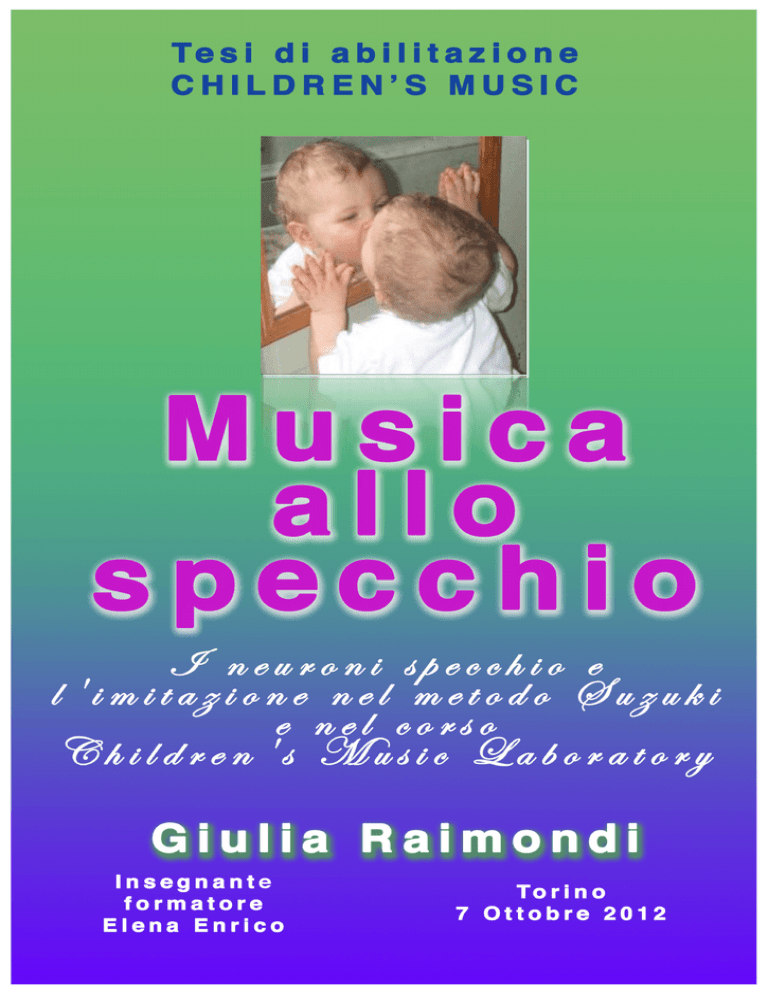 INDICE I. II. «FARSI UN’IDEA» I.1 Di cosa è fatto il cervello? I.2 I neuroni I.3 Struttura del cervello e sistema motorio I NEURONI SPECCHIO II.1 Scoperta, significato e funzionamento III. L’IMITAZIONE III.1 Che cos’è l’imitazione III.2 L’imitazione e i neuroni specchio III.3 «Quando copiare è difficile»: imitazione ed apprendimento III.4 L’imitazione nei bambini 3 4 6 11 20 22 23 25 IV. IL METODO SUZUKI, IL CORSO CHILDREN’S MUSIC LABORATORY E I NEURONI SPECCHIO IV.1 Il metodo Suzuki 29 IV.2 Il corso Children’s Music Laboratory 33 IV.3 L’imitazione nel metodo Suzuki e nel corso CML 34 IV.4 I neuroni specchio, il metodo Suzuki e il corso CML 38 CONCLUSIONI 42 APPENDICE 43 BIBLIOGRAFIA CARTACEA 50 FONTI E VIDEO CONSULTABILI ON LINE 51 2 I «FARSI UN’IDEA»1 I.1 DI COSA È FATTO IL CERVELLO? Anche il cervello, allo stesso modo degli altri organi, è formato da cellule aventi caratteristiche specifiche, dalle quali dipendono le funzioni di quell’organo. «Non è improbabile che nel futuro prossimo potremo spiegare come funziona il cervello (come, cioè, il cervello produce la mente) partendo dalle caratteristiche specifiche delle cellule specializzate che lo compongono; esattamente come siamo già in grado di fare per il rene, per il fegato, per il pancreas e così via. Ad oggi non riusciamo ancora a risalire dalle cellule che formano il cervello alle sue funzioni. Non si può però pensare di farsi un’idea del cervello senza conoscere, almeno nei loro aspetti generali, le caratteristiche strutturali e funzionali delle sue cellule.»2 Il cervello umano ed animale è composto da due tipi di cellule: neuroni e cellule gliali. Un neurone, o cellula nervosa, «è una cellula del nostro organismo specializzata nella trasmissione di impulsi da un luogo a un altro nel territorio del nostro corpo. Il neurone può interagire con altri neuroni e con cellule di supporto per formare quello che chiamiamo tessuto nervoso, cioè quella struttura biologica capace di comunicare informazioni a distanza. Proprio come lana intrecciata in un panno, il tessuto nervoso è un fitto reticolo di neuroni dove, attraverso la propagazione di impulsi elettrici e il rilascio di sostanze chiamate neurotrasmettitori, è possibile la comunicazione da un luogo all’altro del nostro corpo.»3 Il tessuto nervoso è organizzato a sua volta nel sistema nervoso suddiviso in due parti principali: sistema nervoso centrale (Snc) e sistema nervoso periferico (Snp). Il Snc è costituito da organi che elaborano, memorizzano e producono una risposta agli stimoli giunti attraverso la rete nervosa. Esso è formato dall’encefalo o cervello alloggiato nella scatola cranica e dal midollo spinale, prolungamento dell’encefalo che decorre nella colonna vertebrale. Il Snc controlla i movimenti muscolari, assembla ed interpreta tutte le informazioni sensoriali che arrivano dal sistema nervoso periferico (Snp) costituito da nervi motori e sensitivi. «Il sistema nervoso centrale riceve gli stimoli dal mondo esterno Ho scelto questo titolo per il primo capitolo della mia tesi abilitante prendendo spunto dalla collana di testi Farsi un’idea della casa editrice Il Mulino per un primo approccio scientifico, indispensabile al lettore per comprendere il “mondo” dei neuroni specchio. 1 2 Carlo Umiltà, Il cervello. La macchina della mente, Il Mulino, Bologna, 2011, p.35. 3 Matteo Rizzato e Davide Donelli, Io sono il tuo specchio, Edizioni Amrita, Torino, 2011, p.8. 3 grazie all’attività del sistema nervoso periferico (Snp), il quale è a sua volta in parte controllato dal sistema nervoso centrale.»4 Il Snp è posto fuori dai contenitori ossei ed è costituito dalle fibre nervose che dal Snc si diramano nell’organismo. Esso «è formato dai centri nervosi (gangli), che elaborano gli stimoli involontari, e dai nervi che trasmettono gli impulsi che regolano le funzioni fisiologiche indipendentemente dalla nostra volontà.»5 Il Snp è suddiviso in due parti: il sistema nervoso somatico (Sns) ed il sistema nervoso autonomo (Sna). Grazie alla trasmissione nervosa, i nervi periferici consentono alle diverse parti del corpo di comunicare tra loro in modo rapido ed efficace. I.2 I NEURONI I neuroni, o cellule nervose, sono composti da un corpo centrale o soma, un assone e numerosi dendriti. Il corpo centrale o corpo cellulare è la sede del nucleo con il DNA della cellula «e contiene tutte le strutture indispensabili alla vita della cellula e al corretto svolgimento della sua funzione.»6 Dal corpo cellulare di ogni neurone si diramano numerosi dendriti ed un’unica altra estensione molto più lunga (anche molto più lunga rispetto alla dimensione della cellula) e sottile, nota con il termine di assone. Esso è caratterizzato da una parte finale “ramificata in “bottoni” che entrano in contatto con altri neuroni o con cellule di altro tipo. È la parte del neurone che manda le informazioni verso gli altri neuroni o verso cellule che svolgono un compito su segnale del neurone (come, ad esempio, una cellula muscolare).»7 Per quanto riguarda i dendriti invece, essi «sono prolungamenti molto ramificati, simili alle radici di un albero, vicini al corpo cellulare. Molto più brevi rispetto all’assone, possono entrare in contatto con i bottoni terminali degli assoni di altri neuroni, con altri neuroni direttamente, o costituire le terminazioni sensitive primarie (quelle terminazioni da cui partono gli stimoli sensitivi come tatto, dolore, vista, eccetera).»8 Essi ricevono le informazioni da altre cellule nervose. Il corpo cellulare (inclusi dendriti ed assoni) è costituito da una sostanza semiliquida «circondata da una pellicola (membrana) che le impedisce di disperdersi e la separa dall’ambiente»9. I neuroni Giacomo Rizzolatti e Lisa Vozza, Nella mente degli altri - Neuroni specchio e comportamento sociale, Zanichelli, Bologna, 2012, p.11. 4 5 AA.VV, Anatomia, Atlanti Scientifici Giunti, Giunti, 2007. 6 I