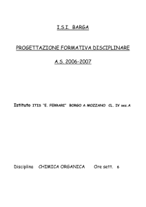 ISTITUTO TECNICO INDUSTRIALE PER CHIMICI DI MANCIANO Via Campolmi,1 – 58014 Manciano (GR) PROGRAMMA DIDATTIC O DISCIPLINA: CHIMICA ORGANICA, BIO-ORGANICA, DELLE FERMENTAZIONI E LABORATORIO CLASSE: IV INSEGNANTE: prof. Giovanni ROMEO ANNO SCOLASTICO: 2010 – 2011 I contenuti della disciplina saranno trattati secondo il percorso modulare di seguito riportato in tabella. UD Modulo tempi di realizzazione 1 1 Gruppi funzionali 2 3 1 2 Polimeri e stereochimica 2 1 3 Macromolecole Organiche 1 2 1 4 Macromolecole Organiche 2 2 Ripasso dei gruppi funzionali (programma terzo anno) settembre Aldeidi e chetoni ottobre Acidi carbossilici e derivati degli acidi carbossilici ottobre - novembre Stereochimica dicembre Polimeri gennaio Lipidi febbraio Carboidrati febbraio - marzo Amminoacidi aprile Proteine maggio – giugno Di seguito in elenco si riportano i contenuti di ciascuna unità didattica. • • Modulo 1 – UD 1 – Riepilogo gruppi funzionali (programma del terzo anno). Gli idrocarburi e g li alcani, reazione di alogenazione degli alcani. Gli alcheni e gli alchini, reazione di addizione elettrofila. Gli idrocarburi aromatici e la reazione di sostituzione in serie aromatica. Gli alogenuri e gli alcoli e le reazioni di sostituzione nucleofila al carbonio saturo. I composti di Grignard. Le ammine. Regole di nomenclatura. Modulo 1 – UD 2 – Aldeidi e chetoni. Caratteristiche chimico-fisiche e reattività del gruppo carbonilico. Reazioni di addizione nucleofila al ITI Manciano A.S. 2010-11 Classe IV Disciplina: Chimica Organica, Bio-organica, delle Fermentazioni e Laboratorio • • • • Programmazione didattica carbonile. L’acidità dell’idrogeno sul carbonio in al carbonile. Tautomeria cheto – enolica. La condensazione aldolica. Modulo 1 – UD 3 – Acidi carbossilici e derivati degli acidi carbossilici. Caratteristiche chimico-fisiche degli acidi carbossilici. Acidità in relazione alla presenza di sostituenti elettronattrattori e elettrondonatori. Legame idrogeno intra e intermolecolare. Preparazione con metodi ossidativi e per reazione dei Grignard su CO2. La sostituzione acilica. Sintesi dei derivati cloruri acilici ,anidridi, esteri e ammidi. Reazioni di Claisen. Modulo 2 – UD 1 – Stereochimica. Ripasso isomeria (programma del 3° anno). Chiralità ed attività ottica. Il polarimetro. Molecole con più di un centro asimmetrico. Formule di Fisher. Configurazioni assolute R, S. Modulo 2 – UD 2 – Polimeri. Monomeri e polimeri. La struttura delle macromolecole. Reazioni di polimerizzazione. Provenienza e settore di impiego dei polimeri. I polimeri e l’ambiente: meccanismi di degradazione dei polimeri. Modulo 3 – UD 1 – Lipidi. I grassi e gli oli: i triesteri del glicerolo. Idrogenazione degli oli vegetali. Saponificazione dei trigliceridi:il sapone. Come agiscono i saponi ed i detergenti sintetici. I fosfolipidi. Cenni alla composizione della membrana cellulare Modulo 3 – UD 2 – Carboidrati. Nomenclatura dei glucidi: aldosi e chetosi, serie D e L, determinazione dei C chirali e dei diversi enantiomeri ottici. Ciclizzazione nella forma emiacetalica con strutture piranosiche e furanosiche e formazione degli OH anomerici alfa e beta. Proprietà ottiche degli zuccheri e concetto di mutarotazione. Formazione del legame glicosidico nei disaccaridi e nei polisaccaridi, struttura di amido e cellulosa e caratteristiche biochimiche del legame alfa e beta glicosidico. Saggio di Fehling e Tollens nel riconoscimento degli zuccheri riducenti e non riducenti. Utilizzo delle reazioni di metilazione per la determinazione delle strutture di disaccaridi e polisaccaridi. Reazioni ossidative con Br2 e acido nitrico e riduttive con sodio-boro- idruro. Modulo 4 – UD 1 – Amminoacidi. Struttura degli L e D aminoacidi e caratteristiche di acidità, basicità e polarità delle catene laterali R. Punto isoelettrico di un aminoacido acido, basico e neutro, relative dissociazioni in funzione del pH e utilizzo di tali proprietà nella tecnica di separazione elettroforetica. Principali amminoacidi essenziali e non. Modulo 4 – UD 2 – Proteine. Legame peptidico e struttura primaria di un polipeptide. Strutture secondarie ad alfa elica, beta foglietto e collegamenti con le caratteristiche di estensibilità di alcune proteine naturali quali la lana e la seta. Struttura terziaria e superavvolgimenti nelle proteine globulari caratteristiche strutturali di alcuni enzimi. Libro di testo Manciano 23.10.2010 Titolo: Chimica Organica Biochimica e Laboratorio Autori: Valitutti, Fornari e Gando Casa editrice: Zanichelli L’insegnante: Giovanni ROMEO _______________________