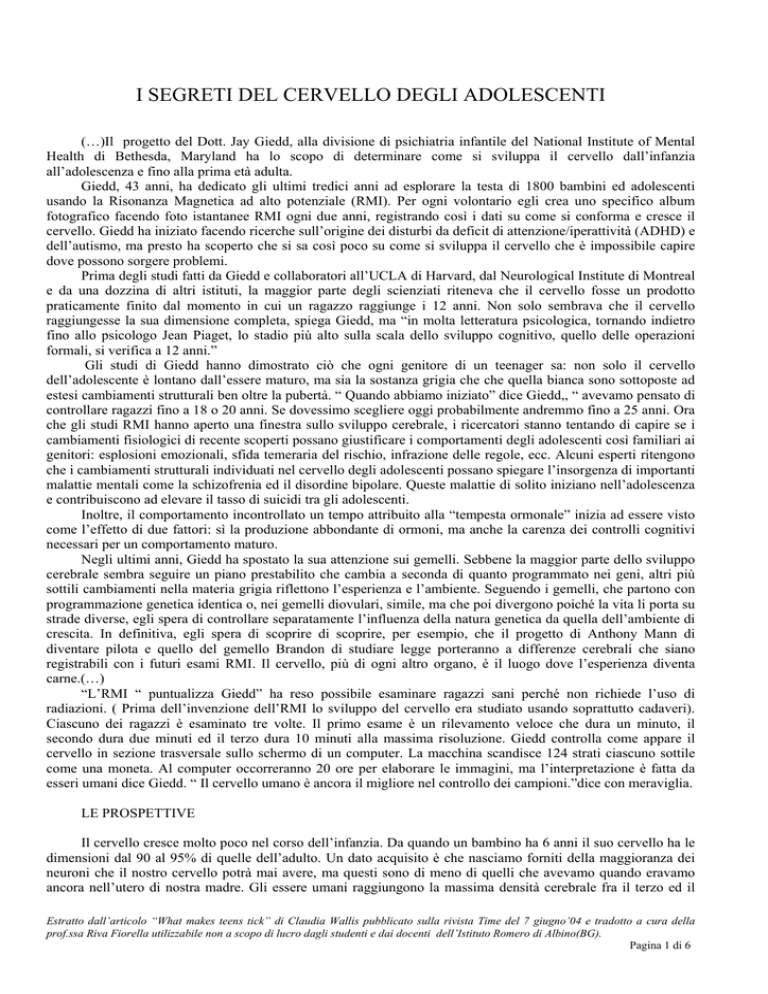 I SEGRETI DEL CERVELLO DEGLI ADOLESCENTI (…)Il progetto del Dott. Jay Giedd, alla divisione di psichiatria infantile del National Institute of Mental Health di Bethesda, Maryland ha lo scopo di determinare come si sviluppa il cervello dall’infanzia all’adolescenza e fino alla prima età adulta. Giedd, 43 anni, ha dedicato gli ultimi tredici anni ad esplorare la testa di 1800 bambini ed adolescenti usando la Risonanza Magnetica ad alto potenziale (RMI). Per ogni volontario egli crea uno specifico album fotografico facendo foto istantanee RMI ogni due anni, registrando così i dati su come si conforma e cresce il cervello. Giedd ha iniziato facendo ricerche sull’origine dei disturbi da deficit di attenzione/iperattività (ADHD) e dell’autismo, ma presto ha scoperto che si sa così poco su come si sviluppa il cervello che è impossibile capire dove possono sorgere problemi. Prima degli studi fatti da Giedd e collaboratori all’UCLA di Harvard, dal Neurological Institute di Montreal e da una dozzina di altri istituti, la maggior parte degli scienziati riteneva che il cervello fosse un prodotto praticamente finito dal momento in cui un ragazzo raggiunge i 12 anni. Non solo sembrava che il cervello raggiungesse la sua dimensione completa, spiega Giedd, ma “in molta letteratura psicologica, tornando indietro fino allo psicologo Jean Piaget, lo stadio più alto sulla scala dello sviluppo cognitivo, quello delle operazioni formali, si verifica a 12 anni.” Gli studi di Giedd hanno dimostrato ciò che ogni genitore di un teenager sa: non solo il cervello dell’adolescente è lontano dall’essere maturo, ma sia la sostanza grigia che che quella bianca sono sottoposte ad estesi cambiamenti strutturali ben oltre la pubertà. “ Quando abbiamo iniziato” dice Giedd,, “ avevamo pensato di controllare ragazzi fino a 18 o 20 anni. Se dovessimo scegliere oggi probabilmente andremmo fino a 25 anni. Ora che gli studi RMI hanno aperto una finestra sullo sviluppo cerebrale, i ricercatori stanno tentando di capire se i cambiamenti fisiologici di recente scoperti possano giustificare i comportamenti degli adolescenti così familiari ai genitori: esplosioni emozionali, sfida temeraria del rischio, infrazione delle regole, ecc. Alcuni esperti ritengono che i cambiamenti strutturali individuati nel cervello degli adolescenti possano spiegare l’insorgenza di importanti malattie mentali come la schizofrenia ed il disordine bipolare. Queste malattie di solito iniziano nell’adolescenza e contribuiscono ad elevare il tasso di suicidi tra gli adolescenti. Inoltre, il comportamento incontrollato un tempo attribuito alla “tempesta ormonale” inizia ad essere visto come l’effetto di due fattori: sì la produzione abbondante di ormoni, ma anche la carenza dei controlli cognitivi necessari per un comportamento maturo. Negli ultimi anni, Giedd ha spostato la sua attenzione sui gemelli. Sebbene la maggior parte dello sviluppo cerebrale sembra seguire un piano prestabilito che cambia a seconda di quanto programmato nei geni, altri più sottili cambiamenti nella materia grigia riflettono l’esperienza e l’ambiente. Seguendo i gemelli, che partono con programmazione genetica identica o, nei gemelli diovulari, simile, ma che poi divergono poiché la vita li porta su strade diverse, egli spera di controllare separatamente l’influenza della natura genetica da quella dell’ambiente di crescita. In definitiva, egli spera di scoprire di scoprire, per esempio, che il progetto di Anthony Mann di diventare pilota e quello del gemello Brandon di studiare legge porteranno a differenze cerebrali che siano registrabili con i futuri esami RMI. Il cervello, più di ogni altro organo, è il luogo dove l’esperienza diventa carne.(…) “L’RMI “ puntualizza Giedd” ha reso possibile esaminare ragazzi sani perché non richiede l’uso di radiazioni. ( Prima dell’invenzione dell’RMI lo sviluppo del cervello era studiato usando soprattutto cadaveri). Ciascuno dei ragazzi è esaminato tre volte. Il primo esame è un rilevamento veloce che dura un minuto, il secondo dura due minuti ed il terzo dura 10 minuti alla massima risoluzione. Giedd controlla come appare il cervello in sezione trasversale sullo schermo di un computer. La macchina scandisce 124 strati ciascuno sottile come una moneta. Al computer occorreranno 20 ore per elaborare le immagini, ma l’interpretazione è fatta da esseri umani dice Giedd. “ Il cervello umano è ancora il migliore nel controllo dei campioni.”dice con meraviglia. LE PROSPETTIVE Il cervello cresce molto poco nel corso dell’infanzia. Da quando un bambino ha 6 anni il suo cervello ha le dimensioni dal 90 al 95% di quelle dell’adulto. Un dato acquisito è che nasciamo forniti della maggioranza dei neuroni che il nostro cervello potrà mai avere, ma questi sono di meno di quelli che avevamo quando eravamo ancora nell’utero di nostra madre. Gli essere umani raggiungono la massima densità cerebrale fra il terzo ed il Estratto dall’articolo “What makes teens tick” di Claudia Wallis pubblicato sulla rivista Time del 7 giugno’04 e tradotto a cura della prof.ssa Riva Fiorella utilizzabile non a scopo di lucro dagli studenti e dai docenti dell’Istituto Romero di Albino(BG). Pagina 1 di 6 sesto mese di gestazione- il periodo di culminazione dell’esplosiva crescita neuronale prenatale. Durante i mesi finali prima della nascita, il nostro cervello subisce una drammatica riduzione durante la quale le cellule cerebrali non necessarie sono eliminate. Molti neuroscienziati ora credono che l’autismo sia il risultato di una insufficiente o anomala distruzione di cellule cerebrali nel periodo prenatale. Ciò che gli studi a lungo termine di Giedd hanno documentato è che c’è una seconda ondata di proliferazione seguita da una riduzione che si verifica più tardi nell’infanzia e che la parte critica finale di questa seconda ondata avviene nella tarda adolescenza. Al