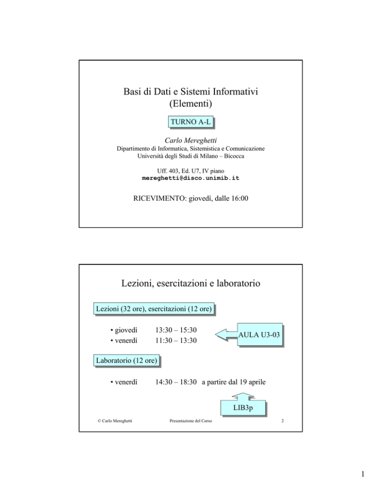 Basi di Dati e Sistemi Informativi (Elementi) TURNO TURNOA-L A-L Carlo Mereghetti Dipartimento di Informatica, Sistemistica e Comunicazione Università degli Studi di Milano – Bicocca Uff. 403, Ed. U7, IV piano [email protected] RICEVIMENTO: giovedì, dalle 16:00 Lezioni, esercitazioni e laboratorio Lezioni Lezioni(32 (32ore), ore),esercitazioni esercitazioni(12 (12ore) ore) • giovedì • venerdì 13:30 – 15:30 11:30 – 13:30 AULA AULAU3-03 U3-03 Laboratorio Laboratorio(12 (12ore) ore) • venerdì 14:30 – 18:30 a partire dal 19 aprile LIB3p LIB3p © Carlo Mereghetti Presentazione del Corso 2 1 Programma del corso Basi di Dati e Sistemi Informativi (Elementi) Introduzione. Introduzione.Concetti Concettigenerali. generali.Sistemi Sistemiinformativi, informativi,sistemi sistemiorganizzativi organizzativieesistemi sistemiinformatici. informatici. Tipologie Tipologieed edesempi esempididisistemi sistemiinformativi. informativi.Concetto Concettodidiinformazione informazioneeedato. dato.Introduzione Introduzioneaabasi basididi dati e DBMS, modello dei dati, concetto di schema e istanza. Indipendenza logica e fisica dati e DBMS, modello dei dati, concetto di schema e istanza. Indipendenza logica e fisicadei deidati datiee tipologia tipologiadidilinguaggi linguaggiper perbasi basidididati. dati. IlIlmodello modellorelazionale. relazionale. Modelli Modellilogici. logici.Modello Modellorelazionale: relazionale:relazioni relazionieetabelle, tabelle,schemi schemied edistanze, istanze, informazione informazioneincompleta incompletaeevalori valorinulli, nulli,chiavi, chiavi,vincoli vincolididiintegrità. integrità. Linguaggi Linguaggi didi interrogazione. interrogazione. Algebra Algebra relazionale: relazionale: operatori operatori didi base base ee operatori operatori derivati. derivati. Interrogazioni Interrogazioniininalgebra algebrarelazionale relazionaleed edequivalenza equivalenzadidiespressioni espressionialgebriche algebriche SQL. SQL.Definizione Definizionedei deidati datiininSQL. SQL.Definizione Definizionedidiinterrogazioni interrogazioniininSQL: SQL:interrogazioni interrogazionisemplici, semplici, con conoperatori operatoriinsiemistici, insiemistici,nidificate nidificateeecon conraggruppamento. raggruppamento.Operazioni Operazionididiinserimento, inserimento,modifica modificaee cancellazione. cancellazione. Definizione Definizione didi viste. viste. Cenni Cenni sull’integrazione sull’integrazione didi SQL SQL nei nei linguaggi linguaggi didi programmazione. programmazione. La Laprogettazione progettazioneconcettuale. concettuale.Metodologie Metodologie didiprogettazione progettazione didi basi basi didi dati. dati.IlIl modello modello EntitàEntitàRelazione. Relazione. La Laprogettazione progettazionelogica. logica.Ristrutturazione Ristrutturazioneschemi schemiE-R: E-R:eliminazione eliminazionedelle dellegerarchie, gerarchie,degli degliattributi attributi composti compostieemultivalore. multivalore.Traduzione Traduzioneda daschemi schemiE-R E-Raaschemi schemi relazionali. relazionali.Problemi Problemicausati causatidalle dalle ridondanze ridondanze(normalizzazione): (normalizzazione):anomalie, anomalie,dipendenze dipendenzefunzionali, funzionali,forme formenormali normalieedecomposizioni. decomposizioni. © Carlo Mereghetti Presentazione del Corso 3 Fonti bibliografiche ed altro materiale Libro Librodi ditesto testo P. Atzeni, S. Ceri, S. Paraboschi, R. Torlone “Basi di dati: concetti, linguaggi e architetture” Seconda edizione, McGraw-Hill Italia, 1999 Lucidi Lucidi Disponibili al sito del corso http://docet.disco.unimib.it/~mereghetti/db.html http://docet.disco.unimib.it/~mereghetti/db.html Lucidi, Lucidi,esercizi, esercizi,temi temid’esame d’esamesvolti, svolti,programmi, programmi,avvisi, avvisi,esiti, esiti,… … © Carlo Mereghetti Presentazione del Corso 4 2 Esame SCRITTO SCRITTO Regolare oppureDue Duecompitini compitiniÆ Ævoto voto==media media Regolareoppure Voto Votodello dello scritto scritto 0 17 Ripetere Ripetere © Carlo Mereghetti 18 23 Orale Orale obbligatorio obbligatorio Presentazione del Corso 24 30 Verbalizzare; Verbalizzare; possibilità possibilitàdidi sostenere sostenerel’orale l’orale 5 3