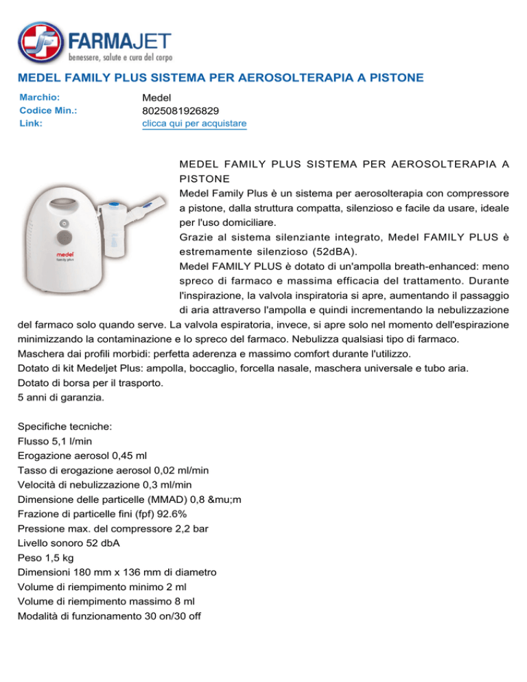 MEDEL FAMILY PLUS SISTEMA PER AEROSOLTERAPIA A PISTONE Marchio: Codice Min.: Link: Medel 8025081926829 clicca qui per acquistare MEDEL FAMILY PLUS SISTEMA PER AEROSOLTERAPIA A PISTONE Medel Family Plus è un sistema per aerosolterapia con compressore a pistone, dalla struttura compatta, silenzioso e facile da usare, ideale per l'uso domiciliare. Grazie al sistema silenziante integrato, Medel FAMILY PLUS è estremamente silenzioso (52dBA). Medel FAMILY PLUS è dotato di un'ampolla breath-enhanced: meno spreco di farmaco e massima efficacia del trattamento. Durante l'inspirazione, la valvola inspiratoria si apre, aumentando il passaggio di aria attraverso l'ampolla e quindi incrementando la nebulizzazione del farmaco solo quando serve. La valvola espiratoria, invece, si apre solo nel momento dell'espirazione minimizzando la contaminazione e lo spreco del farmaco. Nebulizza qualsiasi tipo di farmaco. Maschera dai profili morbidi: perfetta aderenza e massimo comfort durante l'utilizzo. Dotato di kit Medeljet Plus: ampolla, boccaglio, forcella nasale, maschera universale e tubo aria. Dotato di borsa per il trasporto. 5 anni di garanzia. Specifiche tecniche: Flusso 5,1 l/min Erogazione aerosol 0,45 ml Tasso di erogazione aerosol 0,02 ml/min Velocità di nebulizzazione 0,3 ml/min Dimensione delle particelle (MMAD) 0,8 μm Frazione di particelle fini (fpf) 92.6% Pressione max. del compressore 2,2 bar Livello sonoro 52 dbA Peso 1,5 kg Dimensioni 180 mm x 136 mm di diametro Volume di riempimento minimo 2 ml Volume di riempimento massimo 8 ml Modalità di funzionamento 30 on/30 off