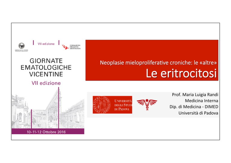 Neoplasie mieloprolifera-ve croniche: le «altre» Le eritrocitosi Prof. Maria Luigia Randi Medicina Interna Dip. di Medicina -­‐ DIMED Università di Padova ♂ Hb > 165 g/L o Ht > 49% ♀ Hb > 160 g/L o Ht > Eritrocitosi 48% Rela?ve • • • • • Disidratazione Stress Terapia diure?ca Us?oni Neonatalità Assolute Acquisite • Policitemia Vera (PV) • Al?tudine • MalaOe polmonari croniche ostruOve • Shunt cardiovascolari • OSAS • Tabagismo • MalaOe renali • Tumori (HCC, polmone, ovaio) • Androgeni • Neonatalità • Doping Congenite • PFCP (Mutazioni EPO-­‐R) • Mutazioni in OSP (VHL, HIF2α, PHD2) • Metaemoglobinemia • Hb alta affinità per O2 • DifeO del 2,3 bifosfoglicerato ERITROCITOSI IDIOPATICA McMullin MF. Ther Adv Hematol. 2012;3: 391–8. Eritropoiesi normale EritropoieHna (Epo) • • • Progenitori eritroidi prodo[a dalle cellule di: fegato fetale rene (cells cor?cali peritubulari) la produzione è s?molata dall’ ipossia il suo rece[ore (EPOR) è presente sulle cellule del clone eritroide EPOR STAT5 Eritroci? SHP Target genes Targ et gene nucleus s Eritrocitosi secondarie acquisite Aumentata produzione di Epo fisiologicamente appropriata • Al?tudine • Mal Polmonari croniche ostruOve • Shunt cardiovascolari • Sindrome di Pickwick • OSAS • Tabagismo Aumentata produzione di Epo fisiologicamente inappropriata • MalaOe renali • • • • cis? idronefrosi trapianto Tumori Eritropoiesi normale Epo Cell renali peritubulari Progenitori eritroidi DEGRADATION HIF2α PHD2 O2 HIF2α Normoxia EPOR HIF2α HIF2β HIFβ HIF2α STAT5 Hypoxia Eritroci? VHL OH Target genes nucleus SHP Target Targ genes et nucleus gene s Mutazioni GERM LINE idenHficate nelle eritrocitosi congenite Epo Cell renali peritubulari HBB, AB1, ABA2, PBM ECTY3 EGNL1 Progenitori eritroidi DEGRADATION HIF2α PHD2 O2 HIF2α Normoxia VHL OH HIF2α ECTY2 VHL HIFβ HIF2α ECTY4 EPAS1 Hypoxia EPOR EPOR Target genes nucleus STAT5 SHP Target Targ genes et nucleus gene s Eritroci? Di fronte ad una eritrocitosi assoluta … • Escludere le cause acquisite • Escludere emoglobine patologiche • Escludere metemoglobinemia Epos È JAK2V617F o ex12 JAK2-­‐WT Epos È PV Epos N/Ç OSP EPOR VHL PHD2 HIF2α Randi ML, et al. Ann Hematol 2016;95;233-­‐7 Eritrocitosi congenite: classificazione OMIM gene proteina cromosoma Trasmissione Alterazione della funzione proteica Tipo 1 PFCP EPOR EPOR 19p13.2 dominante Perdita controllo nega?va Tipo 2 Van Hippel VHL Lindau (VHL) 3p25.3 recessiva Impedisce degradazione di HIF /N Tipo 3 EGLN1 PHD2 1q42.1 dominante Perdita idrossilazione di HIF /N Tipo 4 EPAS1 HIF2 alfa 2p21 dominante Perdita di parte del complesso HIF2 /N Emoglobina 11p15.4; 16p13.3 dominante Alterata dissociazione O2/Hb N/ Hb ad alta HBB, HBA affinità per O2 Epo Modificata da Bento C. et al, Hum Mut 2013 Eritrocitosi Hpo 2 (VHL) Mutazioni di geni EPOR e della OSP coinvol? nelle eritrocitosi Esperienza di Padova Gene N° paHenH Gene EPOR 26 VHL 55 EPOR PHD2 28 HIF2a 15 TOTAL 124 Modified from Bento et al, Human Mut 2013;35:15-­‐26 VHL PHD2 HIF2α Mutazioni (9 / 106) 1 pat C338Y Peroni E, et al, BJH 2016 1 pat T341M 2 pats R200W (Chuvash) 1 pat R82C Randi ML, et al Haematologica 2005 1 pat G144R 1 pat G349S 1 pat R550W 1 pat R602Q Peroni E, et al: SIE, 2015 ~9% dei casi da noi esploraH 125 erythrocyto?c pa?ents Iron overload Emocromatosi Secondaria • Anemie emoli?che croniche • Eccessivo introito di ferro • Eritropoiesi inefficace • Epa?te C • Cirrosi Alcolica • Porfiria cutanea tarda • Aceruloplasminemia • Shunt porto-­‐cava • NAFLD Emocromatosi Primaria • • • • • Tipo 1 HFE Tipo 2A HJV 2B HAMP Tipo 3 TfR2 Tipo 4 Ferropor?na Yun, S., & Vincele[e, N. D. (2015). Crit Rev Oncol/Hematol, 95, 12–25. Totali N° pazien? Italia/GB Maschi (%) 56 18/38 44 (78.6) Età media alla diagnosi ± SD (anni) 47 ± 14 Media Hb alla diagnosi ± SD (g/L) 190 ± 18 Media Ht alla diagnosi ± SD (%) Media GB alla diagnosi ± SD (x109/l) Media MCV alla diagnosi ± SD (x109/l) 55 ± 6 8.1 ± 2.3 94 ± 7 Media Piastrine alla diagnosi ± SD (x109/l) 223 ± 65 Media EPO alla diagnosi ± SD (UI) 7.0 ± 4.1 Media Ferri?na alla diagnosi ± SD (µg/L) 227.7 ± 202.5 Popolazione generale Europa 34.9% Italia 24.2 % Gran Bretagna 32.3% p = 0.048 Merryweather-­‐Clarke, AT., et AL. J Med Genet 1997;34: 275–278. 25/56 pazienH con eritrocitosi = 44.6% almeno 1 allele di HFE mutato BiageO et al, BJH submi[ed E quando non si capisce l’eziologia dell’eritrocitosi … Eritrocitosi IdiopaHca Prevalenza stimata di EI = 1.1 casi per 1000 persone, Valutata in una coorte prospettica di 10.000 soggetti sani. EI è circa 4 volte più frequente di PV nella popolazione generale Ruggeri M. et al, Ann Int Med 2003 2009 2008 Cara[eris?che di 230 pazien? con eritrocitosi alla diagnosi PV EI FE p EI vs PV p FE vs PV 136 78 21 -­‐ - 73 (53,7) 66 (84,6) 16 (76,2) < 0.001 0.05 Età media alla diagnosi (aa) 60,5 ±15.3 53,6 ±15.3 24 ± 20 < 0.001 <0.001 Hb (g/L) 167 ± 26 181,2 ± 10,7 183 ± 20 < 0.001 0,001 HT (%) 51,7 ± 7,7 53,5 ± 2,3 53,6 ± 7,5 0.01 0,01 WBC (x109/L) 10,48 ± 4.7 7,8 ± 2,5 8,1 ± 3,7 < 0.001 0.003 Plts (x109/L) 567 ± 18 212 ± 57 236 ± 74 < 0.001 <0.01 sEPO (UI/L) 6,3 ± 5,3 12.9 ± 7,7 - < 0.001 - Splenomegalia (%) 81 (60) 16 (19) 5/16 < 0.001 0.03 Trombosi (%) 38 (30) 6 (7,8) 0/21 < 0.001 0.02 N° di pazienti Maschi (%) Thrombosis free survival • Nessuna evoluzione in mielofibrosi o leucemia acuta • Nessuna progressione in policitemia vera tra i 28 (35.9 %) pazien? con follow-­‐up >5 anni nè nei 12 (8.3%) con FU >10 anni. Analisi mul?variata per predire una PV Conta piastrine elevata, trombosi e splenomegalia sono fa[ori prediOvi indipenden? di PV. Mantenere l’ematocrito < 45% Salassi Barbui T et al, NEJM 2013 PV EI p 26 25 -­‐ 23/3 22/3 -­‐ Età (y) 63 ± 15 55 ± 18 -­‐ Hb (g/L) 178 ± 23 177 ± 16 NS Ht (%) 55 ± 4,2 54 ± 3,8 NS WB