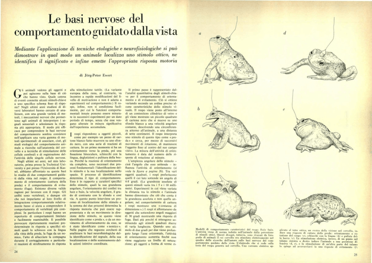 Le basi nervose del comportamento guidato dalla vista Mediante l'applicazione di tecniche etologiche e neurofisiologiche si può dimostrare in qual modo un animale localizza uno stimolo ottico, ne identifica il significato e infine emette l'appropriata risposta motoria di Jiirg-Peter Ewert li animali vedono gli oggetti e poi agiscono sulla base di ciò G che hanno visto. Quale catena di eventi connette alcuni stimoli-chiave a uno specifico schema fisso di risposte? Negli ultimi anni studiosi di diversi laboratori hanno cercato di analizzare, con una grande varietà di metodi, i meccanismi nervosi che permettono agli animali di interpretare i segnali sensoriali e selezionare la risposta più appropriata. Il modo più efficace per comprendere le basi nervose del comportamento sembra consistere nell'applicare una vasta gamma di metodi sperimentali: di associare, cioè, gli studi etologici del comportamento animale a ricerche sull'anatomia del cervello e a tecniche di stimolazione delle cellule cerebrali e di registrazione dell'attività delle singole cellule nervose. Negli ultimi sei anni, nel mio laboratorio, prima presso la Technical University e poi presso l'Università di Kassel, abbiamo affrontato su queste basi lo studio di due comportamenti guidati dalla vista nel rospo: il comportamento di orientamento (cattura della preda) e il comportamento di evitamento (fuga). Esistono diverse valide ragioni per lavorare con il rospo. Gli anfibi sono vertebrati, e dunque ciò che noi impariamo al loro livello di integrazione comportamentale relativamente basso ci aiuta a comprendere il comportamento di vertebrati più complessi. In particolare i rospi hanno un repertorio di comportamenti limitato e facilmente esaminabile. t possibile provocare ripetutamente reazioni predeterminate in risposta a specifici stimoli quali lo schiocco con la lingua alla vista della preda, la fuga da un nemico, l'atto di allacciare la compagna durante il corteggiamento e particolari reazioni di strofinamento in risposta alla stimolazione tattile. (La variante europea della rana, al contrario, va incontro a rapide modificazioni del livello di motivazione e non è adatta a esperimenti sul comportamento.) Il rospo, infine, non si condiziona facilmente, per cui le funzioni comportamentali innate possono essere misurate in successivi esperimenti per un dato periodo di tempo, senza che esse vengano alterate in misura significativa dall'esperienza accumulata. rospi rispondono a oggetti piccoli, come per esempio un pezzo di cartone bianco fatto muovere su uno sfondo nero, con una serie di reazioni di cattura. In un primo momento si ha un orientamento verso la preda, poi una fissazione binoculare, schiocchi con la lingua, deglutizioni e pulitura della bocca. Perché la reazione di orientamento sia completa, sono necessari due processi fondamentali: l'identificazione dello stimolo e la sua localizzazione nello spazio. Il processo di identificazione determina il tipo di comportamento. Esso è in rapporto a caratteri specifici dello stimolo, quali la sua grandezza angolare, l'orientamento dei confini tra luce e buio, la velocità angolare, il grado di contrasto con lo sfondo e cosí via. A questo punto interviene un processo di localizzazione dello stimolo e la somma dei due processi determina la risposta motoria che può essere rappresentata o da un movimento in direzione dello stimolo, se questo viene identificato come « preda », o da un movimento di allontanamento da esso, se è stato identificato come « nemico ». Nelle pagine che seguono cercherò di analizzare le basi neurofisiologiche della identificazione del segnale, della sua localizzazione e dello scatenamento delle azioni istintive coordinate. I 11 primo passo è rappresentato dall'analisi quantitativa degli stimoli-chiave per il comportamento di orientamento e di evitamento. Ciò si ottiene variando secondo un ordine preciso alcune caratteristiche dello stimolo visuale. Il rospo viene posto all'interno di un contenitore cilindrico di vetro e gli viene mostrato un piccolo quadrato di cartone nero che si muove su uno sfondo bianco a una velocità angolare costante, descrivendo una circonferenza attorno all'animale, a una distanza di sette centimetri. Il rospo interpreta uno stimolo di questo tipo come « preda » e cerca, per mezzo di successivi movimenti di rotazione, di mantenere l'oggetto fisso al centro del suo campo visivo. La misura dell'attività di orientamento è data dal numero delle risposte di rotazione al minuto. L'ampiezza angolare dello stimolo — cioè l'angolo che esso sottende — influenza l'attività di orientamento (si veda la figura a pagina 26). Tra vari oggetti quadrati, i rospi preferiscono quelli il cui lato sottende un angolo di 4-8 gradi. (La grandezza assoluta di questi stimoli varia tra i 5 e i 10 millimetri. Esperimenti in cui viene variata la distanza tra lo stimolo e l'animale hanno dimostrato che ciò che conta è la grandezza assoluta e non quella angolare; nel comportamento di cattura i rospi mostrano una « costanza di dimensione ».) I rospi si allontanano da oggetti che sottendono angoli maggiori di 30 gradi mostrando una risposta di fuga. Dati più precisi si ottengono sostituendo agli stimoli quadrati sbarre di varia lunghezza. Quando uno stimolo di due gradi per due viene prolungato lungo l'asse orizzontale, l'attività di orientamento aumenta finché non viene raggiunto un livello di saturazione; gli oggetti a forma di verme ri- e Modelli di comportamento caratteristici del rospo Rido buio. L'attività viene di norma indotta nell'animale dalla percezione di stimoli ottici. Questi disegni, tuttavia, sono ricavati da foto- grafie di animali il cui cervello era stimolato elettricamente nel quadro delle ricerche dell'autore sulle basi nervose del comportamento guidato dalla vista. L'elettrodo che si vede sulla testa del rospo penetra nel cervello. Una corrente elettrica ap- plicata al tetto ottico, un ceidro della visione nel 