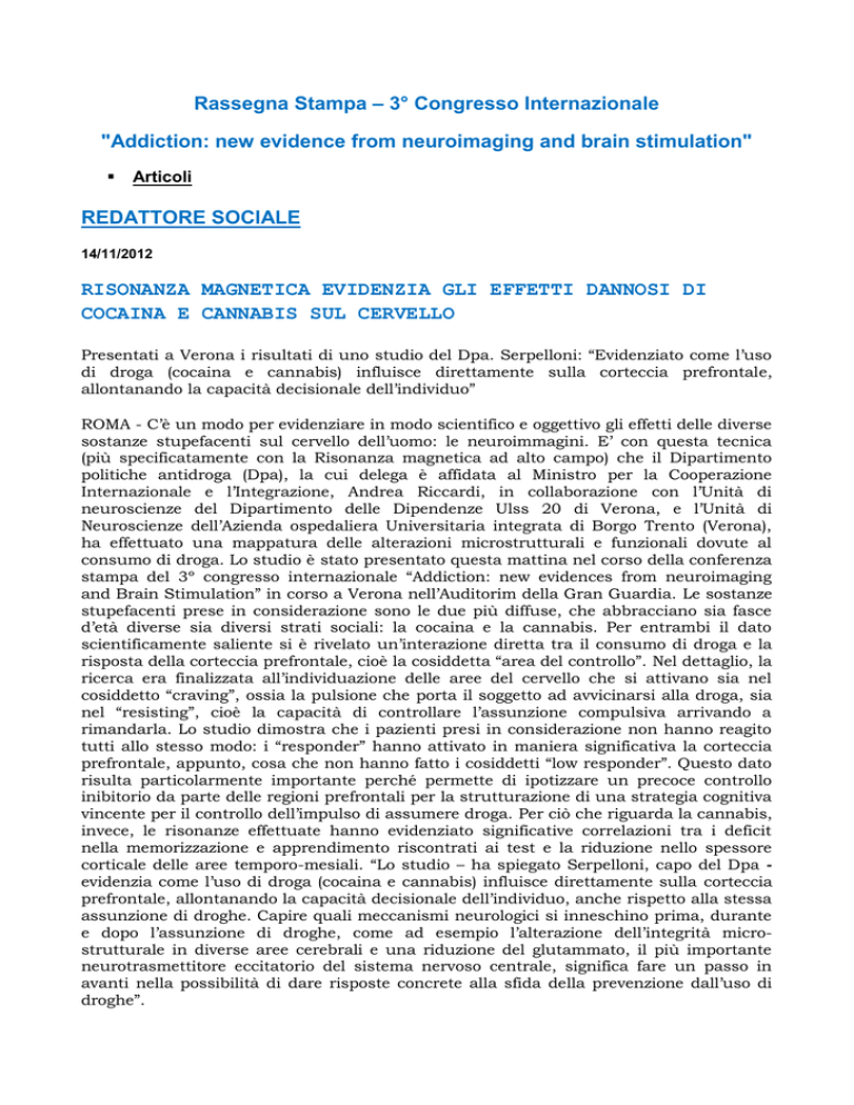 Rassegna Stampa – 3° Congresso Internazionale "Addiction: new evidence from neuroimaging and brain stimulation" Articoli REDATTORE SOCIALE 14/11/2012 RISONANZA MAGNETICA EVIDENZIA GLI EFFETTI DANNOSI DI COCAINA E CANNABIS SUL CERVELLO Presentati a Verona i risultati di uno studio del Dpa. Serpelloni: “Evidenziato come l’uso di droga (cocaina e cannabis) influisce direttamente sulla corteccia prefrontale, allontanando la capacità decisionale dell’individuo” ROMA - C’è un modo per evidenziare in modo scientifico e oggettivo gli effetti delle diverse sostanze stupefacenti sul cervello dell’uomo: le neuroimmagini. E’ con questa tecnica (più specificatamente con la Risonanza magnetica ad alto campo) che il Dipartimento politiche antidroga (Dpa), la cui delega è affidata al Ministro per la Cooperazione Internazionale e l’Integrazione, Andrea Riccardi, in collaborazione con l’Unità di neuroscienze del Dipartimento delle Dipendenze Ulss 20 di Verona, e l’Unità di Neuroscienze dell’Azienda ospedaliera Universitaria integrata di Borgo Trento (Verona), ha effettuato una mappatura delle alterazioni microstrutturali e funzionali dovute al consumo di droga. Lo studio è stato presentato questa mattina nel corso della conferenza stampa del 3º congresso internazionale “Addiction: new evidences from neuroimaging and Brain Stimulation” in corso a Verona nell’Auditorim della Gran Guardia. Le sostanze stupefacenti prese in considerazione sono le due più diffuse, che abbracciano sia fasce d’età diverse sia diversi strati sociali: la cocaina e la cannabis. Per entrambi il dato scientificamente saliente si è rivelato un’interazione diretta tra il consumo di droga e la risposta della corteccia prefrontale, cioè la cosiddetta “area del controllo”. Nel dettaglio, la ricerca era finalizzata all’individuazione delle aree del cervello che si attivano sia nel cosiddetto “craving”, ossia la pulsione che porta il soggetto ad avvicinarsi alla droga, sia nel “resisting”, cioè la capacità di controllare l’assunzione compulsiva arrivando a rimandarla. Lo studio dimostra che i pazienti presi in considerazione non hanno reagito tutti allo stesso modo: i “responder” hanno attivato in maniera significativa la corteccia prefrontale, appunto, cosa che non hanno fatto i cosiddetti “low responder”. Questo dato risulta particolarmente importante perché permette di ipotizzare un precoce controllo inibitorio da parte delle regioni prefrontali per la strutturazione di una strategia cognitiva vincente per il controllo dell’impulso di assumere droga. Per ciò che riguarda la cannabis, invece, le risonanze effettuate hanno evidenziato significative correlazioni tra i deficit nella memorizzazione e apprendimento riscontrati ai test e la riduzione nello spessore corticale delle aree temporo-mesiali. “Lo studio – ha spiegato Serpelloni, capo del Dpa evidenzia come l’uso di droga (cocaina e cannabis) influisce direttamente sulla corteccia prefrontale, allontanando la capacità decisionale dell’individuo, anche rispetto alla stessa assunzione di droghe. Capire quali meccanismi neurologici si inneschino prima, durante e dopo l’assunzione di droghe, come ad esempio l’alterazione dell’integrità microstrutturale in diverse aree cerebrali e una riduzione del glutammato, il più importante neurotrasmettitore eccitatorio del sistema nervoso centrale, significa fare un passo in avanti nella possibilità di dare risposte concrete alla sfida della prevenzione dall’uso di droghe”. DIPENDENZA DA ALCOL E DROGHE, DATI INCORAGGIANTI DALLA STIMOLAZIONE MAGNETICA TRANSCRANICA Una ricerca valuta la capacità di supporto della stimolazione magnetica ai trattamenti per curare la dipendenza. Serpelloni (Dpa): “Coloro che hanno concluso lo studio sono riusciti a mantenere l’astinenza anche dopo un mese dalla fine del trattamento” ROMA - La Stimolazione Magnetica Transcranica ripetitiva (rTMS) è una tecnica di stimolazione cerebrale non invasiva che negli ultimi anni è stata sperimentata come potenziale trattamento per la cura delle dipendenze. Per questo, proprio nell’ambito degli studi sulla stimolazione cerebrale nel trattamento della tossicodipendenza e dell’alcol, l’unità di Neuroscienze del Dipartimento delle Dipendenze di Verona, in collaborazione con l’Università di Verona e il Dipartimento politiche antidroga (Dpa), la cui delega è affidata al Ministro per la Cooperazione Internazionale e l’Integrazione, Andrea Riccardi, ha attivato delle ricerche sia per esplorare la complessa patofisiologia delle tossicodipendenze, sia per valutarne le potenzialità nel trattamento. Lo ricerca, presentata questa mattina nel corso della conferenza stampa del 3º congresso internazionale “Addiction: new evidences from neuroimaging and Brain Stimulation” in corso a Verona nell’Auditorim della Gran Guardia, ha riguardato l’applicazione della “rTMS” sulla corteccia prefrontale dorsolaterale sinistra in un gruppo di soggetti alcoldipendenti e tossicodipendenti in trattamento, e ha valutato l’efficacia dell’inserimento di sedute di Stimolazione Magnetica Transcranica ripetitiva (rTMS) all’interno di un programma di trattamento della dipendenza da alcol o droghe. Questo progetto di ricerca ha sottoposto i pazienti a un trattamento innovativo nel ridurre il consumo di alcol e droghe e la gravità del craving rispetto al trattamento placebo. I soggetti reclutati sono stati pazienti che hanno partecipato al programma di trattamento in regime di ricovero che si è svolto, durante l’arco di 3 settimane, nell’Unità di degenza – Medicina delle dipendenze e Servizio di alcologia del Dipartimento delle Dipendenze presso l’ospedale di Marzana. Da marzo ad oggi, sono stati reclutati e trattati 8 soggetti alcolisti (6 maschi e 2 femmine, età media 47,5 anni). Di questi 8 pazienti (4 in trattamento rTMS reale e 4 in trattamento rTMS placebo), 6 hanno 