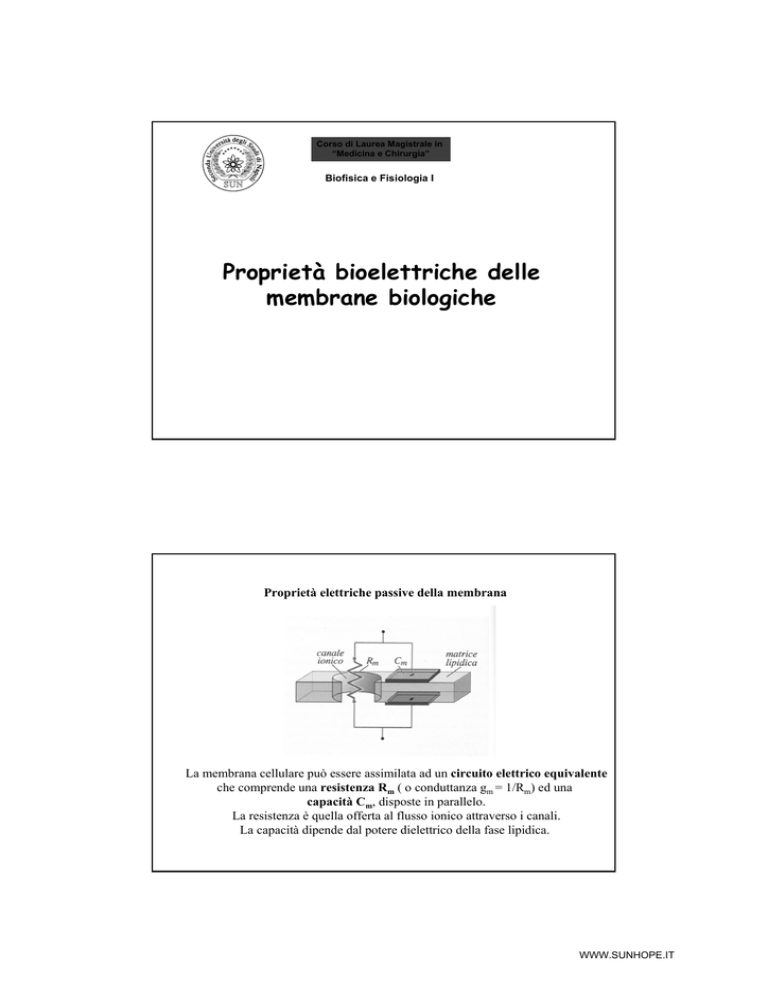 Corso di Laurea Magistrale in “Medicina e Chirurgia” Biofisica e Fisiologia I Proprietà bioelettriche delle membrane biologiche Proprietà elettriche passive della membrana La membrana cellulare può essere assimilata ad un circuito elettrico equivalente che comprende una resistenza Rm ( o conduttanza gm = 1/Rm) ed una capacità Cm, disposte in parallelo. La resistenza è quella offerta al flusso ionico attraverso i canali. La capacità dipende dal potere dielettrico della fase lipidica. WWW.SUNHOPE.IT Current clamp Il metodo consiste nel misurare la variazione del potenziale di membrana (VM) a seguito del passaggio di una corrente di intensità nota IM. Current clamp In corrispondenza di ogni impulso, le variazioni di Vm non si instaurano istantaneamente, ma raggiungono il valore finale con legge esponenziale. τ = RC Costante di tempo Il suo valore indica la velocità con cui ΔV raggiunge il valore finale Vf. Nel circuito, la corrente erogata si divide in due componenti: I = IC + IR quella capacitiva e quella resistiva. IC determina il processo di carica del condensatore, IR percorre la resistenza e fa variare la differenza di potenziale. WWW.SUNHOPE.IT Propagazione dei segnali elettrici WWW.SUNHOPE.IT 25 Depolarizzazione 20 15 10 5 0 0 1 2 3 4 5 6 Distanza, mm V(x) = Vd e –x/λ λ, costante di lunghezza λ = (Rmr/2ρa)1/2 Propagazione dei segnali elettrici WWW.SUNHOPE.IT PROPRIETÀ ELETTRICHE ATTIVE E PASSIVE DELLA MEMBRANA CELLULARE Se iniettiamo corrente (Im) in un neurone per far variare Vm, cosa succede? Im Vm Im cellula Tracce 1-2: iperpolarizzazione (rimuovo cariche + dal citoplasma, risposta passiva) potenziale di soglia Traccia 3: depolarizzazione (fornisco cariche + al citoplasma, risposta passiva) Traccia 4: lo stimolo è sufficiente ad innescare una risposta attiva: potenziale d’azione Current clamp Legge di Ohm: I = g MV M WWW.SUNHOPE.IT Differenza tra risposte passive e risposte attive - Nelle risposte passive la variazione di Vm è direttamente proporzionale allo stimolo di corrente. - Nelle risposte attive la variazione di Vm è maggiore di quella che ci si aspetta da una risposta passiva. - La risposta attiva è una risposta “tutto o niente” (potenziale d’azione), caratteristica delle cellule eccitabili, che si scatena quando Vm supera un valore soglia (Vs). - Durante un potenziale d’azione si aprono dei canali del Na+ che depolarizzano ulteriormente la membrana e attivano in cascata altri canali del Na+. Le risposte elettriche passive della membrana sono determinate da due costituenti strutturali di natura diversa: • Doppio strato lipidico a cui è associata una capacità elettrica (proprietà della membrana di accumulare e mantenere separate le cariche elettriche) • Canali ionici a cui è associata una conduttanza (inverso della resistenza) (proprietà di permeabilità della membrana agli ioni) Circuito elettrico equivalente della membrana (RmCm) liquido extracellulare canale ionico (conduttanza) regione lipidica (capacità) citosol WWW.SUNHOPE.IT