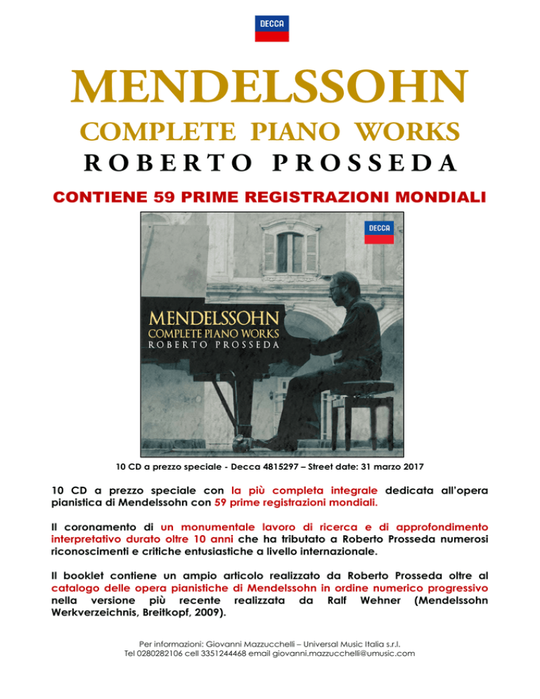MENDELSSOHN COMPLETE PIANO WORKS ROBERTO PROSSEDA CONTIENE 59 PRIME REGISTRAZIONI MONDIALI 10 CD a prezzo speciale - Decca 4815297 – Street date: 31 marzo 2017 10 CD a prezzo speciale con la più completa integrale dedicata all’opera pianistica di Mendelssohn con 59 prime registrazioni mondiali. Il coronamento di un monumentale lavoro di ricerca e di approfondimento interpretativo durato oltre 10 anni che ha tributato a Roberto Prosseda numerosi riconoscimenti e critiche entusiastiche a livello internazionale. Il booklet contiene un ampio articolo realizzato da Roberto Prosseda oltre al catalogo delle opera pianistiche di Mendelssohn in ordine numerico progressivo nella versione più recente realizzata da Ralf Wehner (Mendelssohn Werkverzeichnis, Breitkopf, 2009). Per informazioni: Giovanni Mazzucchelli – Universal Music Italia s.r.l. Tel 0280282106 cell 3351244468 email [email protected] MENDELSSOHN COMPLETE PIANO WORKS CD 1–2 56 Romanze senza Parole 4 Fughe, Allegro con Fuoco CD 3 Sonate CD 4 Fantasie, Capricci, Scherzi CD 5 Variazioni, Preludi e Fughe CD 6 Characterstücke Kinderstücke & Etüden e altri Klavierstücke CD 7–9 Pezzi d’occasione e Juvenilia CD 10 Musiche per pianoforte a 4 mani e per due pianoforti con Alessandra Ammara Roberto Prosseda, pianoforte 10 CD a prezzo speciale Decca 481 5297 Per informazioni: Giovanni Mazzucchelli – Universal Music Italia s.r.l. Tel 0280282106 cell 3351244468 email [email protected] MENDELSSOHN: COMPLETE PIANO WORKS Nato da una famiglia ebrea alto borghese, nipote del grande filosofo Moses Mendelssohn, Felix Mendelssohn-Bartholdy fu pianista, direttore d’orchestra, compositore, scrittore, poliglotta, disegnatore e pittore, ma anche organizzatore, fondatore e direttore del Conservatorio di Lipsia. Mendelssohn incarna il perfetto connubio tra tradizione e innovazione: ha sperimentato nuove strutture musicali senza mai perdere il suo peculiare equilibrio formale, ha recuperato la grande tradizione della musica sacra di Bach e di Händel rinnovandola alla luce dell’esperienza del Romanticismo tedesco. Anche a causa delle persecuzioni antisemite di cui fu vittima, culminate con la censura della sua musica da parte del regime nazista, l’opera e la figura di Mendelssohn sono state a lungo misconosciute e fraintese. La produzione pianistica di Mendelssohn comprende circa dodici ore di musica e per la prima volta è qui raccolta tutta in un unico cofanetto, comprendente anche numerosi brani rimasti inediti fino a pochi anni fa. Nel 2009 l’autorevole studioso mendelssohniano Ralf Wehner ha pubblicato il nuovo catalogo delle opere di Mendelssohn (Mendelssohn-Werkverzeichnis, Breitkopf, 2009), introducendo una nuova numerazione, contraddistinta dalla sigla MWV, che consente di individuare con precisione ogni composizione. La preesistente numerazione in base al numero d’opera, infatti, è incompleta e non cronologicamente ordinata: tutte le composizioni fino al numero d'opera 72 sono state pubblicate per volontà di Mendelssohn, mentre quelle con i numeri dal 73 al 121, assegnati postumi in base a criteri meramente editoriali, sono numerate secondo un ordine non voluto dal compositore. Il catalogo MWV delle opere pianistiche di Mendelssohn è qui riportato in appendice, con le corrispondenze alle singole tracce della presente incisione. Le composizioni per pianoforte solo sono indicate con la lettera U e ammontano a 199. Gli unici brani non presenti in questo cofanetto sono l’Andante e Allegro di Molto MWW U 87, in quanto si tratta di una riduzione pianistica del Capriccio op. 22 per pianoforte e orchestra, quelli il cui manoscritto è tuttora perso o irreperibile (come, ad esempio, l’Andante pastorale für Lise Cristiani MWV 193) e quelli lasciati incompiuti dall’autore, con l’eccezione del movimento di Sonata in sol maggiore MWV U 147, che è qui incluso, essendo di particolare interesse per l’estensione e l’originalità della forma. Roberto Prosseda Per informazioni: Giovanni Mazzucchelli – Universal Music Italia s.r.l. Tel 0280282106 cell 3351244468 email [email protected]