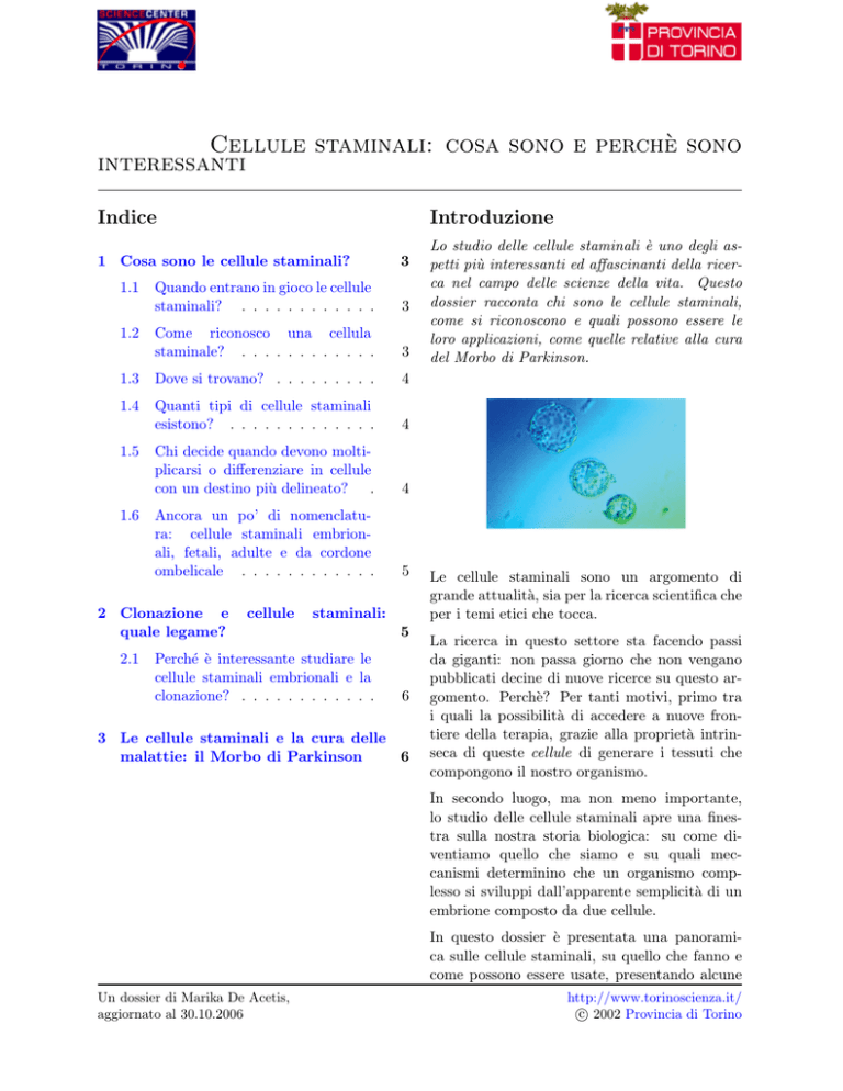 Cellule staminali: cosa sono e perchè sono interessanti Indice Introduzione 1 Cosa sono le cellule staminali? 1.1 3 Quando entrano in gioco le cellule staminali? . . . . . . . . . . . . 3 Come riconosco una cellula staminale? . . . . . . . . . . . . 3 1.3 Dove si trovano? . . . . . . . . . 4 1.4 Quanti tipi di cellule staminali esistono? . . . . . . . . . . . . . 4 Chi decide quando devono moltiplicarsi o differenziare in cellule con un destino più delineato? . 4 Ancora un po’ di nomenclatura: cellule staminali embrionali, fetali, adulte e da cordone ombelicale . . . . . . . . . . . . 5 1.2 1.5 1.6 2 Clonazione e quale legame? 2.1 cellule staminali: Perché è interessante studiare le cellule staminali embrionali e la clonazione? . . . . . . . . . . . . 5 6 3 Le cellule staminali e la cura delle malattie: il Morbo di Parkinson 6 Lo studio delle cellule staminali è uno degli aspetti più interessanti ed affascinanti della ricerca nel campo delle scienze della vita. Questo dossier racconta chi sono le cellule staminali, come si riconoscono e quali possono essere le loro applicazioni, come quelle relative alla cura del Morbo di Parkinson. Le cellule staminali sono un argomento di grande attualità, sia per la ricerca scientifica che per i temi etici che tocca. La ricerca in questo settore sta facendo passi da giganti: non passa giorno che non vengano pubblicati decine di nuove ricerce su questo argomento. Perchè? Per tanti motivi, primo tra i quali la possibilità di accedere a nuove frontiere della terapia, grazie alla proprietà intrinseca di queste cellule di generare i tessuti che compongono il nostro organismo. In secondo luogo, ma non meno importante, lo studio delle cellule staminali apre una finestra sulla nostra storia biologica: su come diventiamo quello che siamo e su quali meccanismi determinino che un organismo complesso si sviluppi dall’apparente semplicità di un embrione composto da due cellule. In questo dossier è presentata una panoramica sulle cellule staminali, su quello che fanno e come possono essere usate, presentando alcune Un dossier di Marika De Acetis, aggiornato al 30.10.2006 http://www.torinoscienza.it/ c 2002 Provincia di Torino Cellule staminali: cosa sono e perchè sono interessanti 2 ricerche di frontiera, come quelle per la cura del Morbo di Parkinson. Altre risorse: giochi gioco sulle cellule staminali dossier referendum sulla legge 40/2004 Un dossier di Marika De Acetis, aggiornato al 30.10.2006 http://www.torinoscienza.it/ c 2002 Provincia di Torino Cellule staminali: cosa sono e perchè sono interessanti 1 Cosa sono le cellule staminali? 1.1 3 Quando entrano in gioco le cellule staminali? Entrano in gioco principalmente in due occasioni: - durante lo sviluppo e l’accrescimento, producendo le cellule che costituiranno l’individuo adulto - quando le cellule dei tessuti sono danneggiate o usurate, dando luogo alle cellule di sostituzione. 1.2 Come riconosco una cellula staminale? Le cellule staminali sono i precursori delle altre cellule che compongono gli organi di un individuo. Infatti, il nostro organismo, come quello di tutti gli animali, funziona grazie alla presenza di cellule di tipo diverso che svolgono funzioni diverse. Per esempio, quelle del fegato sono specializzate nel metabolizzare i medicinali, quelle del cuore nel contrarsi per pompare il sangue e quelle dei reni nel selezionare dal sangue le sostanze utili e quelle di scarto. E’ esattamente come nella nostra società, in cui le attività lavorative sono distribuite. D’altronde come è impensabile che una stessa persona possa svolgere contemporaneamente il ruolo di medico, meccanico, idraulico, panettiere, insegnante, ingegnere e cosı̀ via, lo stesso non può accadere per le cellule. Purtroppo le cellule che abbiamo all’interno del nostro corpo si usurano facilmente e devono essere sostituite, con una frequenza differente a seconda dell’organo. Per esempio, i globuli rossi sono sostituiti ogni 120 giorni, mentre alcuni globuli bianchi durano pochissime ore. Se avessimo già le cellule di riserva pronte per l’uso, dovremmo essere dotati di un rimorchio di dimensioni notevoli per portarle con noi.... Per nostra fortuna, esistono le cellule staminali, presenti in numero limitato che al momento opportuno ...producono... le cellule che servono. Questo accade sia nell’embrione, quando ancora tutti gli organi sono da formare, che nell’adulto, quando devono produrre le cellule di riserva. Un dossier di Marika De Acetis, aggiornato al 30.10.2006 Riconoscere una cellula staminale non è semplice: infatti, proprio perché non ha un’attività specifica è difficile identificarla tra le altre. Proprio per questo motivo, anche se è nota l’esistenza di determinate cellule staminali nei tessuti adulti, alcune di queste non sono ancora state individuate. E’ un po’ come cercare di dedurre dal vestito il lavoro che fa una persona: è più facile se questa ha un abito lavorativo o gli strumenti del lavoro. Mentre le altre cellule del nostro corpo hanno un aspetto che aderisce alla loro funzione e gli strumenti per eseguirla, le cellule staminali non hanno né l’una né l’altra. O quasi. Una delle frontiere della ricerca riguarda proprio la ricerca delle tecniche per isolare e identificare al meglio queste cellule. Le caratteristiche fondamentali che accomunano tutte le cellule staminali sono: - non hanno un attività specifica all’interno dell’organismo, se non quella di costituirne una riserva - sono in grado di riprodursi molte volte dando origine a cellule identiche a se stesse http://www.torinoscienza.it/ c 2002 Provincia di Torino Cellule staminali: cosa sono e perchè sono interessanti in presenza di appositi stimoli si trasformano in cellule con funzioni specifiche (ad esempio una cellule del muscolo, del cervello o del fegato) 1.3 Dove si trovano? Sono presenti in tutti gli organismi e si dividono in diverse tipologie, a seconda che siano in grado di dare o