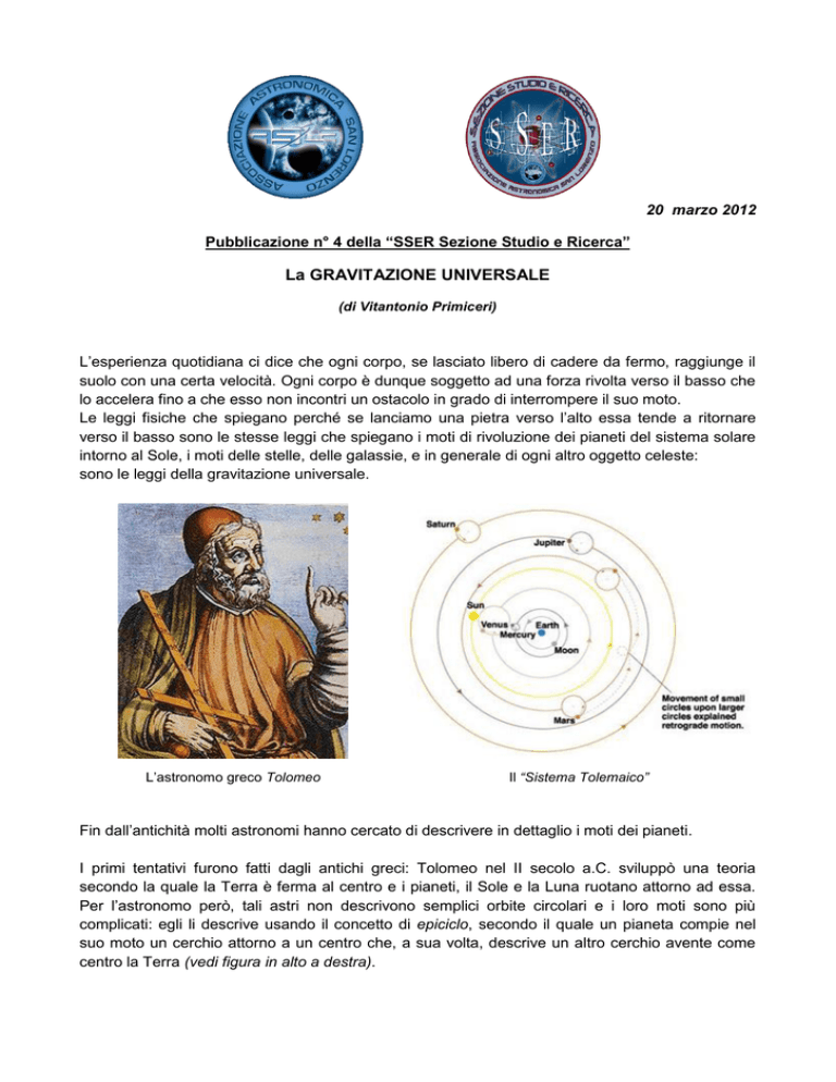 20 marzo 2012 Pubblicazione n° 4 della “SSER Sezione Studio e Ricerca” La GRAVITAZIONE UNIVERSALE (di Vitantonio Primiceri) L’esperienza quotidiana ci dice che ogni corpo, se lasciato libero di cadere da fermo, raggiunge il suolo con una certa velocità. Ogni corpo è dunque soggetto ad una forza rivolta verso il basso che lo accelera fino a che esso non incontri un ostacolo in grado di interrompere il suo moto. Le leggi fisiche che spiegano perché se lanciamo una pietra verso l’alto essa tende a ritornare verso il basso sono le stesse leggi che spiegano i moti di rivoluzione dei pianeti del sistema solare intorno al Sole, i moti delle stelle, delle galassie, e in generale di ogni altro oggetto celeste: sono le leggi della gravitazione universale. L’astronomo greco Tolomeo Il “Sistema Tolemaico” Fin dall’antichità molti astronomi hanno cercato di descrivere in dettaglio i moti dei pianeti. I primi tentativi furono fatti dagli antichi greci: Tolomeo nel II secolo a.C. sviluppò una teoria secondo la quale la Terra è ferma al centro e i pianeti, il Sole e la Luna ruotano attorno ad essa. Per l’astronomo però, tali astri non descrivono semplici orbite circolari e i loro moti sono più complicati: egli li descrive usando il concetto di epiciclo, secondo il quale un pianeta compie nel suo moto un cerchio attorno a un centro che, a sua volta, descrive un altro cerchio avente come centro la Terra (vedi figura in alto a destra). Niccolò Copernico (1473 – 1543) si rese conto che il sistema tolemaico presentava molte ambiguità. Egli propose allora un modello nel quale il Sole si trova al centro del sistema solare e la Terra insieme agli altri pianeti ruotano attorno ad esso (vedi figura in basso): questo modello però, pur essendo più semplice di quello tolemaico, non fu subito accettato Il “Sistema Copernicano” Niccolò Copernico Anni dopo, l’astronomo danese Tycho Brahe raccolse numerosi dati sui moti dei pianeti. Questi dati furono analizzati da Giovanni Keplero (1571-1630), il suo assistente. Egli individuò delle regolarità nel moto dei pianeti che lo portarono alla formulazione delle tre leggi che portano il suo nome. Nel 1665 Isaac Newton, riuscì ad intuire che la forza che causa la caduta di una mela sulla superficie della Terra è la stessa che tiene la Luna vincolata alla sua orbita (prima di Newton il moto dei pianeti era sempre stato considerato diversamente dal moto dei corpi terrestri). Questa intuizione pose le basi per la formulazione di una legge della gravitazione valida per qualunque coppia di corpi nell’universo. Ma che cos’è esattamente la forza di gravità? L’interazione gravitazionale è una delle quattro interazioni fisiche fondamentali. Esse sono l’interazione forte, l’interazione debole, l’interazione elettromagnetica e quella gravitazionale. Quest’ultima appunto è dovuta alla presenza di massa. Le altre forze possono essere sia attrattive che repulsive (ad esempio due cariche elettriche possono attrarsi o respingersi, così come possono farlo due calamite), la forza gravitazionale, invece, è sempre attrattiva. La legge di Newton della gravitazione universale può essere così formulata: due qualsiasi particelle dell’universo si attraggono con una forza il cui modulo è direttamente proporzionale al prodotto delle loro masse e inversamente proporzionale al quadrato della loro distanza. Essa è diretta lungo la congiungente le due particelle. Quanto appena detto viene scritto in simboli come: , dove G è una costante universale che ha lo stesso valore per tutte le coppie di particelle (essa vale masse in questione e r la distanza tra esse. ), m1 e m2 rappresentano le due La forza che causa la caduta di una mela sulla superficie terrestre è la forza di gravità Isaac Newton Alcuni esperimenti indicano che la forza di attrazione gravitazionale tra due particelle qualsiasi non dipende dalla presenza di altri corpi e dalle proprietà del mezzo in cui esse sono immerse. Per fare un esempio, la forza gravitazionale misurata tra due piume che si trovano nello spazio libero e quella che intercorre tra le due stesse piume immerse in un liquido è perfettamente uguale nei due casi (a costo che la distanza tra esse rimanga uguale). Ma l’intuizione di Newton non fornisce risultati corretti se l’interazione gravitazionale tra due corpi è molto forte. Nei primi anni del 1900, Albert Einstein riuscì ad elaborare una nuova teoria in grado di risolvere questo problema: tale teoria fornisce risultati corretti se l’interazione gravitazionale è forte e si risolve in quella newtoniana se tale interazione è debole. Al giorno d’oggi la teoria della gravitazione viene utilizzata per stabilire le orbite delle navicelle spaziali inviate dalla Terra verso il nostro sistema solare e oltre. Questa preziosa legge inoltre ci permette di calcolare con accurata precisione l’istante in cui è avvenuta o avverrà un’eclissi solare o un altro fenomeno celeste. Sempre questa legge ha permesso a Johann Gottfried Galle e a Heinrich Louis d'Arrest di scoprire il pianeta Nettuno: i due astronomi notarono alcune piccole deviazioni di Urano dalla sua orbita e La cometa “Halley” pensarono di poterle attribuire all’attrazione gravitazionale di un pianeta ancora sconosciuto. Anche Edmond Halley riuscì ad utilizzarla per predire il ritorno (del 1758) della cometa che oggi porta il suo nome. Essa ritornerà nell’estate del 2061! Vitantonio Primiceri Vitantonio Primiceri è nato il 19 Dicembre 1992 a Tricase (Le) e risiede tutt'ora a Casarano (Le). Ha frequentato il Liceo Scientifico Statale “Giulio Cesare Vanini” della stessa città, conseguendo la maturità col massimo dei voti nel 2011. Attualmente è iscritto alla Facoltà di Fisica dell’Università degli Studi di Lecce e da tre anni fa parte dell’"Associazione Astronomica San Lorenzo" con sede in Casarano. Vitantonio è appassionato di Astronomia, Fisica ed Astrofisica... Questa