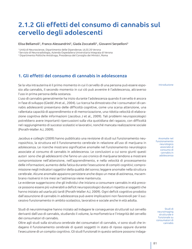2.1.2 Gli effetti del consumo di cannabis sul cervello degli adolescenti Elisa Bellamoli1, Franco Alessandrini2, Giada Zoccatelli2 , Giovanni Serpelloni3 Unità di Neuroscienze, Dipartimento delle Dipendenze, ULSS 20 Verona Servizio di Neuroradiologia, Azienda Ospedaliera Universitaria Integrata di Verona 3 Dipartimento Politiche Antidroga, Presidenza del Consiglio dei Ministri, Roma 1 2 1. Gli effetti del consumo di cannabis in adolescenza Se la vita intrauterina è il primo momento in cui il cervello di una persona può essere esposto alla cannabis, il secondo momento in cui ciò può avvenire è l’adolescenza, attraverso l’uso in prima persona della sostanza. L’uso di cannabis generalmente ha inizio durante l’adolescenza quando il cervello è ancora in fase di sviluppo (Giedd JN et al., 2004). La ricerca ha dimostrato che i consumatori di cannabis adolescenti presentano delle difficoltà cognitive, come una scarsa attenzione, una rallentata capacità di apprendimento e di memorizzazione, una ridotta velocità di elaborazione cognitiva delle informazioni (Jacobus J et al., 2009). Tali problemi neuropsicologici potrebbero avere importanti ripercussioni sulla vita quotidiana del ragazzo, con difficoltà nel raggiungimento di successi scolastici e lavorativi, nonché mancata realizzazione sociale (Porath-Waller AJ, 2009). Introduzione Jacobus e colleghi (2009) hanno pubblicato una revisione di studi sul funzionamento neuropsichico, la struttura ed il funzionamento cerebrale in relazione all’uso di marijuana in adolescenza. Le ricerche mostrano significative anomalie nel funzionamento neurologico associate al consumo di cannabis in adolescenza. Le conclusioni a cui sono giunti questi autori sono che gli adolescenti che fanno un uso cronico di marijuana tendono a mostrare compromissione nell’attenzione, nell’apprendimento, e nella velocità di processamento delle informazioni; aumento della fatica durante l’esecuzione di compiti cognitivi; compromissione negli indicatori oggettivi della qualità del sonno; leggere anomalie nella struttura cerebrale. Alcune anomalie appaiono persistere anche dopo un mese di astinenza, ma sembrano risolversi in tre mesi se l’astinenza viene mantenuta. Le evidenze suggeriscono che gli individui che iniziano a consumare cannabis in età precoce possono essere più vulnerabili a deficit neuropsicologici duraturi rispetto ai soggetti che hanno iniziato ad usarla più tardi (Porath-Waller AJ, 2009). Ogni deficit cognitivo prodotto dall’assunzione di cannabis in adolescenza può avere implicazioni non favorevoli per il successivo funzionamento in ambito scolastico, lavorativo e sociale anche in età adulta. Anomalie nel funzionamento neurologico associate al consumo di cannabis in adolescenza Studi di neuroimmagine hanno iniziato ad indagare le conseguenze strutturali sul cervello derivanti dall’uso di cannabis, studiando il volume, la morfometria e l’integrità del cervello dei consumatori di cannabis. Oltre agli studi sulla struttura cerebrale dei consumatori di cannabis, vi sono studi che indagano il funzionamento cerebrale di questi soggetti in stato di riposo oppure durante l’esecuzione di un compito cognitivo. Gli studi funzionali in questo settore possono indaga- Studi di neuroimaging strutturale e funzionale su consumatori di cannabis 81 NEUROSCIENZE delle DIPENDENZE: il Neuroimaging re il funzionamento cerebrale della persona in stato di intossicazione acuta dalla sostanza oppure dopo un periodo di astinenza. Esempi di entrambe le tipologie di studio vengono di seguito descritti. 2. Studi di neuroimaging strutturale su adolescenti consumatori di cannabis Studi sulla struttura cerebrale e il consumo di cannabis in adolescenza Studi di neuroimmagine hanno recentemente iniziato ad esplorare il volume, la morfometria e l’integrità del cervello anche di adolescenti che fanno uso di cannabis, focalizzandosi sui sistemi associati con la vulnerabilità ai disturbi neurocognitivi e dell’umore. Le tecniche di Risonanza Magnetica (RM) hanno quantificato la densità dei tessuti, differenziato la composizione dei tessuti, e valutato l’organizzazione e l’integrità dei tessuti in vivo. Un maggior volume della corteccia prefrontale nei consumatori di cannabis risulta dannoso Attraverso la RM ad alta risoluzione, Medina e colleghi (Medina KL et al., 2007) hanno esaminato il volume cerebrale di un gruppo di consumatori di cannabis adolescenti (di 16-19 Anomalie della struttura cerebrale di adolescenti consumatori di cannabis con disturbo bipolare Simili anomalie della struttura cerebrale sono state riscontrate in adolescenti con disturbo bipolare. Jarvis e colleghi (2008) hanno riferito che adolescenti bipolari con disturbo da uso di cannabis presentano una riduzione del volume di materia grigia nel giro fusiforme sinistro, un aumento della materia grigia nel caudato destro, nel giro precentrale, nel giro occipitale e fusiforme mediale destro, e nel verme del cervelletto, rispetto agli adolescenti bipolari senza uso passato di cannabis. Riduzione dell’integrità della materia bianca In adolescenti consumatori di cannabis sono state osservate, inoltre, lievi anomalie della materia bianca. Medina e colleghi (Medina KL et al., 2007B) hanno riscontrato anche che un aumento dei sintomi depressivi nei consumatori di cannabis era associato ad un ridotto volume della materia bianca: questo suggerisce che il consumo di cannabis durante l’ado- 82 anni), dopo un mese di astinenza. In una delle prime analisi, è emerso che i consumatori di cannabis adolescenti (n=26, di 15-18 anni, con forte abuso alcolico aggiuntivo) non differivano in modo significativo dai gruppi di controllo sani (n=21) nel volume ippocampale, anche se le correlazioni tra volume ippocampale e memoria verbale risultavano anomale rispetto ai soggetti di controllo. Inoltre, è stato rilevato che un incremento dell’uso di cannabis o la presenza di sintomi di dipendenza predicev