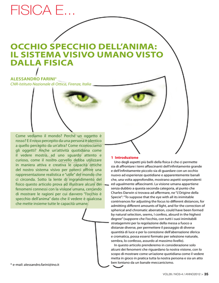 fisica e... Occhio specchio dell’anima: il sistema visivo umano visto dalla fisica Alessandro Farini* CNR-Istituto Nazionale di Ottica, Firenze, Italia Come vediamo il mondo? Perché un oggetto è rosso? E il rosso percepito da una persona è identico a quello percepito da un’altra? Come riconosciamo gli oggetti? Anche un’attività quotidiana come il vedere mostra, ad uno sguardo attento e curioso, come il nostro cervello debba utilizzare in maniera attiva e creativa le capacità ottiche del nostro sistema visivo per poterci offrire una rappresentazione realistica e “utile” del mondo che ci circonda. Sotto la lente di ingrandimento del fisico questo articolo prova ad illustrare alcuni dei fenomeni connessi con la visione umana, cercando di mostrare le ragioni per cui davvero “l’occhio è specchio dell’anima” dato che il vedere è qualcosa che mette insieme tutte le capacità umane. * e-mail: [email protected] 1 Introduzione Uno degli aspetti più belli della fisica è che ci permette sia di affrontare i temi affascinanti dell’infinitamente grande e dell’infinitamente piccolo sia di guardare con un occhio nuovo ad esperienze quotidiane e apparentemente banali che, una volta approfondite, mostrano aspetti sorprendenti ed ugualmente affascinanti. La visione umana appartiene senza dubbio a questa seconda categoria, al punto che Charles Darwin si trovava ad affermare, ne “L’Origine della Specie”: “To suppose that the eye with all its inimitable contrivances for adjusting the focus to different distances, for admitting different amounts of light, and for the correction of spherical and chromatic aberration, could have been formed by natural selection, seems, I confess, absurd in the highest degree” (supporre che l’occhio, con tutti i suoi inimitabili stratagemmi per la regolazione della messa a fuoco a distanze diverse, per permettere il passaggio di diverse quantità di luce e per la correzione dell’aberrazione sferica e cromatica, possa essersi formato per selezione naturale, sembra, lo confesso, assurdo al massimo livello). In questo articolo prenderemo in considerazione solo alcuni dei fenomeni che riguardano la nostra visione, con lo scopo di mostrare come un’azione quotidiana come il vedere metta in gioco in pratica tutta la nostra persona e sia un atto ben lontano da un banale meccanicismo. vol28 / no3-4 / anno2012 > 35 fisica e... 1 Fig. 1 Struttura schematica dell’occhio. 2 Il sistema ottico dell’occhio Talvolta si prova a paragonare l’occhio e la macchina fotografica. Un tale paragone è quantomeno incompleto, poiché l’occhio umano (fig.1) racchiude in sé sia il sistema ottico vero e proprio, che permette il formarsi delle immagini, sia una propaggine del sistema nervoso centrale, la retina, che opera una prima analisi di tali immagini. Se proprio un paragone, fortemente incompleto, fosse obbligatorio, potremmo dire che il nostro occhio è insieme la macchina fotografica, il computer e il software per il fotoritocco. Vediamo in primo luogo la struttura anatomica dell’occhio. Il primo strato che si incontra è la cornea. È uno strato trasparente non perfettamente sferico che contribuisce ai due terzi del potere diottrico dell’occhio (il potere diottrico è ciò che permette la curvatura dei raggi e la loro messa a fuoco sulla retina). La cornea è trasparente per la radiazione visibile, ma è in grado di assorbire la radiazione ultravioletta (UV) e in particolare la cosiddetta radiazione UV-B. L’effetto di assorbimento ha un’utilità poiché serve a proteggere gli strati successivi dal danneggiamento che la radiazione UV, come ad esempio quella del Sole, potrebbe produrre. Allo stesso tempo però tale assorbimento può avere un effetto nocivo sulla cornea, procurando fastidiose irritazioni: le più comuni conseguenze dell’assorbimento di ultravioletto da parte della cornea e dei tessuti circostanti sono cheratiti e congiuntiviti. Dopo la cornea, la radiazione incontra l’umor acqueo, composto perlopiù di acqua, che ha lo scopo di trasportare ossigeno e nutrimento agli stati sottostanti. In seguito la radiazione deve passare attraverso la pupilla; si tratta di un foro, circondato dall’iride, che cambia di dimensione secondo la quantità di luce che vi arriva sopra: in presenza di poca luce il foro tenderà a dilatarsi (anche fino a circa 8 mm in un giovane), mentre in condizioni di alta luminosità tenderà a contrarsi fino a 2 mm. In condizioni normali di giorno la pupilla umana ha un diametro di circa 3 mm. Si tratta di un compromesso assai utile: una pupilla troppo chiusa può, infatti, dare luogo a problemi di diffrazione (quando la luce dopo aver attraversato un foro non segue le traiettorie rettilinee tipiche dell’ottica geometrica) mentre una pupilla molto dilatata evidenzierebbe il comportamento ottico tutt’altro che impeccabile delle zone più marginali del nostro occhio, le cosiddette aberrazioni. Traversata la 2 Fig. 2 Due rappresentazioni del ponte giapponese da parte di Monet: una (quella a sinistra) del 1899 e una (a destra) del 1922, quando il problema della cataratta era assai rilevante. 36 < il nuovo saggiatore A. Farini: occhio specchio dell'anima: il sistema visivo umano ecc. pupilla, la radiazione giunge sul cristallino; è una struttura molto complessa avente un indice di rifrazione variabile sulla sua superficie e in grado di variare la propria forma e di conseguenza il proprio potere diottrico (pari a circa un terzo del potere complessivo dell’occhio) per permettere di vedere oggetti a distanza molto diversa tra loro. Purtroppo con il passare degli anni il cristallino perde la sua capacità di variare il potere diottrico; per questa ragione insorge il fenomeno della presbiopia, che impedisce di mettere a fuoco correttamente oggetti come ad esempio i caratteri a stampa del giornale quando sono molto vicini. Il cristallino si sviluppa immediatamente (è ben visibile anche nelle prime ecografie dei