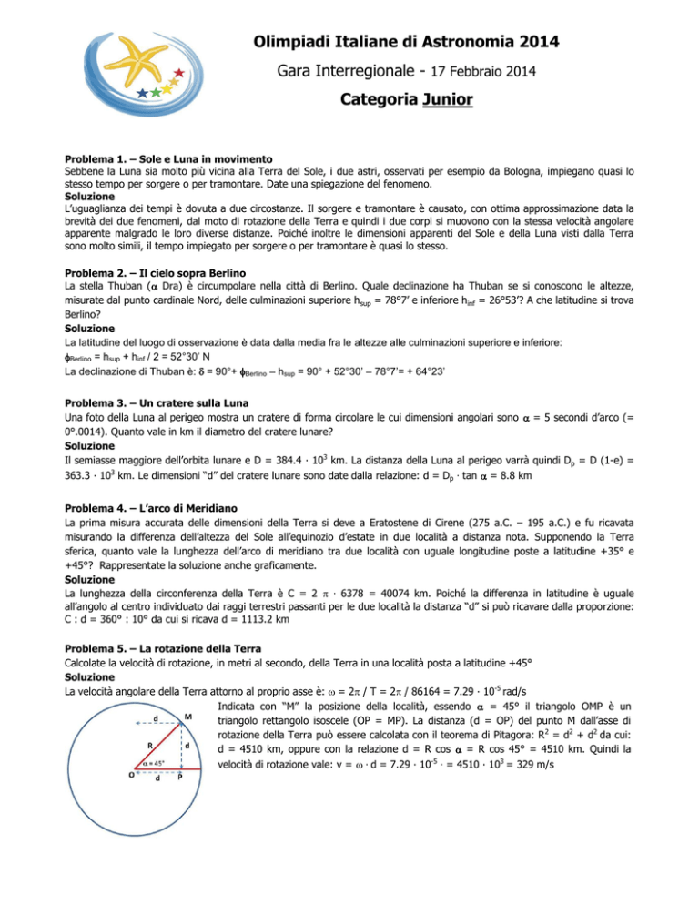 Olimpiadi Italiane di Astronomia 2014 Gara Interregionale - 17 Febbraio 2014 Categoria Junior Problema 1. – Sole e Luna in movimento Sebbene la Luna sia molto più vicina alla Terra del Sole, i due astri, osservati per esempio da Bologna, impiegano quasi lo stesso tempo per sorgere o per tramontare. Date una spiegazione del fenomeno. Soluzione L’uguaglianza dei tempi è dovuta a due circostanze. Il sorgere e tramontare è causato, con ottima approssimazione data la brevità dei due fenomeni, dal moto di rotazione della Terra e quindi i due corpi si muovono con la stessa velocità angolare apparente malgrado le loro diverse distanze. Poiché inoltre le dimensioni apparenti del Sole e della Luna visti dalla Terra sono molto simili, il tempo impiegato per sorgere o per tramontare è quasi lo stesso. Problema 2. – Il cielo sopra Berlino La stella Thuban ( Dra) è circumpolare nella città di Berlino. Quale declinazione ha Thuban se si conoscono le altezze, misurate dal punto cardinale Nord, delle culminazioni superiore hsup = 78°7’ e inferiore hinf = 26°53’? A che latitudine si trova Berlino? Soluzione La latitudine del luogo di osservazione è data dalla media fra le altezze alle culminazioni superiore e inferiore: Berlino = hsup + hinf / 2 = 52°30’ N La declinazione di Thuban è: = 90°+ Berlino – hsup = 90° + 52°30’ – 78°7’= + 64°23’ Problema 3. – Un cratere sulla Luna Una foto della Luna al perigeo mostra un cratere di forma circolare le cui dimensioni angolari sono = 5 secondi d’arco (= 0°.0014). Quanto vale in km il diametro del cratere lunare? Soluzione Il semiasse maggiore dell’orbita lunare e D = 384.4 ∙ 103 km. La distanza della Luna al perigeo varrà quindi Dp = D (1-e) = 363.3 ∙ 103 km. Le dimensioni “d” del cratere lunare sono date dalla relazione: d = Dp ∙ tan = 8.8 km Problema 4. – L’arco di Meridiano La prima misura accurata delle dimensioni della Terra si deve a Eratostene di Cirene (275 a.C. – 195 a.C.) e fu ricavata misurando la differenza dell’altezza del Sole all’equinozio d’estate in due località a distanza nota. Supponendo la Terra sferica, quanto vale la lunghezza dell’arco di meridiano tra due località con uguale longitudine poste a latitudine +35° e +45°? Rappresentate la soluzione anche graficamente. Soluzione La lunghezza della circonferenza della Terra è C = 2 ∙ 6378 = 40074 km. Poiché la differenza in latitudine è uguale all’angolo al centro individuato dai raggi terrestri passanti per le due località la distanza “d” si può ricavare dalla proporzione: C : d = 360° : 10° da cui si ricava d = 1113.2 km Problema 5. – La rotazione della Terra Calcolate la velocità di rotazione, in metri al secondo, della Terra in una località posta a latitudine +45° Soluzione La velocità angolare della Terra attorno al proprio asse è: = 2 / T = 2 / 86164 = 7.29 ∙ 10-5 rad/s Indicata con “M” la posizione della località, essendo = 45° il triangolo OMP è un triangolo rettangolo isoscele (OP = MP). La distanza (d = OP) del punto M dall’asse di rotazione della Terra può essere calcolata con il teorema di Pitagora: R 2 = d2 + d2 da cui: d = 4510 km, oppure con la relazione d = R cos = R cos 45° = 4510 km. Quindi la velocità di rotazione vale: v = ∙d = 7.29 ∙ 10-5 ∙ = 4510 ∙ 103 = 329 m/s Olimpiadi Italiane di Astronomia 2014 Gara Interregionale Alcuni dati di interesse Tabella 1 – Sole Raggio medio Massa Temperatura superficiale Magnitudine apparente Terra Magnitudine assoluta Età stimata Classe spettrale Posizione nel diagramma HR Distanza media dal centro galattico Periodo di rivoluzione intorno al centro galattico 695475 km 1.99 ∙ 1030 kg 5778 K - 26.8 dalla + 4.83 4.57 ∙ 109 anni G2 V Sequenza principale 27000 anni-luce 2.5 ∙ 108 anni Tabella 2 – Sistema Solare Raggio medio (km) Massa (kg) Semiasse maggiore dell’orbita (km) Periodo orbitale Eccentricità dell’orbita Tipo Mercurio Venere Terra Luna Marte Giove Saturno Urano Nettuno 2440 6052 6378 1738 3397 71492 60268 25559 24766 3.30∙1023 57.9∙106 4.87∙1024 108.2∙106 5.97∙1024 149.6∙106 7.35∙1022 384.4∙103 6.42∙1023 227.9∙106 1.90∙1027 778.3∙106 5.68∙1026 1.43∙109 8.68∙1025 2.87∙109 1.02∙1026 4.50∙109 87.97 g 224.70 0.206 g 0.007 roccioso 1 a 27.32 0.017 roccioso g 0.055 roccioso a 11.86 0.093 0.048 1.88 roccioso roccioso a 29.45 a 0.056 gassoso gassoso 84.07 a 0.046 gassoso 164.88 0.001 gassoso Tabella 3 – Area della superficie per figure geometriche notevoli Area Triangolo bh/2 Rettangolo ℓ1 ℓ2 Tabella 4 – Costanti fisiche Nome Costante di Stefan-Boltzmann Velocità della luce nel vuoto Costante di Gravitazione Universale Accelerazione di gravità al livello del mare Tabella 5 – Formule per i triangoli rettangoli Teorema di Pitagora Funzioni trigonometriche c a b ℓ 2 Quadrato Simbolo c G g c2 = a2 + b2 a = c sen Cerchio R2 Valore 5.67 ∙10-8 299792 6.67 ∙ 10-11 9.81 Ellisse ab Unità di misura W m-2 K-4 km s-1 m3 kg-1 s-2 m s-2 a = c cos a = b tan 4 R2 a Sfera