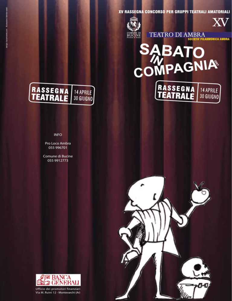 illustrazioni: fabrizio natali design: lauramoretti.com Comune di Bucine 055 9912773 Ufficio dei promotori finanziari Via M. Ruini 12 - Montevarchi (Ar) �� �� Pro Loco Ambra 055 996701 �� �� INFO L’Amministrazione Comunale rinnova ogni anno la sua collaborazione con la Società Filarmonica di Ambra nella precisa convinzione che tale Rassegna, come già detto, integri e completi la stagione del Teatro Comunale di Bucine, più improntata alla contemporaneità e alla sperimentazione di nuovi linguaggi. Il teatro amatoriale ha il grande merito di avvicinare all’arte teatrale coloro che, pur non essendo professionisti, vogliono esprimere la loro passione non solo assistendo al “gioco”, ma diventandone gli attori principali. L’invito ad assistere alla Rassegna è, ovviamente, rivolto a tutti ma, in particolare, a tutti gli estimatori del genere. Rivolgiamo, infine, un sentito ringraziamento alla Società Filarmonica di Ambra. �� Un esempio della non duplicazione dell’offerta teatrale del Comune è rappresentato dalla Rassegna di Teatro Amatoriale di Ambra, che si svolge da molti anni e che ogni anno propone le produzioni di compagnie amatoriali che si dilettano, divertendo e divertendosi, in commedie in vernacolo, classiche e originali. �� La presenza nel nostro territorio di due teatri – il Teatro Comunale di Bucine e il Teatro di Ambra – costituisce una grande opportunità di crescita culturale dei nostri cittadini e di tutti coloro che assistono alle stagioni degli stessi. E la loro importanza aumenta se si considera che la loro programmazione può considerarsi complementare. « Tutti gli esseri umani sono attori (agiscono) e spettatori (osservano). Siamo tutti spett-attori “Augusto Boal”. IIl Teatro di Ambra è felice di ospitare la 15esima rassegna di teatro amatoriale. Per oltre 2 mesi ogni fine settimana uomini e donne, ciascuno con la propria esperienza e personalità, si daranno il cambio sulla scena in nome di una comune passione: il teatro. Straripando di vitalità e di creatività il teatro amatoriale può essere una vera risorsa culturale. Risponde alla necessità di ciascun individuo di trovare la propria dimensione di attore (quello che agisce) nell’ambito della comunità o almeno di un gruppo grazie allo splendido strumento di conoscenza che è il gioco. Sotto la sua aria da ultimo della classe, di dilettante, possono nascondersi realizzazioni, a volte, molto più complesse di quello che potremmo aspettarci... mi piace citare alcuni autodidatti famosi, dilettanti illuminati diventati artisti, imprescindibili come Antoine o Gauguin nel settore della pittura. Non possiamo, staccandoci da ogni considerazione artistica, pensare l’attività amatoriale come una risposta popolare all’ individualismo, ad una cultura mercantile che invade gli spazi più piccoli della nostra libertà ? Immaginate il mondo del calcio tornare ad essere uno sport amatoriale ... non sarebbe più … divertente? L’espressione amatoriale nella sua forma teatrale è un bene prezioso che il teatro di Ambra in collaborazione con il comune di Bucine sostiene e promuove con molta felicità per il 15esimo anno consecutivo. Ed ora ... “A vous de jouer” . Sauro Testi Il Sindaco Gianna Raffaelli Assessore alla Cultura Frederic Feliciano Direttore Artistico 2 3 SABATO 14 APRILE ORE 21,30 Lestromesso Levane (Ar) SABATO 21 APRILE ORE 21,30 Gli Squinternati San Giovanni Valdarno (Ar) IL MALEFICIO DELLA FALENA (*) MISSIONE DA I’ PARADISO di Federico Garcia Lorca di Antonella Zucchini Il maleficio della falena é il primo testo teatrale del poeta spagnolo Federico Garcia Lorca. Questa opera fu rappresentata per la prima e unica volta dal vivo a Madrid nel 1922, l’ autore non scrisse mai la fine, lasciando a ciascuno di noi immaginare la sorte di una storia d’ amore unica nel suo genere. Una delle più piccole forme di vita sulla terra, si esprime qui con dolcezza e senza pudore, percorsa dalle stesse passioni dell’ essere umano, provando come lui a coniugare i suoi sogni con l’ implacabile realtà imposta dalla vita terrestre. I protagonisti principali sono uno scarafaggio e una farfalla. Lui é vestito come un carapace oscuro sul quale sono attaccate delle ali minuscole e inutili al volo. Lei è bella e enigmatica come l’innocenza ma vive solo una notte. Nel tormento di una tempesta cade nel cuore di un borgo abitato dal giovane scarafaggio. L’amore che lo destina a lei, trascinerà il nostro giovane protagonista ad affrontare i più terribili pregiudizi della sua specie. Ma l’alba porta con sè la promessa di un nuovo giorno…. Commedia brillante in vernacolo fiorentino in 3 atti ambientata a Firenze. Finzione sì, ma che si può ritrovare benissimo nella realtà di tutti i giorni, dove gli inganni, sotterfugi e balzelli sono all’ordine del giorno al fine di sfruttare l’ingenuità degli altri per il proprio tornaconto. Sennonché …. L’intervento di un angelo sceso dal paradiso in missione non penserà a rimettere le cose al posto giusto. Personaggi e interpreti Giacomo Cammelli - defunto - Giuliano Verdelli Armida Cammelli - sua vedova - Milena Fantoni Oreste - suo figlio - Alessandro Caini Cesira - contadina e cameriera - Anna Maria Bardelli Tosca - sua figlia - Caterina Macchio Adelmo Cianchi - spasimante di Armida - Enzo Noferi Pia - commessa negozio - Lucia Marzini Angiolino - zio di Pia - Stefano Camici Succhiello - contadino - Paolo Tinivella Giulia - contadina amica di Tosca - Filomena Brescia Personaggi e interpreti Lorenzo Burchi, Alessio Giusti - narratori Andrea Benocci - blatta Santa Giulia Galli - blatta contadina Zoe Feliciano - blattina contadina Massimo Bonchi - blattino Junior Cinzia Francini - signora scarafaggia Cinzia Macerini - Sylvia la blattina Fabio Macerini - Tagliavimini lo scorpione Carla Panduri - blatta negromante Regia: Sergio Amidei Scenografia: Sergio Amidei Suggeritrice: Giuliana Tinalli Tecnico luci e suono: M