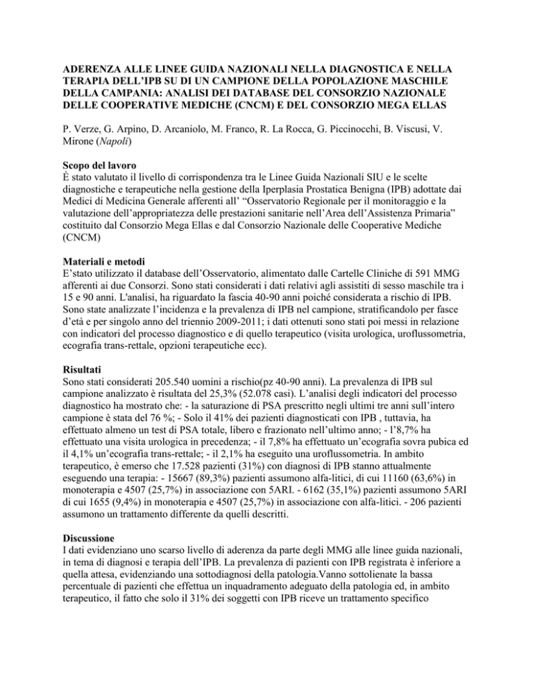 ADERENZA ALLE LINEE GUIDA NAZIONALI NELLA DIAGNOSTICA E NELLA TERAPIA DELL’IPB SU DI UN CAMPIONE DELLA POPOLAZIONE MASCHILE DELLA CAMPANIA: ANALISI DEI DATABASE DEL CONSORZIO NAZIONALE DELLE COOPERATIVE MEDICHE (CNCM) E DEL CONSORZIO MEGA ELLAS P. Verze, G. Arpino, D. Arcaniolo, M. Franco, R. La Rocca, G. Piccinocchi, B. Viscusi, V. Mirone (Napoli) Scopo del lavoro È stato valutato il livello di corrispondenza tra le Linee Guida Nazionali SIU e le scelte diagnostiche e terapeutiche nella gestione della Iperplasia Prostatica Benigna (IPB) adottate dai Medici di Medicina Generale afferenti all’ “Osservatorio Regionale per il monitoraggio e la valutazione dell’appropriatezza delle prestazioni sanitarie nell’Area dell’Assistenza Primaria” costituito dal Consorzio Mega Ellas e dal Consorzio Nazionale delle Cooperative Mediche (CNCM) Materiali e metodi E’stato utilizzato il database dell’Osservatorio, alimentato dalle Cartelle Cliniche di 591 MMG afferenti ai due Consorzi. Sono stati considerati i dati relativi agli assistiti di sesso maschile tra i 15 e 90 anni. L'analisi, ha riguardato la fascia 40-90 anni poiché considerata a rischio di IPB. Sono state analizzate l’incidenza e la prevalenza di IPB nel campione, stratificandolo per fasce d’età e per singolo anno del triennio 2009-2011; i dati ottenuti sono stati poi messi in relazione con indicatori del processo diagnostico e di quello terapeutico (visita urologica, uroflussometria, ecografia trans-rettale, opzioni terapeutiche ecc). Risultati Sono stati considerati 205.540 uomini a rischio(pz 40-90 anni). La prevalenza di IPB sul campione analizzato è risultata del 25,3% (52.078 casi). L’analisi degli indicatori del processo diagnostico ha mostrato che: - la saturazione di PSA prescritto negli ultimi tre anni sull’intero campione è stata del 76 %; - Solo il 41% dei pazienti diagnosticati con IPB , tuttavia, ha effettuato almeno un test di PSA totale, libero e frazionato nell’ultimo anno; - l’8,7% ha effettuato una visita urologica in precedenza; - il 7,8% ha effettuato un’ecografia sovra pubica ed il 4,1% un’ecografia trans-rettale; - il 2,1% ha eseguito una uroflussometria. In ambito terapeutico, è emerso che 17.528 pazienti (31%) con diagnosi di IPB stanno attualmente eseguendo una terapia: - 15667 (89,3%) pazienti assumono alfa-litici, di cui 11160 (63,6%) in monoterapia e 4507 (25,7%) in associazione con 5ARI. - 6162 (35,1%) pazienti assumono 5ARI di cui 1655 (9,4%) in monoterapia e 4507 (25,7%) in associazione con alfa-litici. - 206 pazienti assumono un trattamento differente da quelli descritti. Discussione I dati evidenziano uno scarso livello di aderenza da parte degli MMG alle linee guida nazionali, in tema di diagnosi e terapia dell’IPB. La prevalenza di pazienti con IPB registrata è inferiore a quella attesa, evidenziando una sottodiagnosi della patologia.Vanno sottolienate la bassa percentuale di pazienti che effettua un inquadramento adeguato della patologia ed, in ambito terapeutico, il fatto che solo il 31% dei soggetti con IPB riceve un trattamento specifico Conclusioni Il basso livello di aderenza da parte dei MMG all’iter diagnostico-terapeutico dell’IPB suggerito dalle linee guida nazionali suggerisce la necessità di effettuare programmi formativi destinati ai MMG, al fine di incrementare il loro livello di competenza clinica nella gestione del paziente con IPB