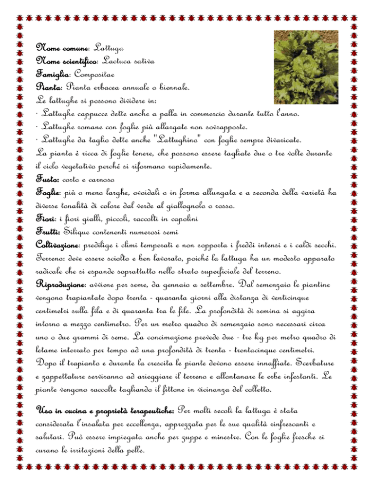 Nome comune: Lattuga Nome scientifico: Lactuca sativa Famiglia: Compositae Pianta: Pianta erbacea annuale o biennale. Le lattughe si possono dividere in: · Lattughe cappucce dette anche a palla in commercio durante tutto l'anno. · Lattughe romane con foglie più allargate non sovrapposte. · Lattughe da taglio dette anche "Lattughino" con foglie sempre divaricate. La pianta è ricca di foglie tenere, che possono essere tagliate due o tre volte durante il ciclo vegetativo perché si riformano rapidamente. Fusto: corto e carnoso Foglie: più o meno larghe, ovoidali o in forma allungata e a seconda della varietà ha diverse tonalità di colore dal verde al giallognolo o rosso. Fiori: i fiori gialli, piccoli, raccolti in capolini Frutti: Silique contenenti numerosi semi Coltivazione: predilige i climi temperati e non sopporta i freddi intensi e i caldi secchi. Terreno: deve essere sciolto e ben lavorato, poiché la lattuga ha un modesto apparato radicale che si espande soprattutto nello strato superficiale del terreno. Riproduzione: avviene per seme, da gennaio a settembre. Dal semenzaio le piantine vengono trapiantate dopo trenta - quaranta giorni alla distanza di venticinque centimetri sulla fila e di quaranta tra le file. La profondità di semina si aggira intorno a mezzo centimetro. Per un metro quadro di semenzaio sono necessari circa uno o due grammi di seme. La concimazione prevede due - tre kg per metro quadro di letame interrato per tempo ad una profondità di trenta - trentacinque centimetri. Dopo il trapianto e durante la crescita le piante devono essere innaffiate. Scerbature e zappettature serviranno ad arieggiare il terreno e allontanare le erbe infestanti. Le piante vengono raccolte tagliando il fittone in vicinanza del colletto. Uso in cucina e proprietà terapeutiche: Per molti secoli la lattuga è stata considerata l’insalata per eccellenza, apprezzata per le sue qualità rinfrescanti e salutari. Può essere impiegata anche per zuppe e minestre. Con le foglie fresche si curano le irritazioni della pelle.