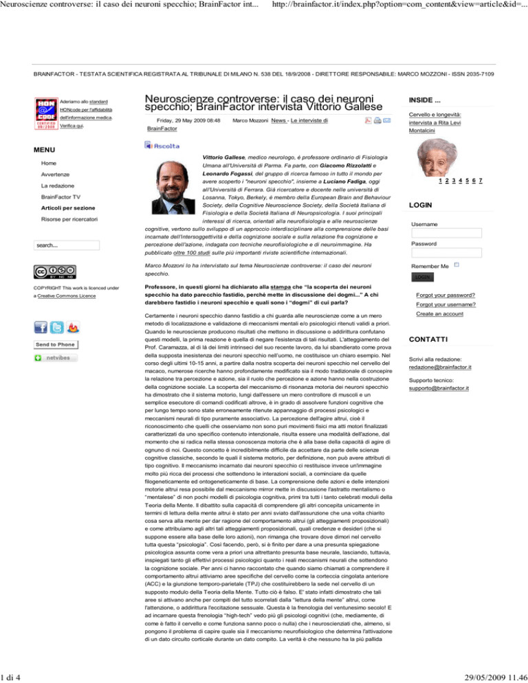 Neuroscienze controverse: il caso dei neuroni specchio; BrainFactor int... 1 di 4 http://brainfactor.it/index.php?option=com_content&view=article&id=... BRAINFACTOR - TESTATA SCIENTIFICA REGISTRATA AL TRIBUNALE DI MILANO N. 538 DEL 18/9/2008 - DIRETTORE RESPONSABILE: MARCO MOZZONI - ISSN 2035-7109 Aderiamo allo standard HONcode per l'affidabilità dell'informazione medica. Verifica qui. Neuroscienze controverse: il caso dei neuroni specchio; BrainFactor intervista Vittorio Gallese Friday, 29 May 2009 08:48 Marco Mozzoni News - Le interviste di BrainFactor INSIDE ... Cervello e longevità: intervista a Rita Levi Montalcini MENU Vittorio Gallese, medico neurologo, è professore ordinario di Fisiologia Home Umana all'Università di Parma. Fa parte, con Giacomo Rizzolatti e Avvertenze Leonardo Fogassi, del gruppo di ricerca famoso in tutto il mondo per BrainFactor TV Society, della Cognitive Neuroscience Society, della Società Italiana di Fisiologia e della Società Italiana di Neuropsicologia. I suoi principali interessi di ricerca, orientati alla neurofisiologia e alle neuroscienze Articoli per sezione Risorse per ricercatori search... cognitive, vertono sullo sviluppo di un approccio interdisciplinare alla comprensione delle basi incarnate dell'intersoggettività e della cognizione sociale e sulla relazione fra cognizione e percezione dell'azione, indagata con tecniche neurofisiologiche e di neuroimmagine. Ha pubblicato oltre 100 studi sulle più importanti riviste scientifiche internazionali. Marco Mozzoni lo ha intervistato sul tema Neuroscienze controverse: il caso dei neuroni COPYRIGHT This work is licenced under a Creative Commons Licence 1 2 3 4 5 6 7 avere scoperto i "neuroni specchio", insieme a Luciano Fadiga, oggi all'Università di Ferrara. Già ricercatore e docente nelle università di Losanna, Tokyo, Berkely, è membro della European Brain and Behaviour La redazione LOGIN Username Password Remember Me specchio. LOGIN Professore, in questi giorni ha dichiarato alla stampa che “la scoperta dei neuroni specchio ha dato parecchio fastidio, perché mette in discussione dei dogmi...” A chi Forgot your password? darebbero fastidio i neuroni specchio e quali sono i “dogmi” di cui parla? Forgot your username? Certamente i neuroni specchio danno fastidio a chi guarda alle neuroscienze come a un mero Create an account metodo di localizzazione e validazione di meccanismi mentali e/o psicologici ritenuti validi a priori. Quando le neuroscienze producono risultati che mettono in discussione o addirittura confutano questi modelli, la prima reazione è quella di negare l'esistenza di tali risultati. L'atteggiamento del Prof. Caramazza, al di là dei limiti intrinseci del suo recente lavoro, da lui sbandierato come prova CONTATTI della supposta inesistenza dei neuroni specchio nell’uomo, ne costituisce un chiaro esempio. Nel corso degli ultimi 10-15 anni, a partire dalla nostra scoperta dei neuroni specchio nel cervello del Scrivi alla redazione: macaco, numerose ricerche hanno profondamente modificato sia il modo tradizionale di concepire la relazione tra percezione e azione, sia il ruolo che percezione e azione hanno nella costruzione della cognizione sociale. La scoperta del meccanismo di risonanza motoria dei neuroni specchio ha dimostrato che il sistema motorio, lungi dall'essere un mero controllore di muscoli e un Supporto tecnico: [email protected] [email protected] semplice esecutore di comandi codificati altrove, è in grado di assolvere funzioni cognitive che per lungo tempo sono state erroneamente ritenute appannaggio di processi psicologici e meccanismi neurali di tipo puramente associativo. La percezione dell'agire altrui, cioè il riconoscimento che quelli che osserviamo non sono puri movimenti fisici ma atti motori finalizzati caratterizzati da uno specifico contenuto intenzionale, risulta essere una modalità dell'azione, dal momento che si radica nella stessa conoscenza motoria che è alla base della capacità di agire di ognuno di noi. Questo concetto è incredibilmente difficile da accettare da parte delle scienze cognitive classiche, secondo le quali il sistema motorio, per definizione, non può avere attributi di tipo cognitivo. Il meccanismo incarnato dai neuroni specchio ci restituisce invece un'immagine molto più ricca dei processi che sottendono le interazioni sociali, a cominciare da quelle filogeneticamente ed ontogeneticamente di base. La comprensione delle azioni e delle intenzioni motorie altrui resa possibile dal meccanismo mirror mette in discussione l'astratto mentalismo o “mentalese” di non pochi modelli di psicologia cognitiva, primi tra tutti i tanto celebrati moduli della Teoria della Mente. Il dibattito sulla capacità di comprendere gli altri concepita unicamente in termini di lettura della mente altrui è stato per anni sviato dall'assunzione che una volta chiarito cosa serva alla mente per dar ragione del comportamento altrui (gli atteggiamenti proposizionali) e come attribuiamo agli altri tali atteggiamenti proposizionali, quali credenze e desideri (che si suppone essere alla base delle loro azioni), non rimanga che trovare dove dimori nel cervello tutta questa “psicologia”. Così facendo, però, si è finito per dare a una presunta spiegazione psicologica assunta come vera a priori una altrettanto presunta base neurale, lasciando, tuttavia, inspiegati tanto gli effettivi processi psicologici quanto i reali meccanismi neurali che sottendono la cognizione sociale. Per anni ci hanno raccontato che quando siamo chiamati a comprendere il comportamento altrui attiviamo aree specifiche del cervello come la corteccia cingolata anteriore (ACC) e la giunzione temporo-parietale (TPJ) che costituirebbero la sede nel cervello di un supposto modulo della Teoria della Mente. Tutto ciò è falso. E' stato infatti dimostrato che tali aree si attivano anche per compiti del tutto scorrelati dalla “lettura della mente” altrui, come l'attenzione,