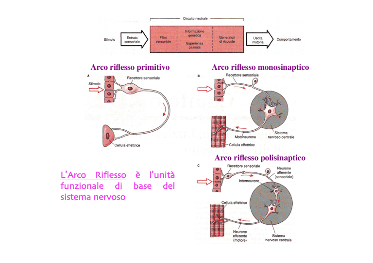 Arco riflesso primitivo Arco riflesso monosinaptico Arco riflesso polisinaptico L’Arco Riflesso è l’unità funzionale di base del sistema nervoso Reti nervose Il sistema nervoso ad organizzazione anatomica più semplice: favorisce la conduzione unidirezionale degli impulsi nervosi Celenterato: Aurelia aurita Un progresso notevole nell’evoluzione del sistema nervoso è stata l’organizzazione dei corpi cellulari neuronali in gangli Hirudo medicinalis Anellide (sanguisuga) Aplysia californica Mollusco (lumaca di mare) Cervello (superganglio) Corda nervosa ventrale Tipica organizzazione segmentale del sistema nervoso di molti invertebrati (caratteristica di anellidi ed artropodi) connettivi Tronchi nervosi periferici (fibre sia sensitive che motorie) Principi dell’evoluzione del sistema nervoso In tutti gli organismi il SN si basa su un unico tipo di cellula: il neurone L’evoluzione del SN si è realizzata attraverso l’elaborazione di un modulo funzionale fondamentale: l’arco riflesso L’evoluzione del SN è stata caratterizzata dalla tendenza a compattare i neuroni Gli organismi complessi possiedono un numero di neuroni maggiore di quello degli organismi più semplici Nel corso dell’evoluzione, il SN diventa sempre più complesso, con nuove strutture che si sovrappongono a quelle più arcaiche Le dimensioni delle singole aree del cervello sono in genere proporzionali alla rilevanza fisiologica delle entrate sensoriali elaborate o delle uscite motorie Organizzazione del sistema nervoso dei vertebrati Contiene i corpi cellulari della maggior parte dei neuroni, inclusi quelli degli interneuroni e della maggior parte dei neuroni che innervano i muscoli Costituito da: • Gangli contenenti i corpi cellulari di neuroni del sistema nervoso autonomo • Gangli contenenti i corpi cellulari dei neuroni sensoriali • Nervi: fasci di assoni di neuroni sensoriali e motori Parti principali del sistema nervoso centrale • Elevata cefalizzazione • Conservazione dell’organizzazione segmentale di base (midollo spinale, organizzazione nervi cranici) Segmentazione del midollo spinale Suddiviso in 4 porzioni principali: Cervicale Toracica Lombare Sacrale Sede di connessioni riflesse Arco riflesso polisinaptico Riflessi somatici Riflessi autonomi o viscerali Riflessi motori monosinaptici e polisinaptici Le risposte riflesse possono essere: a Divergenti Convergenti b utilizzare meccanismi a retroazione positiva o negativa Motoneurone Sinapsi glicinergica Assone motorio Stimolo Cellula di Renshaw Assoni collaterali Sinapsi colinergica Muscolo c avere una componente anticipatoria (anticipazione di uno stimolo) Riflesso meccanico Riflesso anticipato Dermatomeri regioni del sensoriali della superficie del corpo innervate dai nervi spinali Propriocettori Fusi neuromuscolari (Rivelano variazioni della lunghezza muscolare) Propriocettori Organi tendinei del Golgi (Rivelano variazioni della tensione muscolare) Fibre sensoriali Fibre sensoriali Meccanocettori articolari: si trovano nelle capsule e nei legamenti di ogni articolazione. Attivati dalle distorsioni meccaniche che accompagnano i cambiamenti di posizione relativa dei segmenti ossei Dettaglio di un fuso neuromuscolare da 8 a 10 fibre muscolari intrafusali specializzate, Lunghe 1-2 mm Tono muscolare Riflesso di stiramento (riflesso miotatico) Meccanismo a retroazione positiva Controlla e mantiene stabile la lunghezza muscolare Co-attivazione alfa-gamma La co-attivazione alfa-gamma è importante per mantenere il fuso neuromuscolare sempre attivo Dimostrazione sperimentale della co-attivazione alfa-gamma Riflesso patellare Riflesso flessorio Riflesso di estensione crociata Organi tendinei del Golgi Fibre sensoriali • Rilevano cambiamenti di tensione dei muscoli • Determinano un riflesso di rilasciamento (riflesso miotatico inverso) • Relativamente insensibili allo stiramento passivo Riflesso miotatico inverso Meccanismo a retroazione negativa Controlla e mantiene stabile la tensione muscolare
