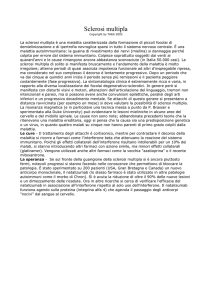 ARRIVA IN ITALIA IL DIMETILFUMARATO FARMACO ORALE PER LA SCLEROSI MULTIPLA RECIDIVANTE REMITTENTE 10 marzo 2015 Una nuova arma contro la sclerosi multipla è disponibile per gli oltre 70 mila italiani che convivono con questa malattia neurologica, la più comune tra i giovani adulti, che nella maggior parte dei casi scoprono la malattia tra i 20 e i 40 anni, con un rapporto donna:uomo di circa 2,5:1. Lo scorso 24 gennaio, l’Agenzia Italiana del Farmaco ha approvato la rimborsabilità della nuova terapia dimetilfumarato per il trattamento della Sclerosi Multipla Recidivante Remittente (SMRR), la più comune forma di sclerosi multipla che colpisce circa l’80-90% dei pazienti. L’Aifa lo ha inserito in classe A. Dimetilfumarato è una terapia orale indicata per il trattamento di pazienti adulti con sclerosi multipla recidivante-remittente, che rappresenta la forma più comune di sclerosi multipla. Attualmente dimetilfumarato è approvato negli Stati Uniti, nell’Unione Europea, in Canada e in Australia. Grazie a un solido programma di studi clinici e ai lanci commerciali iniziati negli Stati Uniti a marzo 2013, sono stati trattati con dimetilfumarato più di 135.000 pazienti in tutto il mondo. Gli studi hanno dimostrato l’efficacia del nuovo farmaco nel ridurre le recidive della malattia, la progressione della disabilità e le lesioni cerebrali dovute alla patologia, mantenendo un profilo di sicurezza e tollerabilità favorevole. Gli eventi avversi più frequenti associati a dimetilfumarato sono stati rossore con sensazione di calore al viso e al collo ed eventi gastrointestinali. Tra gli altri effetti indesiderati rientrano una riduzione della conta linfocitaria media nel primo anno di trattamento, con una successiva fase di stabilizzazione. Sebbene non si conosca l’esatto meccanismo di azione di dimetilfumarato, si ritiene che questo farmaco offra un nuovo approccio al trattamento della SM grazie all’attivazione e al potenziamento della via del fattore Nrf2. Questa via fornisce alle cellule dell’organismo una difesa fisiologica dall’infiammazione e dallo stress ossidativo causato da condizioni patologiche. “I numerosi dati clinici disponibili hanno dimostrato l’efficacia del trattamento orale con dimetilfumarato nel ridurre la frequenza delle recidive e la progressione della disabilità, due risultati importanti che hanno un impatto notevole sulla storia di malattia e sulla qualità di vita dei pazienti. – spiega Giancarlo Comi, Direttore dell’Istituto di Neurologia Sperimentale e del Dipartimento Neurologico dell’Ospedale San Raffaele, Università Vita-Salute, Milano – Un aspetto innovativo è, oltre all’efficacia, il buon profilo di sicurezza e tollerabilità del nuovo farmaco, che ne rendono molto agevoli l’utilizzo e il monitoraggio. L’introduzione di questa nuova molecola rappresenta quindi un’opportunità per molti pazienti”. Continua Carlo Pozzilli, Ordinario di Neurologia presso l'Università La Sapienza di Roma: “La sclerosi multipla comporta un’alterazione della guaina mielinica che compromette la capacità delle fibre nervose di condurre gli impulsi elettrici che regolano le varie funzioni dell’organismo. Le lesioni della guaina mielinica hanno un’iniziale natura infiammatoria, che può evolvere in una fase cronica con perdita di tessuto nervoso e danno irreversibile. Si ritiene che il nuovo farmaco dimetilfumarato sia in grado di attivare un particolare meccanismo di difesa dell’organismo, la via del fattore Nrf-2, che permette di contrastare l’infiammazione e lo stress ossidativo causato dalla malattia”. “Il nuovo farmaco dimetilfumarato – prosegue Pozzilli- si inserisce nello scenario terapeutico come terapia innovativa che può essere utilizzata in diverse fasi della malattia. Infatti i dati disponibili ci permettono di affermare che tale farmaco è utile nei pazienti all’esordio della malattia, così come in pazienti che non tollerano o risultano non rispondenti alle terapie iniettive a oggi maggiormente utilizzate nella Sclerosi Multipla quali l’interferone beta o glatiramer acetato. Il farmaco orale dimetilfumarato ha dimostrato infatti negli studi clinici registrativi a oggi eseguiti e nella esperienza clinica ormai maturata da più di due anni negli Stati Uniti e di almeno un anno in altri paesi d’Europa, come ad esempio la Germania, una buona combinazione di efficacia, sicurezza e tollerabilità che quindi lo pone oggi in una posizione di assoluto rilievo nella terapia attuale della Sclerosi Multipla. “ L’approvazione europea si basa sui dati di un vasto programma di sviluppo clinico che ha incluso due studi di Fase 3 globali, DEFINE e CONFIRM, che hanno coinvolto oltre 2.600 pazienti SMRR, così come uno studio di estensione in corso in cui alcuni pazienti sono stati seguiti per più di quattro anni. Nello studio DEFINE, dimetil fumarato, somministrato due volte al giorno, ha ridotto significativamente la percentuale di pazienti con recidiva del 49% (p<0,0001), il tasso annualizzato di ricadute (ARR) del 53% (p<0,0001) e la progressione della disabilità, mantenuta a 12 settimane valutata con la scala EDSS (Expanded Disability Status Scale), del 38% (p=0,0050) a due anni rispetto al placebo. Nello studio CONFIRM, dimetil fumarato, somministrato due volte al giorno, ha significativamente ridotto il tasso annualizzato di ricadute (ARR) del 44% (p<0,0001) e la percentuale di pazienti con ricadute del 34% (p<0,0001) rispetto al placebo a due anni. Sebbene non abbia raggiunto la significatività statistica, dimetil fumarato ha mostrato una riduzione del 21% della progressione della disabilità mantenuta a 12 settimane nello studio CONFIRM. Entrambi gli studi hanno mostrato che dimetil fumarato ha significativamente ridotto il carico lesionale cerebrale rispetto al placebo, come dimostrato dalle indagini di risonanza magnetica (RMI). I notevoli progressi compiuti nella conoscenza di questa patologia neurolog