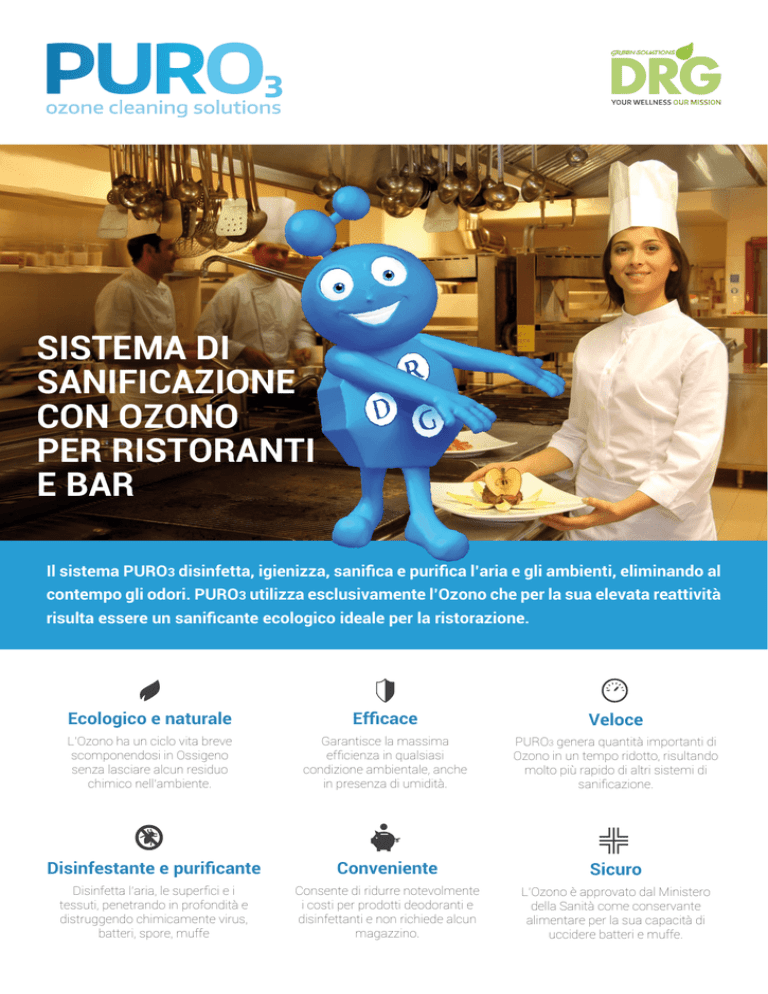 SISTEMA DI SANIFICAZIONE CON OZONO PER RISTORANTI E BAR Il sistema PURO3 disinfetta, igienizza, sanifica e purifica l’aria e gli ambienti, eliminando al contempo gli odori. PURO3 utilizza esclusivamente l’Ozono che per la sua elevata reattività risulta essere un sanificante ecologico ideale per la ristorazione. Ecologico e naturale Efficace Veloce L’Ozono ha un ciclo vita breve scomponendosi in Ossigeno senza lasciare alcun residuo chimico nell’ambiente. Garantisce la massima efficienza in qualsiasi condizione ambientale, anche in presenza di umidità. PURO3 genera quantità importanti di Ozono in un tempo ridotto, risultando molto più rapido di altri sistemi di sanificazione. Disinfestante e purificante Conveniente Sicuro Disinfetta l’aria, le superfici e i tessuti, penetrando in profondità e distruggendo chimicamente virus, batteri, spore, muffe Consente di ridurre notevolmente i costi per prodotti deodoranti e disinfettanti e non richiede alcun magazzino. L’Ozono è approvato dal Ministero della Sanità come conservante alimentare per la sua capacità di uccidere batteri e muffe. COME FUNZIONA PURO3 Il sistema PURO3 si basa su un dispositivo generatore che diffonde nell’aria Ozono. L’Ozono è uno degli ossidanti più vigorosi in natura: una molecola di Ozono si lega rapidamente ad ogni componente con cui entra in contatto. Questo permette il trattamento per ossidazione delle sostanze organiche ed inorganiche (causa anche dei cattivi odori) così come i microorganismi, virus, batteri e funghi. Il risultato è una radicale disinfezione a impatto ambientale zero. Il sistema PURO3: • elimina germi e cattivi odori; • degrada composti organici non biodegradabili; • non è irritante per la pelle; • non danneggia mobili, pareti o tessuti; • non lascia residui; • non è combustibile. Essendo più pesante dell’aria, l’Ozono si insinua anche nelle cavità e nelle tane dove alloggiano roditori e insetti infestanti evitando, generalmente, il loro ritorno in quanto l’ambiente diventa per loro inospitale. UN SISTEMA SICURO La sua sicurezza è certificata anche dal Ministero della Sanità: • come conservante alimentare per la sua capacità di uccidere batteri e muffe; • come “Presidio Naturale per la Sterilizzazione di Ambienti” (prot. n.24482 del 07.1996). IDEALE PER RISTORANTI E BAR Nella ristorazione è obbligatorio e indispensabile assicurare la massima igenizzazione, secondo la normativa CE 852/2004 H.A.C.C.P. e il D.Lgs. 193/2006. PURO3 garantisce sanificazione, igenizzazione e purificazione dei locali e delle superfici di lavoro dove si manipolano cibi. Oltre a questo, le cucine ed i luoghi confinanti beneficiano dell’eliminazione dei cattivi odori che vengono generati nell’arco della giornata. Nei bar, la contaminazione generata dal flusso costante dei frequentatori sulle superfici (bancone, tavolini, sedie, ecc.) viene totalmente debellata mediante la sanificazione operata dal sistema PURO3, riconosciuto a livello mondiale quale Presidio Naturale per la decontaminazione microbiologica delle superfici in ambienti confinati, senza lasciare alcun residuo chimico. UNA SOLUZIONE VINCENTE PURO3 viene fornito in modalità di noleggio, con costi che variano in funzione della durata del contratto e della tipologia di generatore. Il servizio comprende sempre • studio per la migliore soluzione alle vostre esigenze; • fornitura del dispositivo portatile della dimensione ideale per voi; • manutenzione ordinaria e straordinaria; • utilizzo di ricambi originali e garantiti. PURO3M200 PURO3F200 PURO3M500 PURO3FX Tensione alimentazione 230 Vac; 50Hz 230 Vac; 50Hz 230 Vac; 50Hz 230 Vac; 50Hz Potenza 150W 150W 400W Custom* Portata 300m3/h. 300m3/h. 450m3/h. Custom* Generazione di Ozono 7.500mg/h. 7.500mg/h. 12.000mg/h. Custom* Dimensioni H x L x P 33 x 20.5 x 20.5 cm 60 x 40 x 25 cm 100x 50 x 40 cm Custom* Peso Netto 6kg 10kg 34kg Custom* Volume trattabile fino a 200 m3 fino a 200 m3 fino a 500 m3 Custom* *Valori dipendenti dal dimensionamento del modello Come agisce l’Ozono? L’Ozono è uno degli ossidanti più vigorosi in natura. Può essere impiegato per legarsi ai composti dissolti per ossidazione, dove il radicale di Ossigeno supplementare in una molecola di Ozono si lega rapidamente ad ogni componente con cui entra in contatto. Questo per l’instabilità dell’Ozono e la sua propensione a ritornare alla forma originale di ossigeno, riducendo l’impatto ambientale a zero. Quanto è sicuro l’Ozono? L’Ozono è sicuro e rispettoso dell’ambiente. Non è combustibile, né cancerogeno, né irritante per la pelle. Non danneggia mobili, pareti o tessuti e non lascia residui. L’Ozono non danneggia i cibi ed è approvato dal Ministero della Sanità come conservante alimentare. L’Ozono è nocivo per qualsiasi specie di microorganismo: proprio per questo risulta essere così efficace nei confronti di batteri, virus e muffe. www.purotre.it DRG è un’azienda Italiana specializzata nello sviluppo di sistemi per la purificazione dell’aria all’avanguardia. Studiamo le migliori tecnologie, realizziamo soluzioni reali e le mettiamo a disposizione di tutti. DRG Green Solutions S.r.l. Sede legale: Viale Caldara, 8 20122 Milano Sede operativa: Via Copernico, 38 20125 Milano Tel.: +39 02 84102674 [email protected] www.drg-green.com