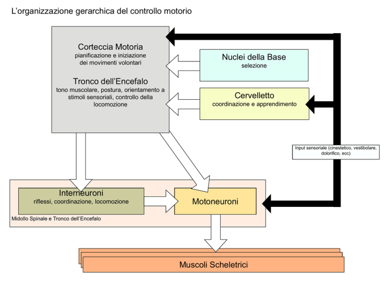 L’organizzazione gerarchica del controllo motorio Corteccia Motoria pianificazione e iniziazione dei movimenti volontari Nuclei della Base selezione Tronco dell’Encefalo tono muscolare, postura, orientamento a stimoli sensoriali, controllo della locomozione Cervelletto coordinazione e apprendimento Input sensoriale (cinestetico, vestibolare, dolorifico, ecc) Interneuroni riflessi, coordinazione, locomozione Motoneuroni Midollo Spinale e Tronco dell’Encefalo Muscoli MuscoliScheletrici Scheletrici Muscoli Scheletrici i Fusi Neuromuscolari Strutture specializzate all’interno dei muscoli, sono i principali recettori cinestetici (importanti anche i recettori dello stiramento cutaneo, i corpuscoli del Ruffini). Forniscono al sistema nervoso centrale due ordini di informazione sullo stato degli arti: Statica: Posizione. Dinamica: Velocità di rotazione. Sono disposti in parallelo con le fibre muscolari normali (extrafusali), accompagnano quindi il muscolo nelle sue variazioni di lunghezza. Due tipi principali di fibre differiscono per le proprietà meccaniche. Fibra a catena di nuclei –nuclei e sarcomeri distribuiti lungo la fibra. Hanno proprietà visco-elastiche uniformi: se stirate l’allungamento si distribuisce subito su tutta la fibra. Fibra a sacco di nuclei –nuclei raggruppati nella zona centrale della fibra, sarcomeri alle estremità. Se stirate si allungano prima nella zona centrale (zona elastica) e poi lentamente riportano l’allungamento sul resto della fibra (zona viscosa ed elastica). gamma MN gamma MN Le afferenze sensoriali di tipo Ia e II hanno risposte diverse a variazioni di lunghezza del fuso. Ia –Risposta dinamica (alla velocità di allungamento del fuso). Dovuta al rapido allungamento elastico della zona centrale delle fibre a sacco di nuclei, seguito da rilassamento quando la tensione si distribuisce al resto della fibra. –Risposta statica (alla lunghezza del fuso). Dovuta all’allungamento delle fibre a catena di nuclei. II –Risposta statica (alla lunghezza del fuso). Dovuta all’allungamento delle fibre a catena di nuclei. Le fibre intrafusali sono innervate da una sottopopolazione di motoneuroni, i motoneuroni gamma. In generale contrazioni di un muscolo evocate dai motoneuroni alfa si accompagnano alla coattivazione dei motoneuroni gamma. Questo mantiene la tensione e capacità di risposta nelle le fibre intrafusali a fronte di accorciamento del muscolo. Inoltre, il livello di attività nei motoneuroni gamma regola la sensibilità delle risposte dei fusi (vedi figura), che può essere così modulata (ad es. durante task motori di maggior precisione). Gli organi tendinei del Golgi Disposti in serie con il muscolo, segnalano la tensione esercitata dal muscolo. Il loro ruolo nella percezione cinestetica è incerto e marginale rispetto ai fusi neuromuscolari. Rispondono molto di più in seguito a contrazioni del muscolo che a stiramento passivo. Decerebrazione e Spinalizzazione come modelli sperimentali La decerebrazione è una sezione completa a livello del mesencefalo. Elimina il controllo e la modulazione dei circuiti spinali da parte delle aree superiori. Compare un aumento del tono muscolare negli estensori degli arti: rigidità da decerebrazione. Associata a questa rigidità si ha una maggiore eccitabilità di alcuni riflessi. La spinalizzazione è una sezione completa a livello basso toracico. Elimina il controllo e la modulazione dei circuti spinali da parte del tronco dell’encefalo ed altre aree superiori. Inizialmente si riducono drasticamente il tono muscolare ed i riflessi, una condizione detta shock spinale. In seguito, una riorganizzazione interna dei circuiti spinali porta ad un ritorno del tono e dei riflessi fino alla spasticità e clono. In entrambe i casi è possibile studiare il ruolo del midollo spinale del tronco dell’encefalo nei riflessi e nella generazione dei movimenti ritmici stereotipati come la locomozione. L’organizzazione somatotopica dei motoneuroni I motoneuroni che innervano un muscolo sono organizzati in un nucleo (o pool) motorio che può estendersi su vari segmenti spinali adiacenti. I nuclei dei muscoli assiali e prossimali sono disposti nella zona mediale delle corna anteriori, mentre quelli dei muscoli distali sono disposti via via più lateralmente. il Riflesso da Stiramento (o Miotatico) Si origina nei fusi neuromuscolari. In risposta allo stiramento di un muscolo: –viene contratto per via monosinaptica lo stesso muscolo ed i suoi sinergisti. –vengono inibiti i muscoli antagonisti tramite un interneurone inibitorio (detto di tipo Ia) interposto tra fibra afferente proveniente dai fusi neuromuscolari ed i motoneuroni (via di-sinaptica). Ha una componente dinamica mediata dalle afferenze Ia ed una statica mediata da entrambe le afferenze Ia e II. La componente statica coinvolge anche circuiti polisinaptici. il Riflesso da Stiramento (o Miotatico) La deafferentazione fa scomparire questo riflesso e diminuire molto il tono muscolare. Il riflesso da stiramento ha notevole importanza nel mantenimento della postura e nella stabilizzazione delle articolazioni durante i movimenti volontari. Costituisce un meccanismo di feedback negativo utile al mantenimento dello stato di allungamento muscolare. E’ modulato a seconda delle necessità facilitando più o meno l’attività dei motoneuroni gamma > quindi il tono delle fibre intrafusali. Test clinici come il riflesso patellare evidenziano patologie a carico del sistema nervoso centrale che coinvolgono l’eccitabilità dei motoneuroni gamma. i riflessi di Retrazione Mediano il rapido allontanamento da uno stimolo nocicettivo della zona del corpo stimolata. Nel caso di stimolo alle zone distali degli arti, porta al reclutamento flessorio di tutte le articolazioni ipsilaterali, accompagnate dall’estensione dell’arto controlaterale per sostenere il peso corporeo e mantenere l’equilibrio. In questo caso prende il nome di Riflesso Flessorio ed Estensorio Cr