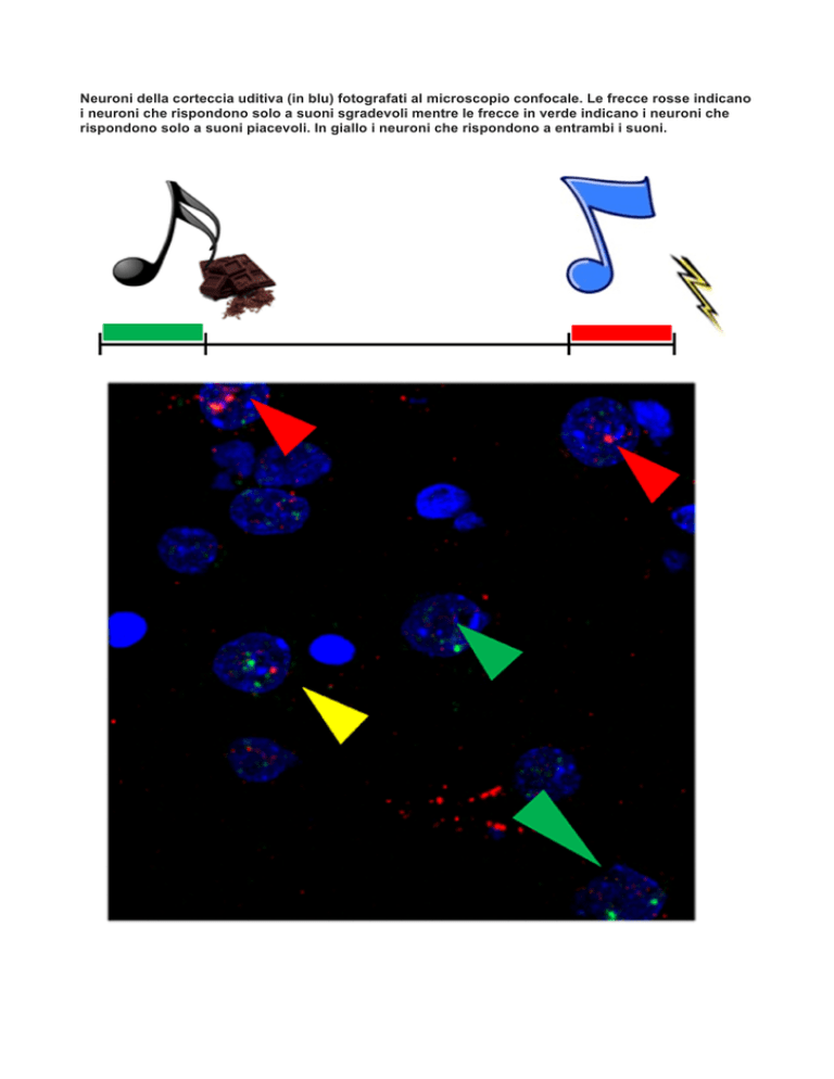 Neuroni della corteccia uditiva (in blu) fotografati al microscopio confocale. Le frecce rosse indicano i neuroni che rispondono solo a suoni sgradevoli mentre le frecce in verde indicano i neuroni che rispondono solo a suoni piacevoli. In giallo i neuroni che rispondono a entrambi i suoni.