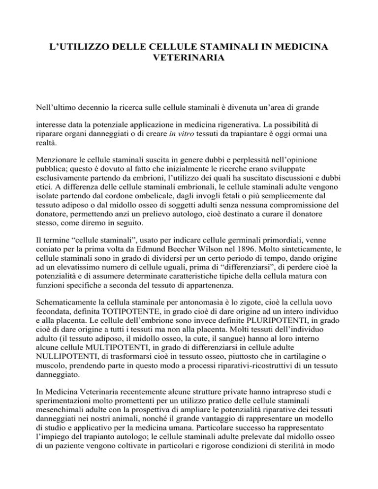 L’UTILIZZO DELLE CELLULE STAMINALI IN MEDICINA VETERINARIA Nell’ultimo decennio la ricerca sulle cellule staminali è divenuta un’area di grande interesse data la potenziale applicazione in medicina rigenerativa. La possibilità di riparare organi danneggiati o di creare in vitro tessuti da trapiantare è oggi ormai una realtà. Menzionare le cellule staminali suscita in genere dubbi e perplessità nell’opinione pubblica; questo è dovuto al fatto che inizialmente le ricerche erano sviluppate esclusivamente partendo da embrioni, l’utilizzo dei quali ha suscitato discussioni e dubbi etici. A differenza delle cellule staminali embrionali, le cellule staminali adulte vengono isolate partendo dal cordone ombelicale, dagli invogli fetali o più semplicemente dal tessuto adiposo o dal midollo osseo di soggetti adulti senza nessuna compromissione del donatore, permettendo anzi un prelievo autologo, cioè destinato a curare il donatore stesso, come diremo in seguito. Il termine “cellule staminali”, usato per indicare cellule germinali primordiali, venne coniato per la prima volta da Edmund Beecher Wilson nel 1896. Molto sinteticamente, le cellule staminali sono in grado di dividersi per un certo periodo di tempo, dando origine ad un elevatissimo numero di cellule uguali, prima di “differenziarsi”, di perdere cioè la potenzialità e di assumere determinate caratteristiche tipiche della cellula matura con funzioni specifiche a seconda del tessuto di appartenenza. Schematicamente la cellula staminale per antonomasia è lo zigote, cioè la cellula uovo fecondata, definita TOTIPOTENTE, in grado cioè di dare origine ad un intero individuo e alla placenta. Le cellule dell’embrione sono invece definite PLURIPOTENTI, in grado cioè di dare origine a tutti i tessuti ma non alla placenta. Molti tessuti dell’individuo adulto (il tessuto adiposo, il midollo osseo, la cute, il sangue) hanno al loro interno alcune cellule MULTIPOTENTI, in grado di differenziarsi in cellule adulte NULLIPOTENTI, di trasformarsi cioè in tessuto osseo, piuttosto che in cartilagine o muscolo, prendendo parte in questo modo a processi riparativi-ricostruttivi di un tessuto danneggiato. In Medicina Veterinaria recentemente alcune strutture private hanno intrapreso studi e sperimentazioni molto promettenti per un utilizzo pratico delle cellule staminali mesenchimali adulte con la prospettiva di ampliare le potenzialità riparative dei tessuti danneggiati nei nostri animali, nonché il grande vantaggio di rappresentare un modello di studio e applicativo per la medicina umana. Particolare successo ha rappresentato l’impiego del trapianto autologo; le cellule staminali adulte prelevate dal midollo osseo di un paziente vengono coltivate in particolari e rigorose condizioni di sterilità in modo da accrescerne il numero e vengono reimpiantate nel paziente stesso. Le cellule così ottenute possono essere inoculate nel distretto di utilizzazione (articolazioni danneggiate, tendini lesionati etc..) oppure iniettate in circolo da cui fattori chimici le indirizzano e “ attirano” nel tessuto danneggiato in riparazione. Le applicazioni variano dall’ortopedia (riparazioni ossee e cartilaginee in caso di gravi artrosi), alla cardiologia (riparazione del cuore infartuato, delle pareti vascolari danneggiate), all’oftalmologia (coadiuvanti nella riparazione corneale) all’epatologia (inoculate nel fegato partecipano alla rigenerazione). Numerose altre applicazioni sono in fase sperimentale avanzata anche in medicina umana: ricostruzione del midollo spinale danneggiato, cura di malattie neurodegenerative (Parkinson, Alzheimer), cura di malattie metaboliche quali il diabete, e molti altri potenziali campi di utilizzo. Lo studio e l’applicazione delle cellule staminali rappresenta una delle più innovative e affascinanti frontiere della medicina, sia umana che veterinaria, rappresentando un comune terreno di confronto dove le due medicine si avvalgono l’una dei progressi dell’altra con l’obiettivo di liberare noi e i nostri amici animali da malattie che spesso ci trovano impotenti.
